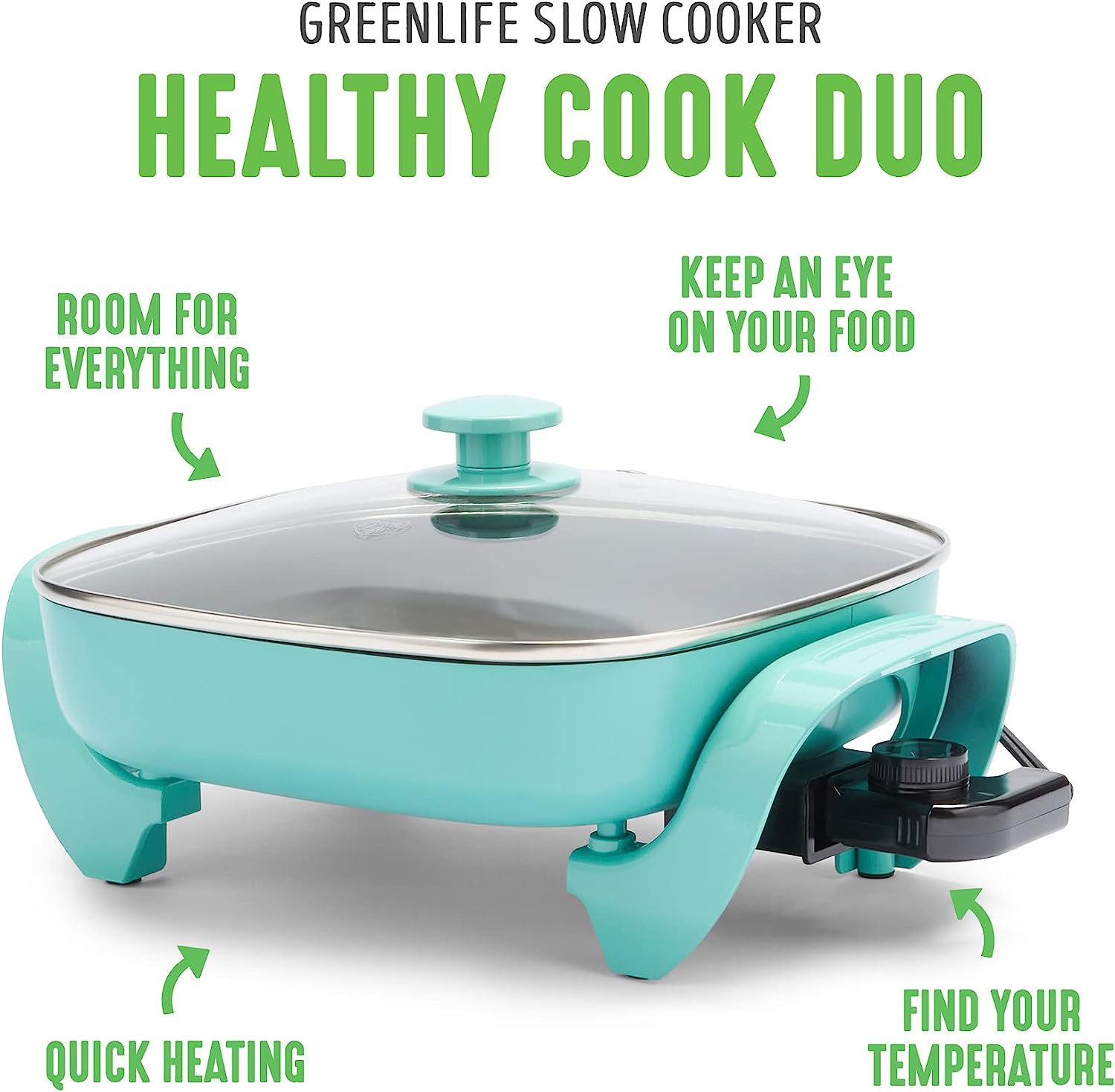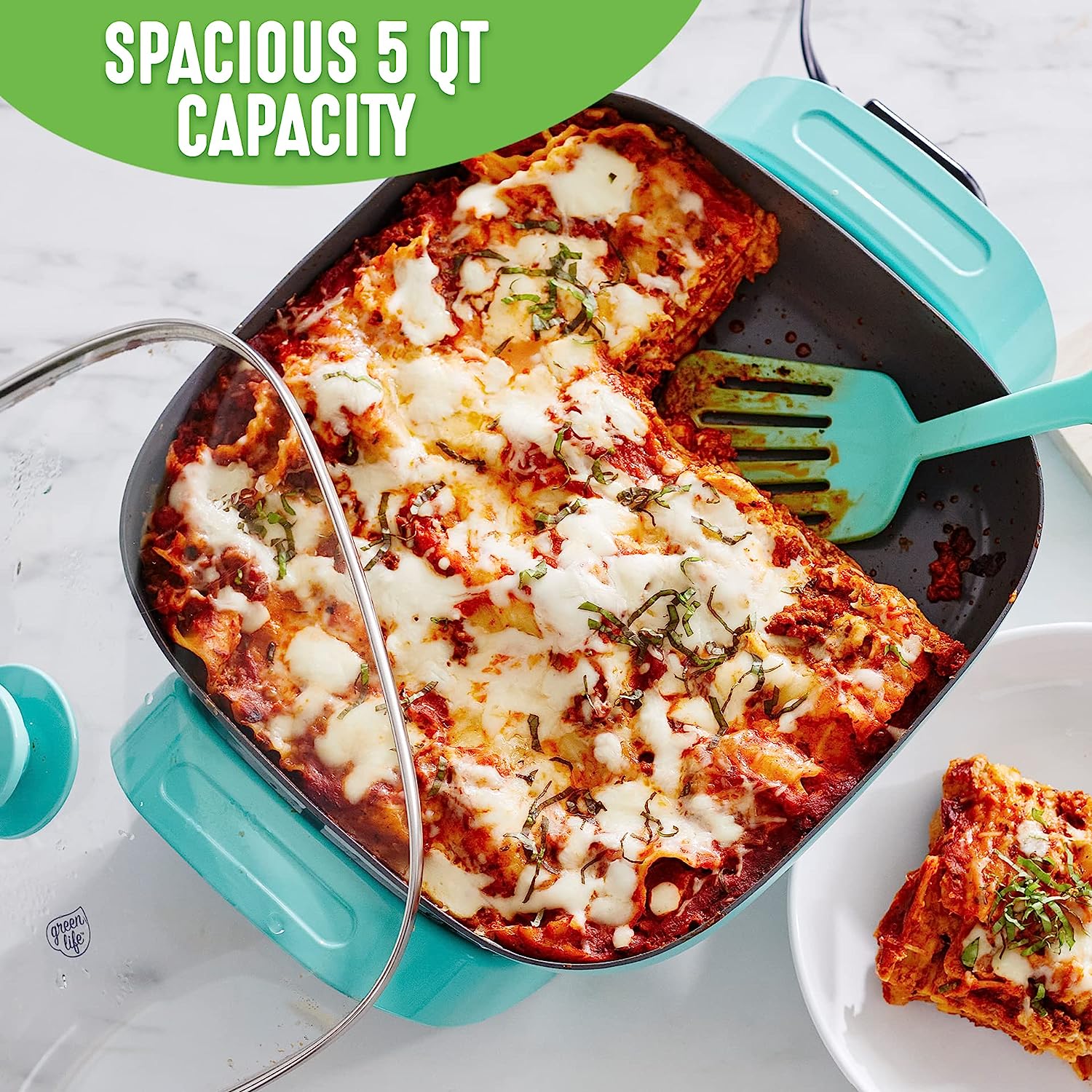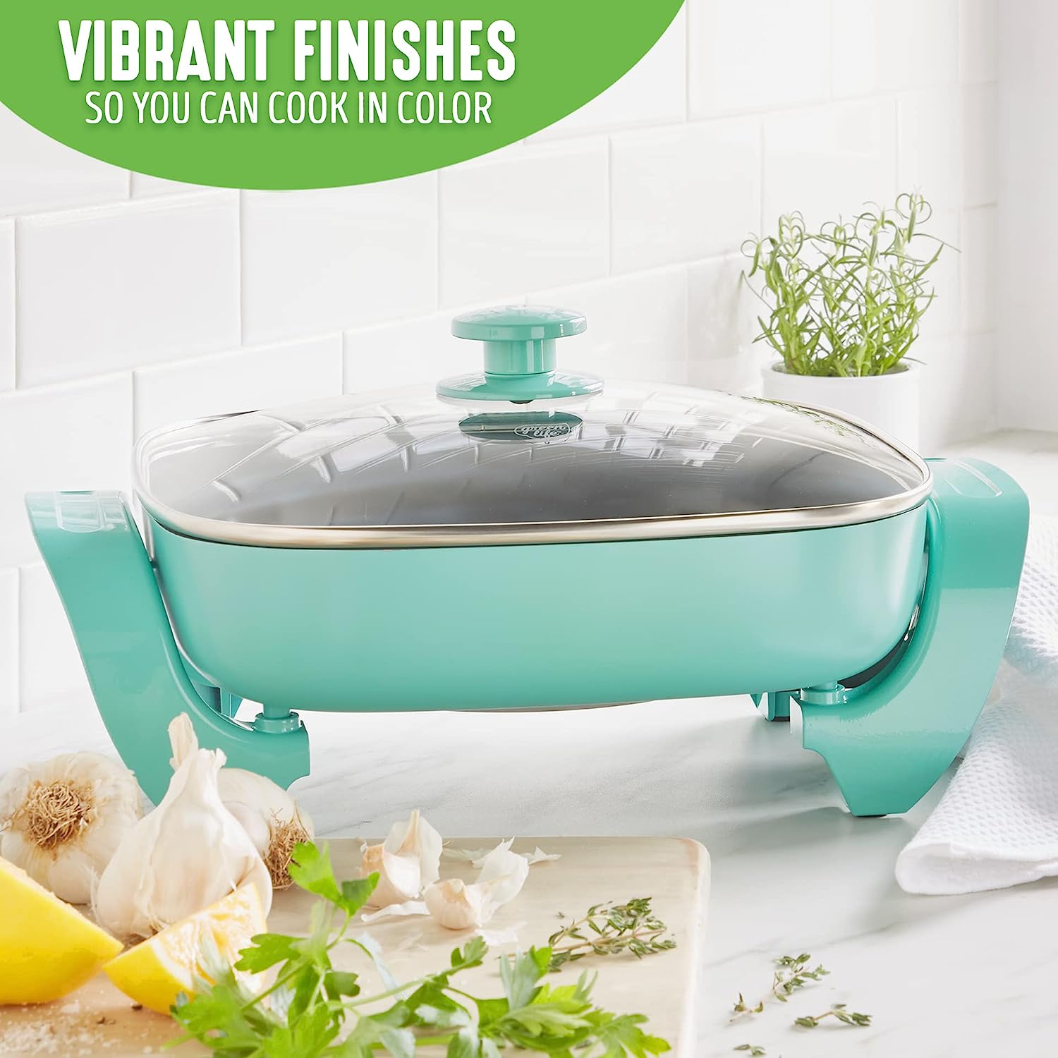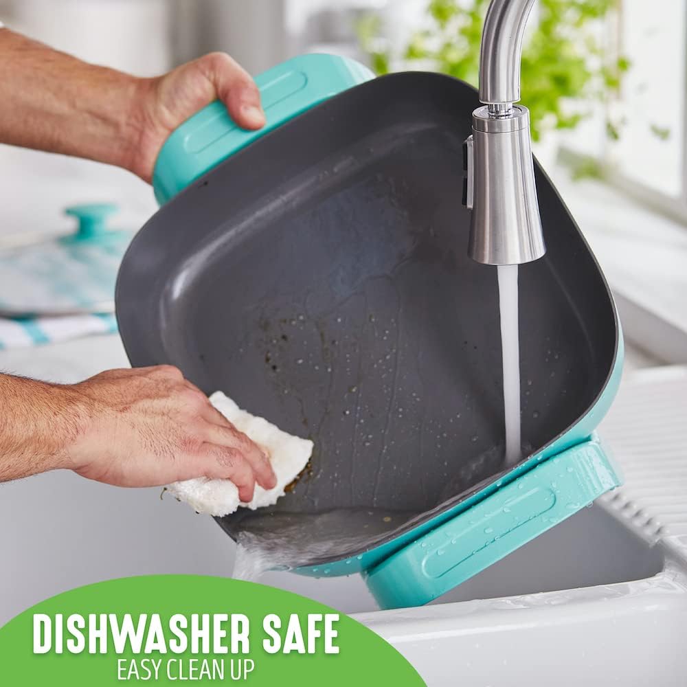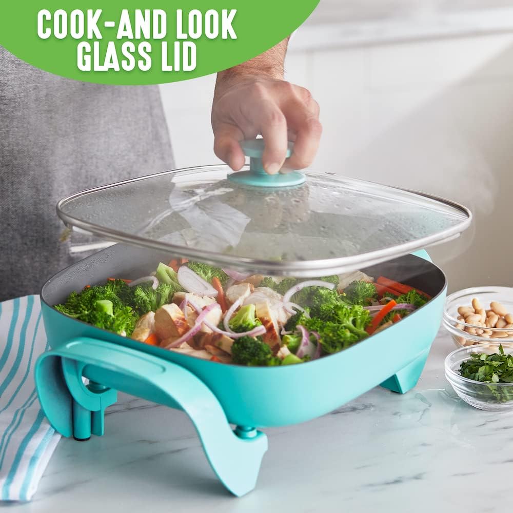 GreenLife Healthy Ceramic Nonstick. 12″ 5QT Square Electric Skillet with Glass Lid. Dishwasher Safe. Adjustable Temperature Control. PFAS-Free. Turquoise