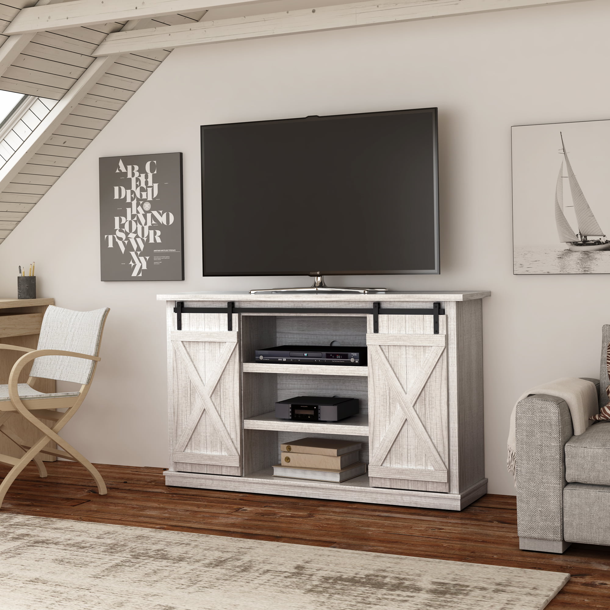 Twin Star Home Terryville Barn Door TV Stand for TVs up to 60″. Old White
