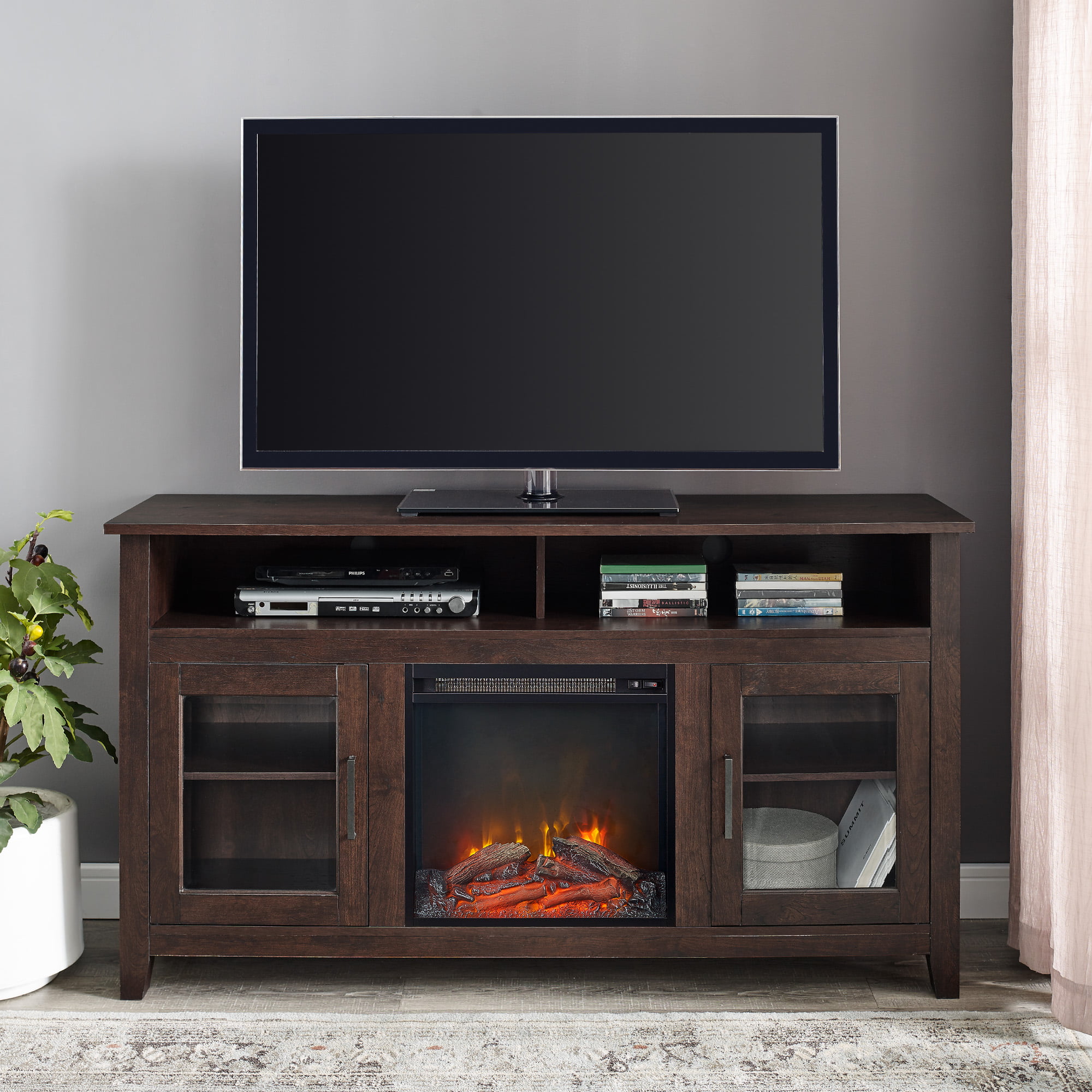 Woven Paths Highboy 2 Door Electric Fireplace TV Stand for TVs up to 65″. Brown