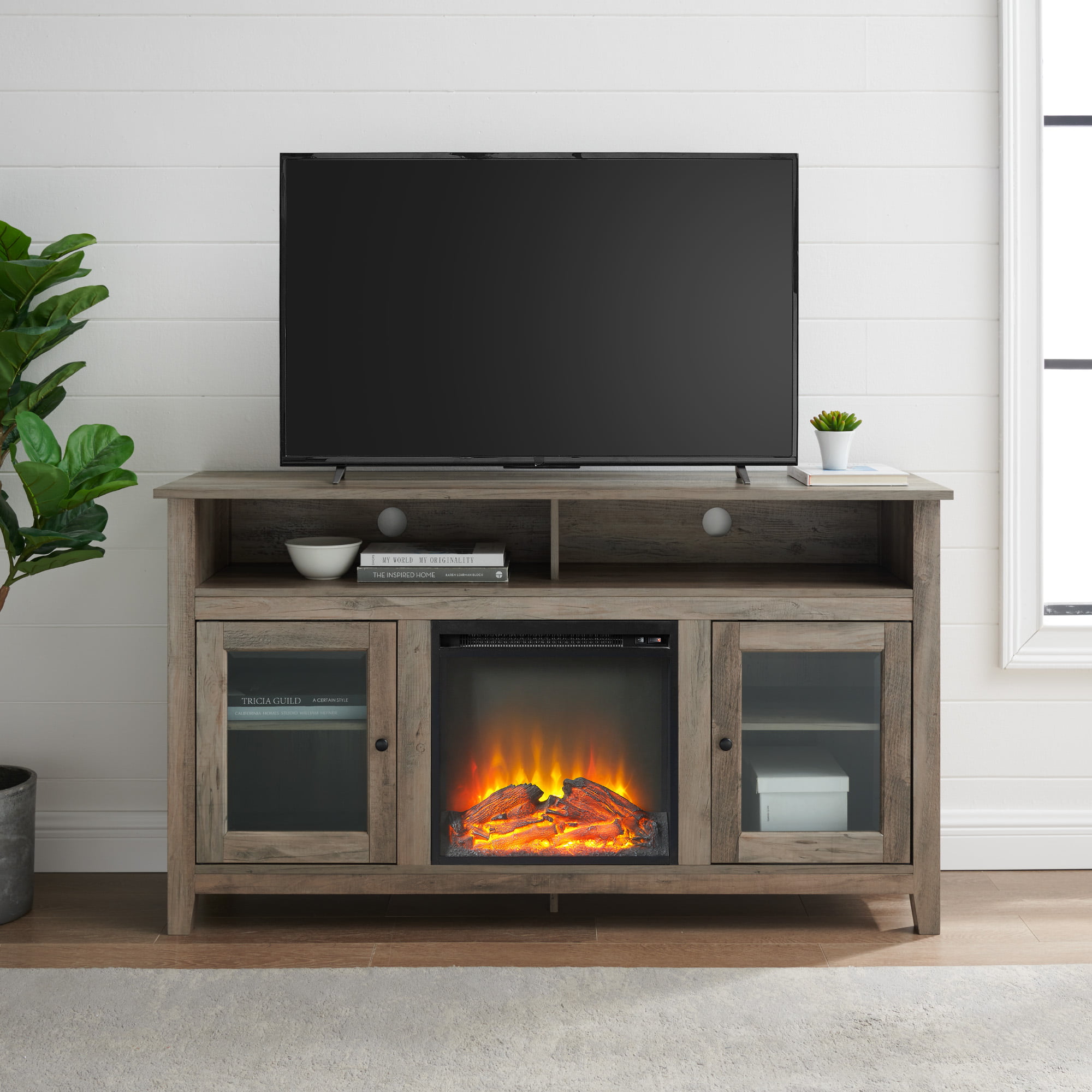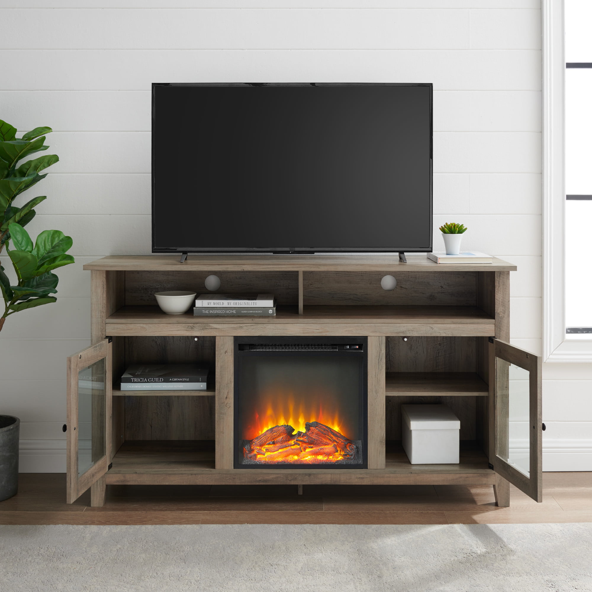 Woven Paths Highboy 2 Door Electric Fireplace TV Stand for TVs up to 65″. Grey Wash