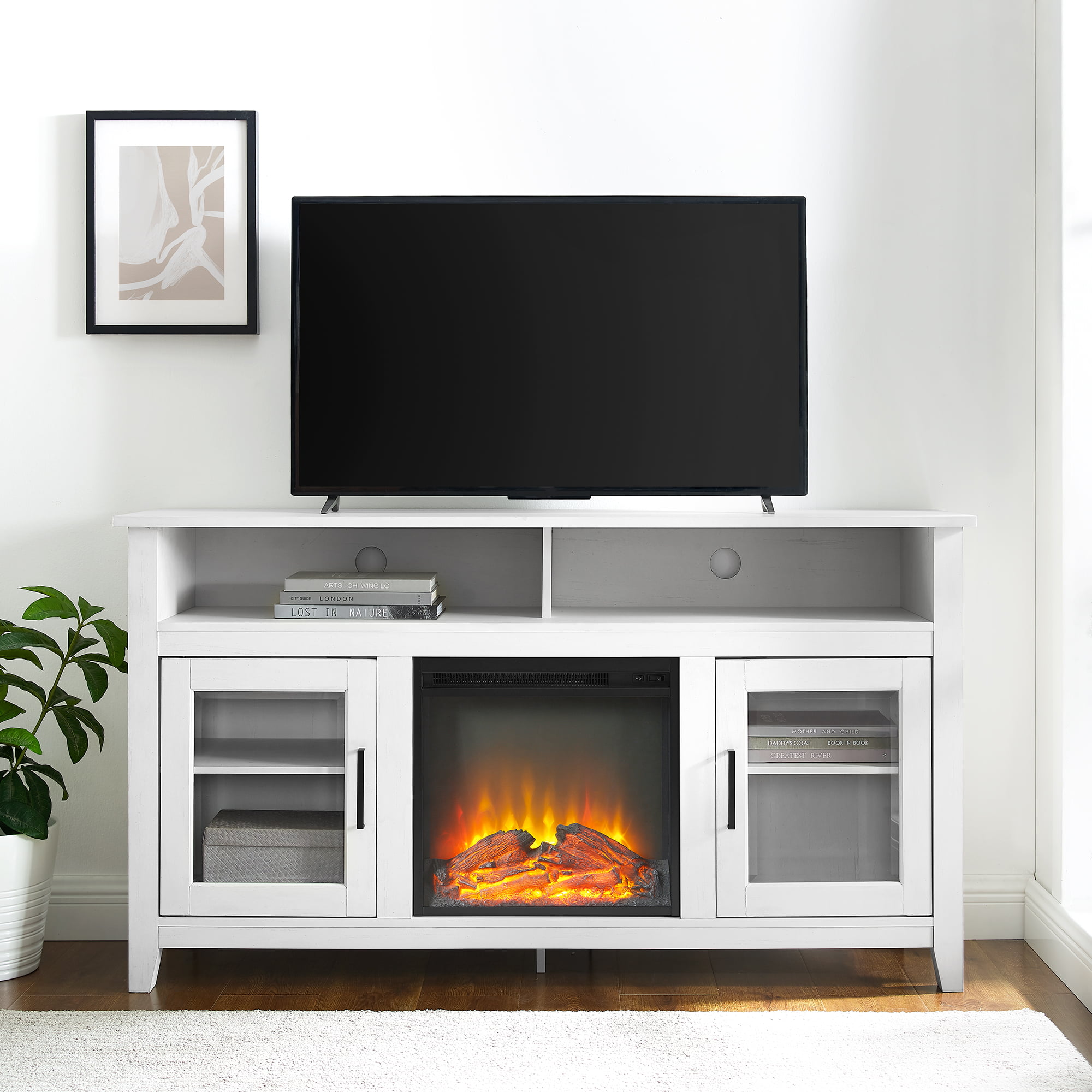 Woven Paths Highboy 2 Door Electric Fireplace TV Stand for TVs up to 65″. Brushed White
