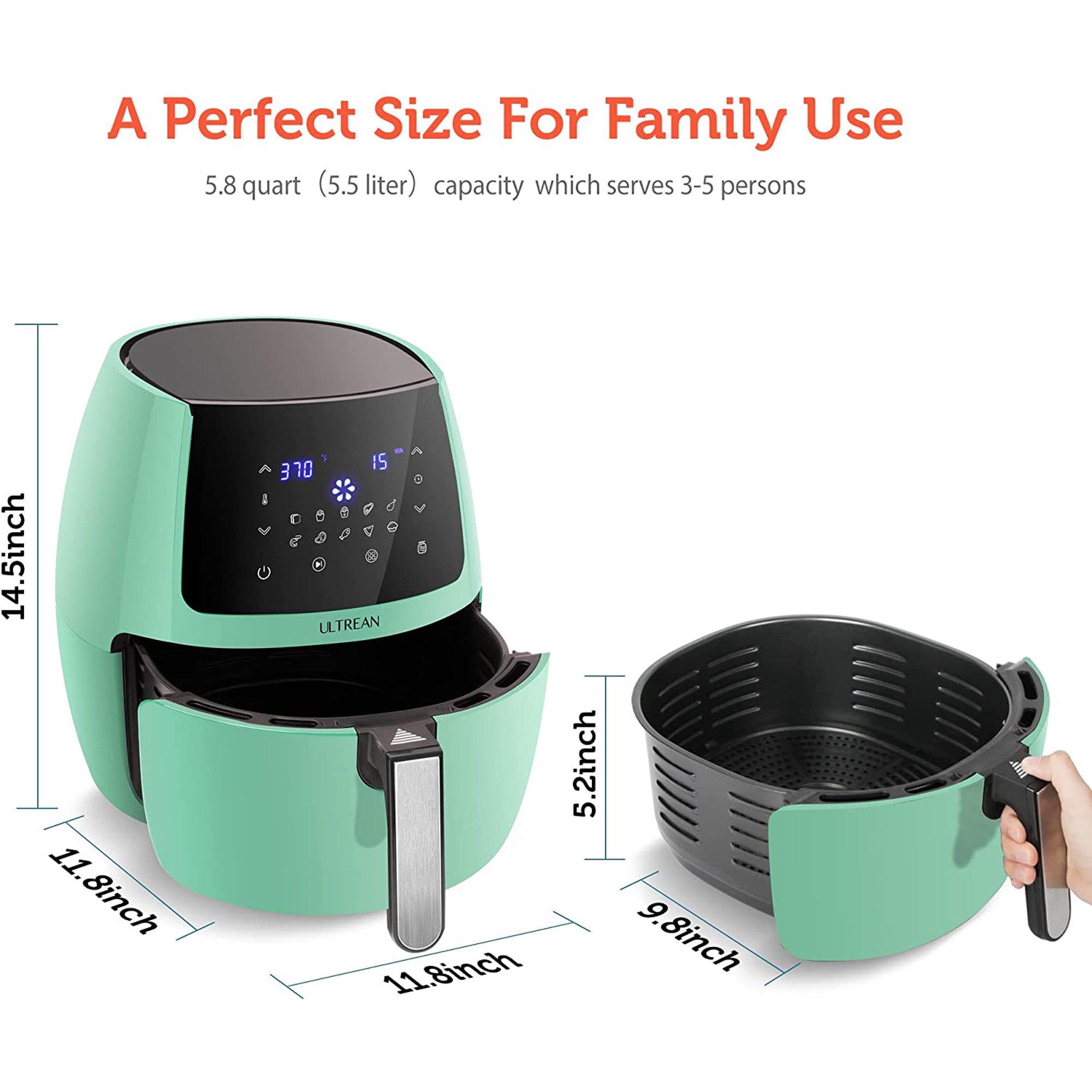 Ultrean 1700W 5.8 Quart Air Fryer. Oilless Oven Cooker with 10 Presets. Nonstick Basket. Green