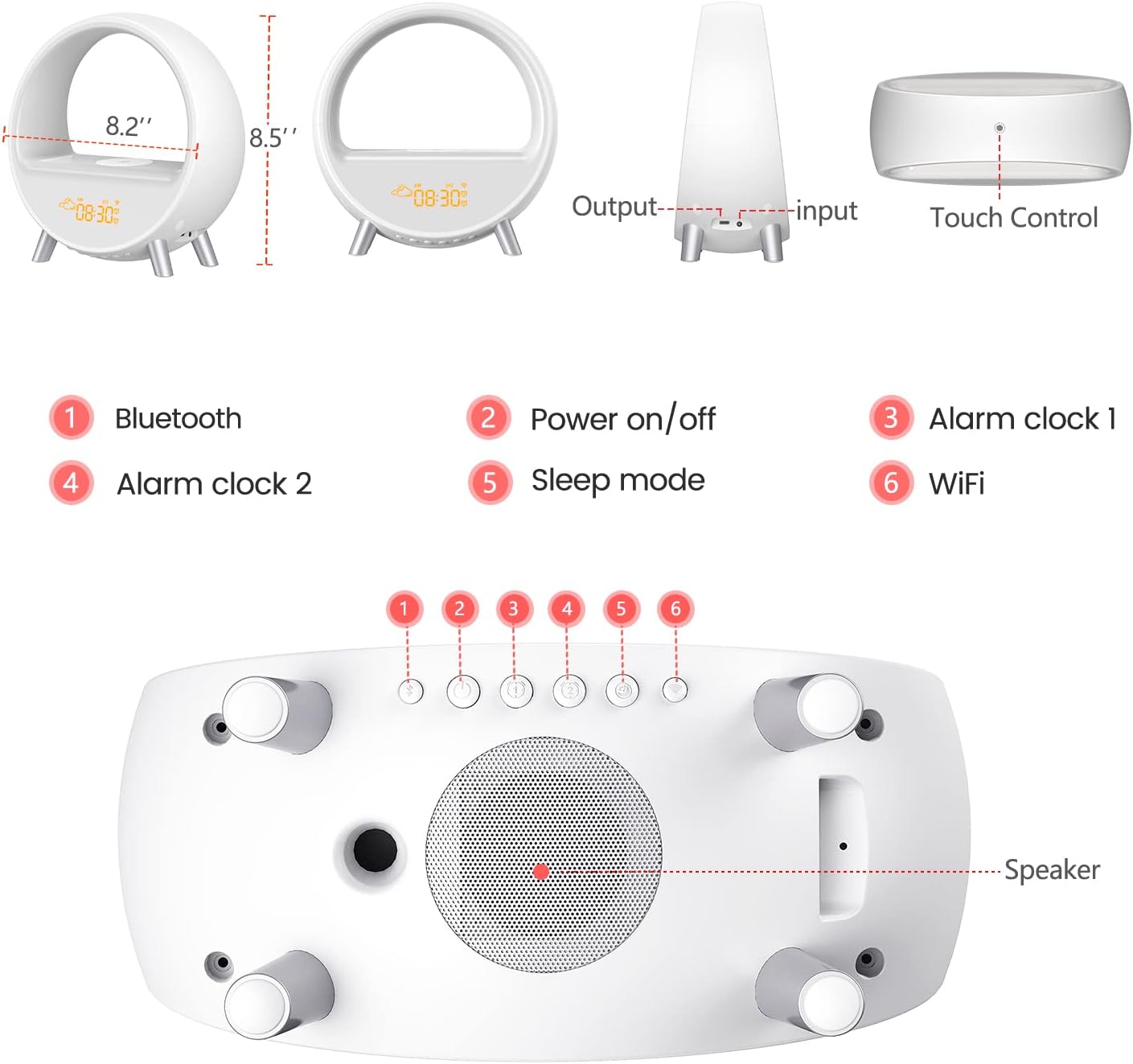 Dekala Arches Gradual Sunrise Alarm Clock with Wireless Charging Bluetooth Speaker White Noise Sleep Sound Machine with Night Light for Adults Touch/App Control Work with Alexa 【2.4G WiFi Required】