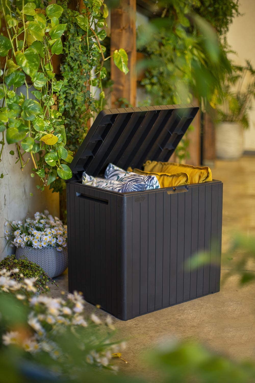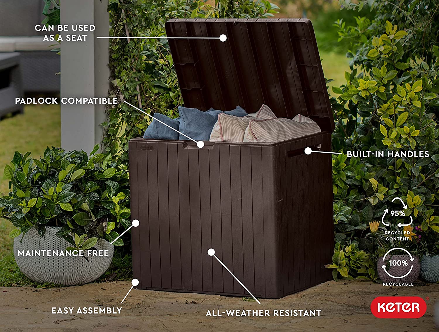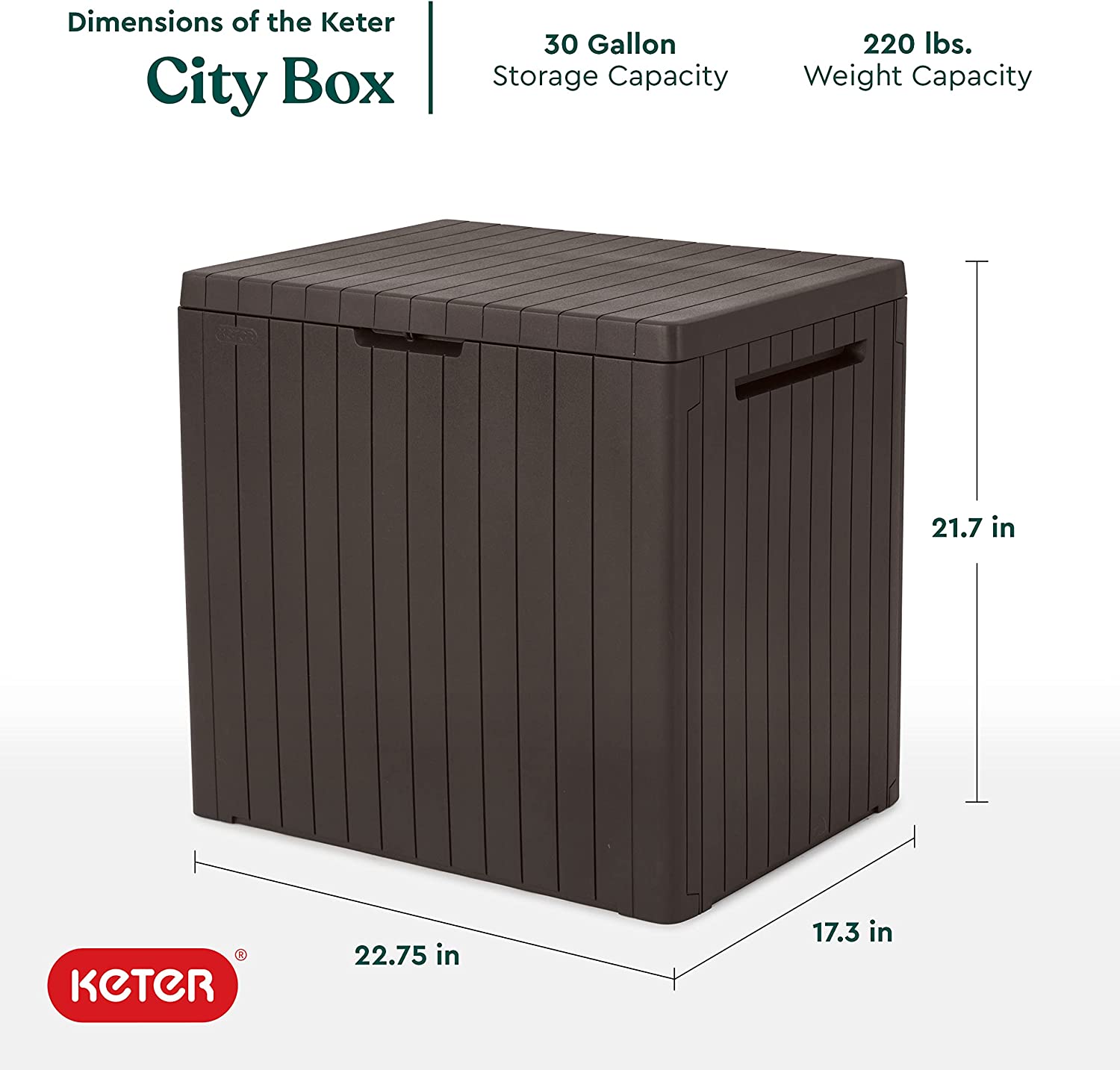 Keter City 30 Gallon Resin Deck Box for Patio Furniture. Pool Accessories. and Storage for Outdoor Toys. Brown