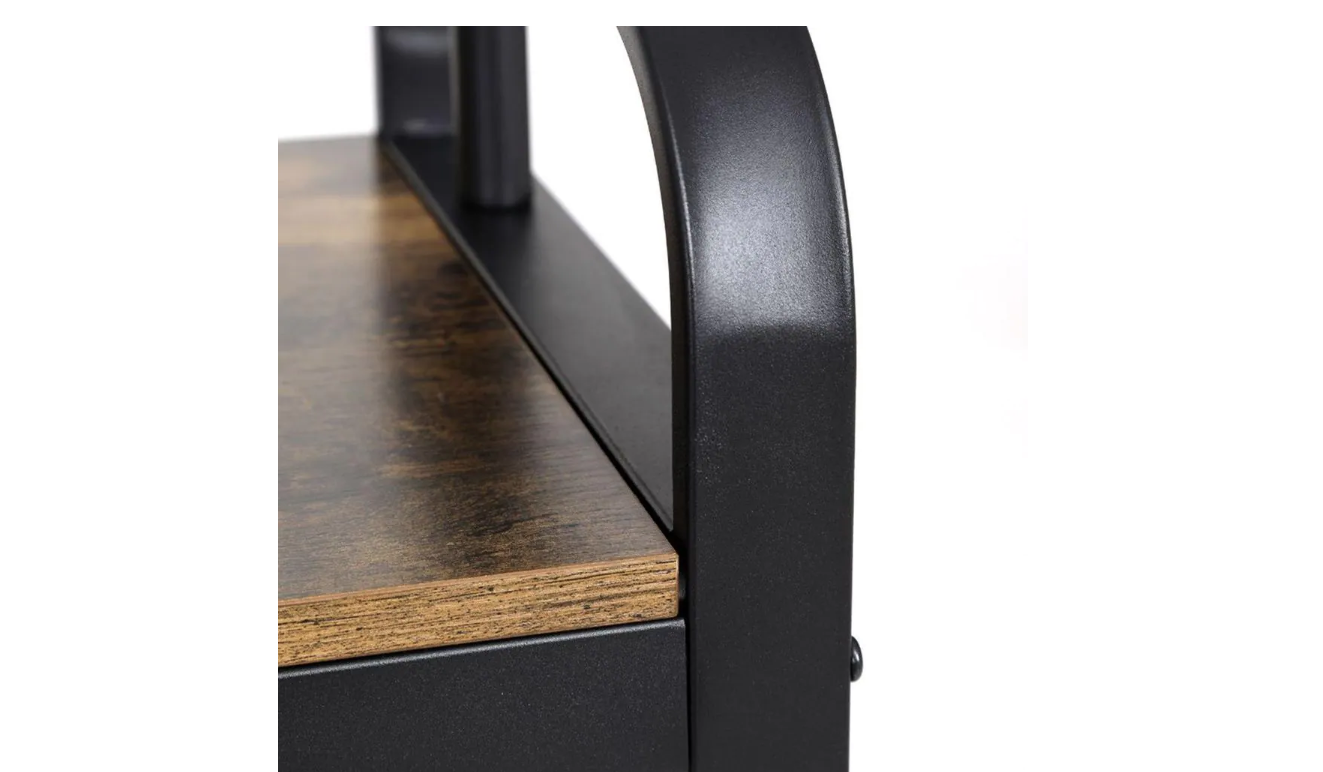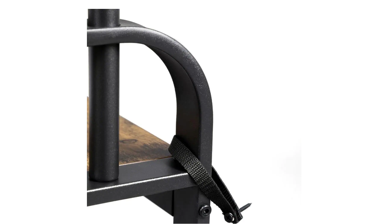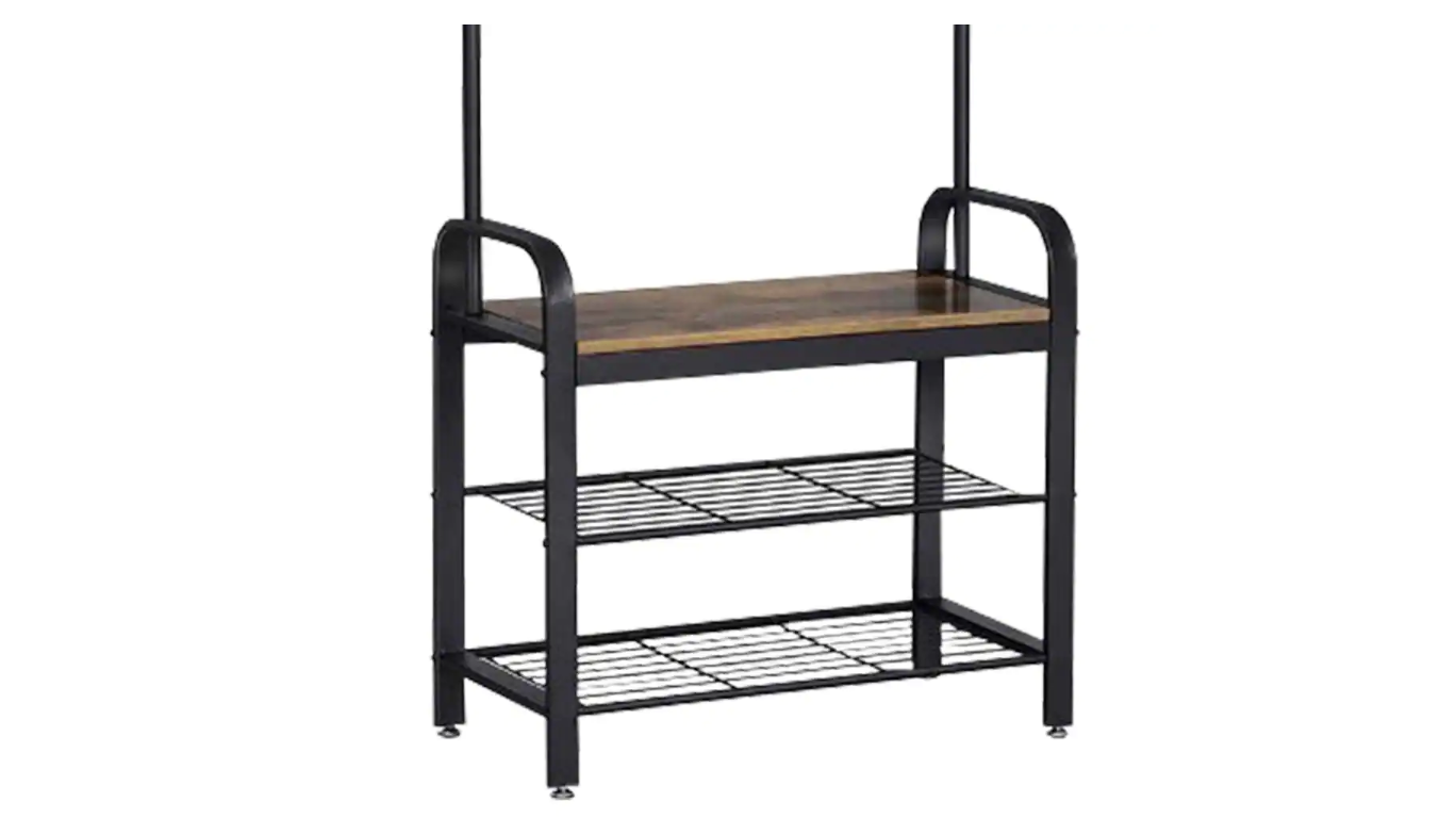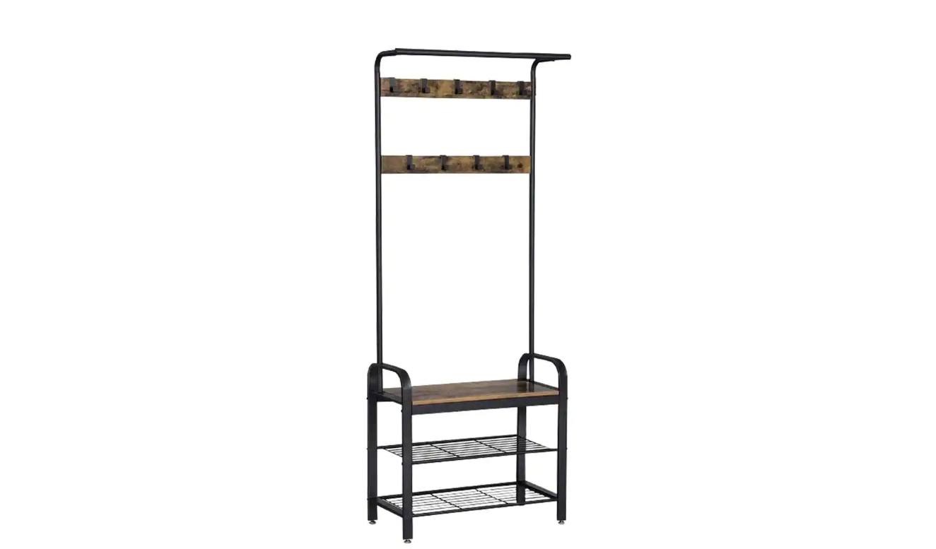 Benjara BM195838 Brown and Black Metal and Wood Framed Coat Rack with Multiple Hooks and Storage Shelves