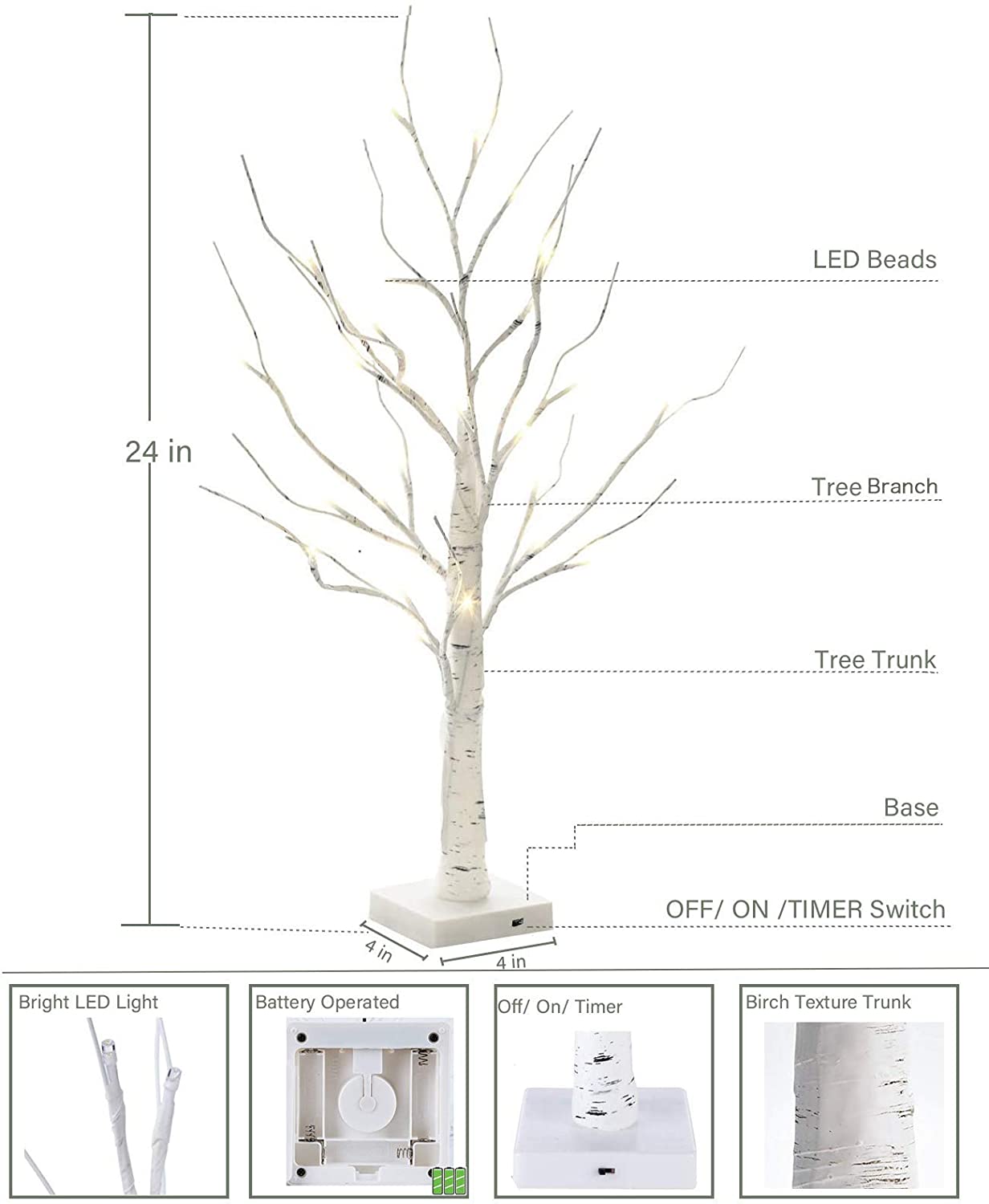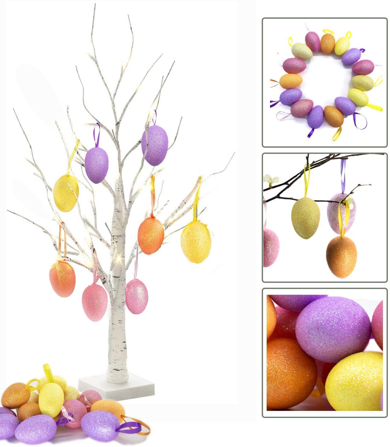 Fsforcar 24 2FT White Lighted Birch Tree with Set of 12 Hanging Easter Glitter