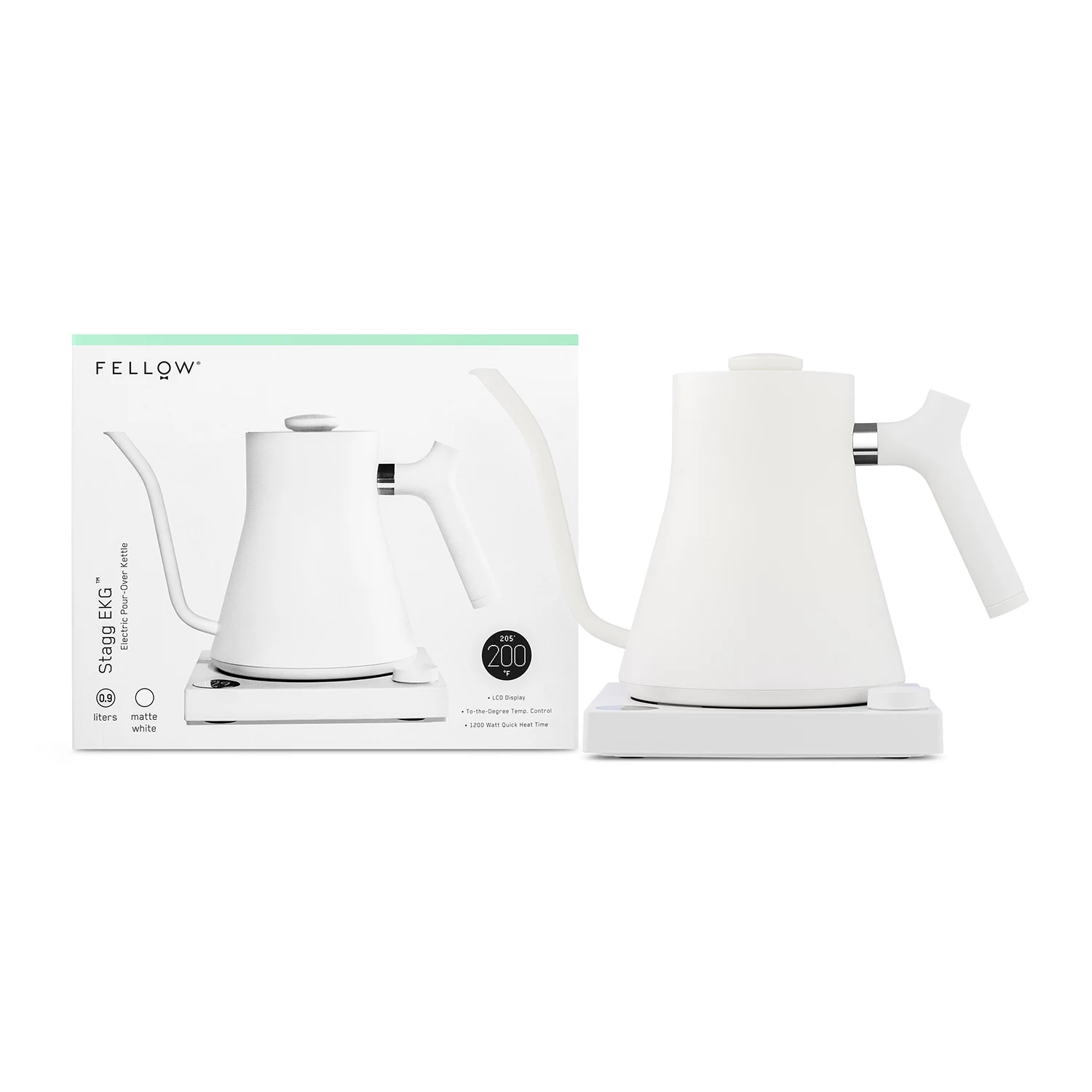 Fellow Stagg EKG Electric Gooseneck Kettle - Pour-Over Coffee and Tea Pot. Stainless Steel. Quick Heating. Matte White. Handle. 0.9 Liter