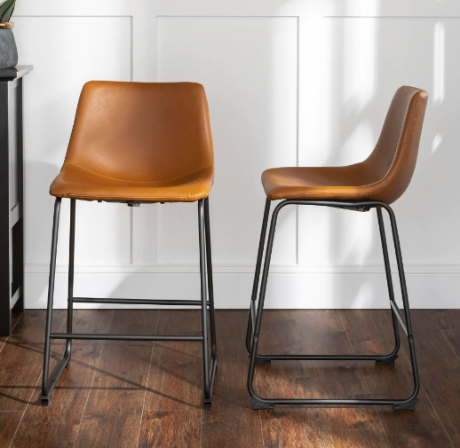 Walker Edison Wasatch 24 in. Whiskey Brown Low Back Metal Frame Counter Height Bar Stool with Faux Leather Seat (Set of 2)