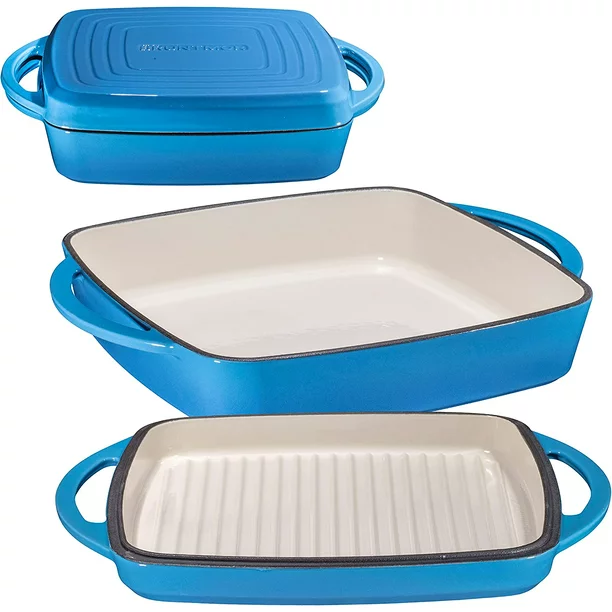 Bruntmor 2 in 1 Enameled Square Cast Iron Baking Pan Cookware Dish With Grill (Blue Whale)
