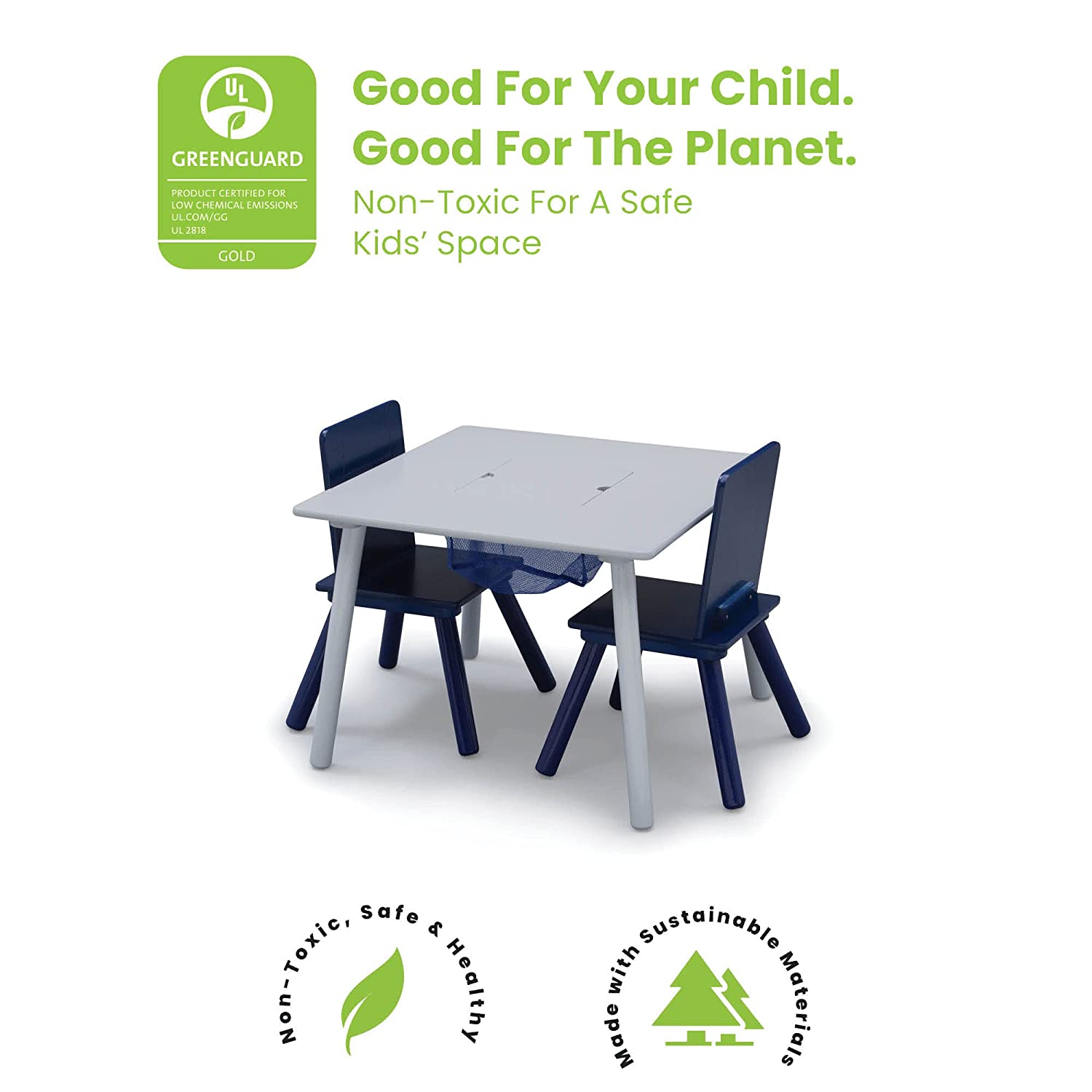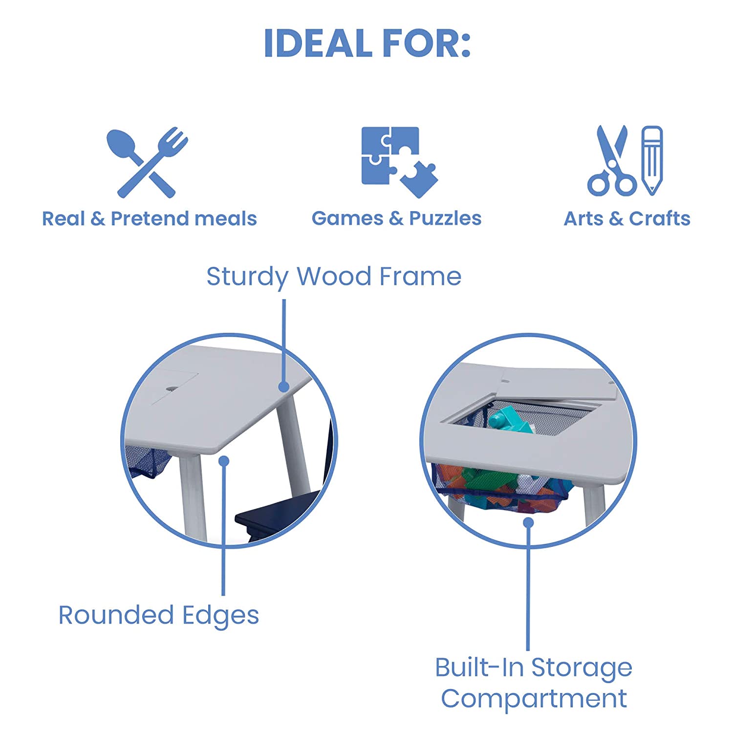 Delta Children Kids Table and Chair Set with Storage (2 Chairs Included) - Ideal for Arts & Crafts. Snack Time. Homeschooling. Homework & More - Greenguard Gold Certified. Grey/Blue