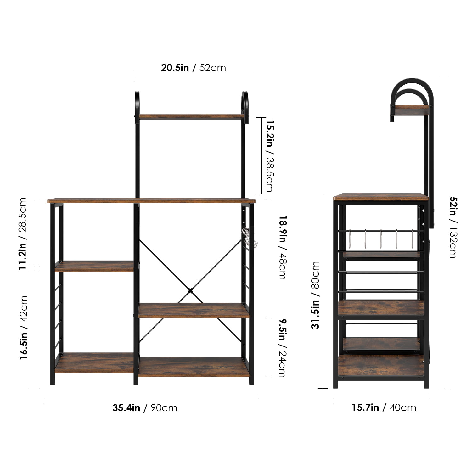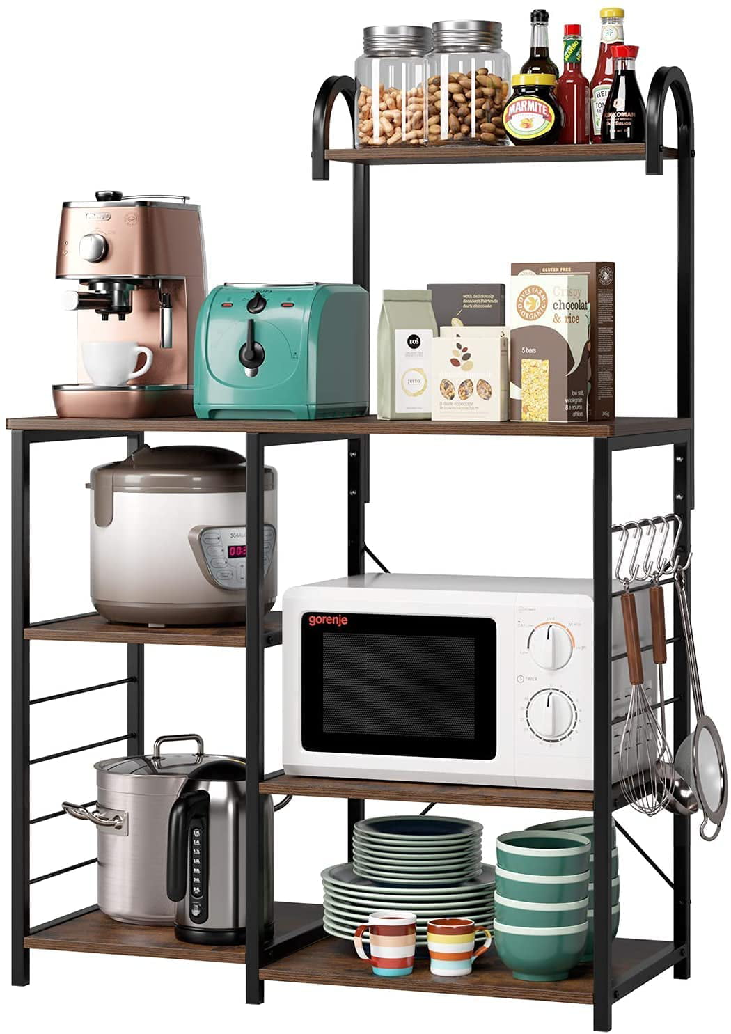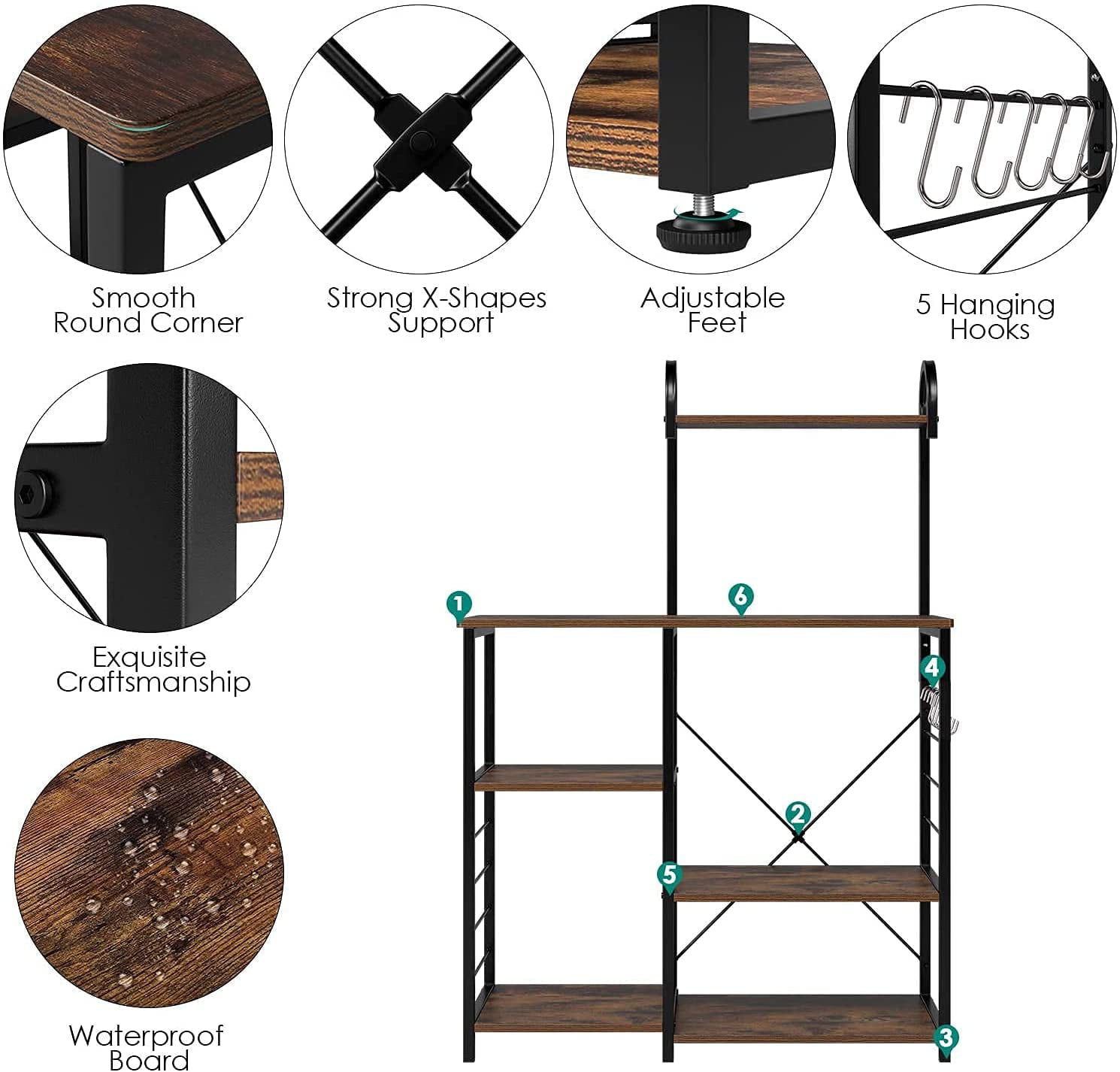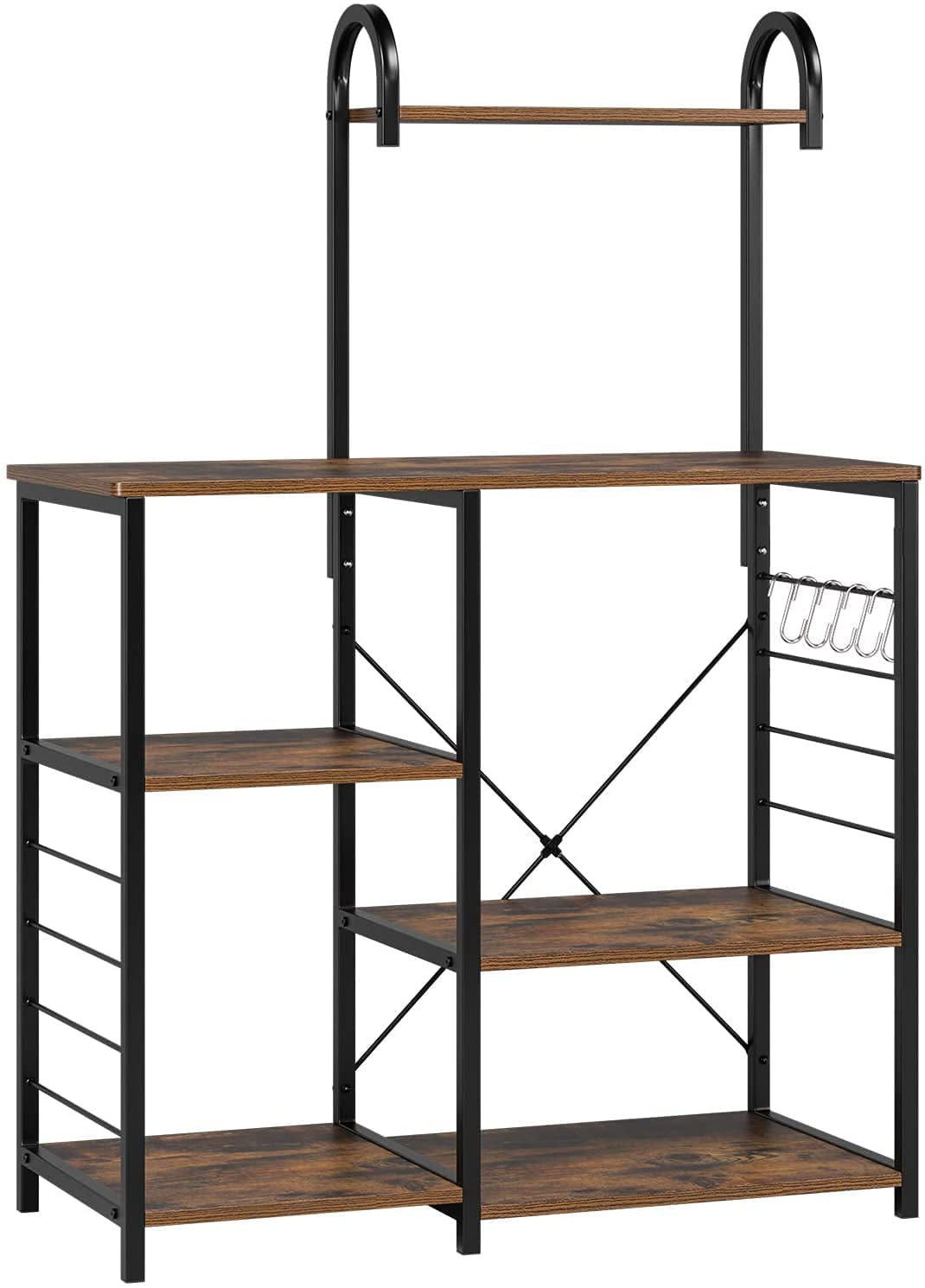 Homfa Bakers Rack. 5 Tier Wood Kitchen Stand with Storage Shelf. Iron Frame Microwave Oven Cart. Rustic Brown Finish