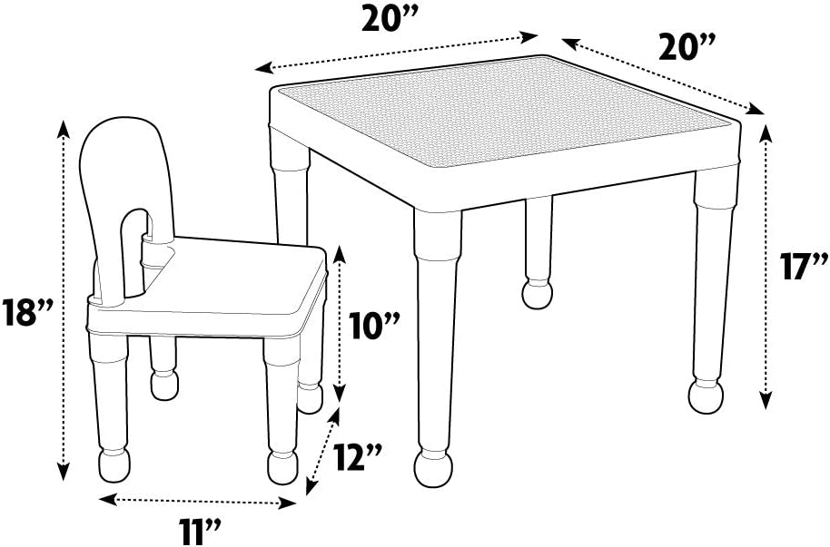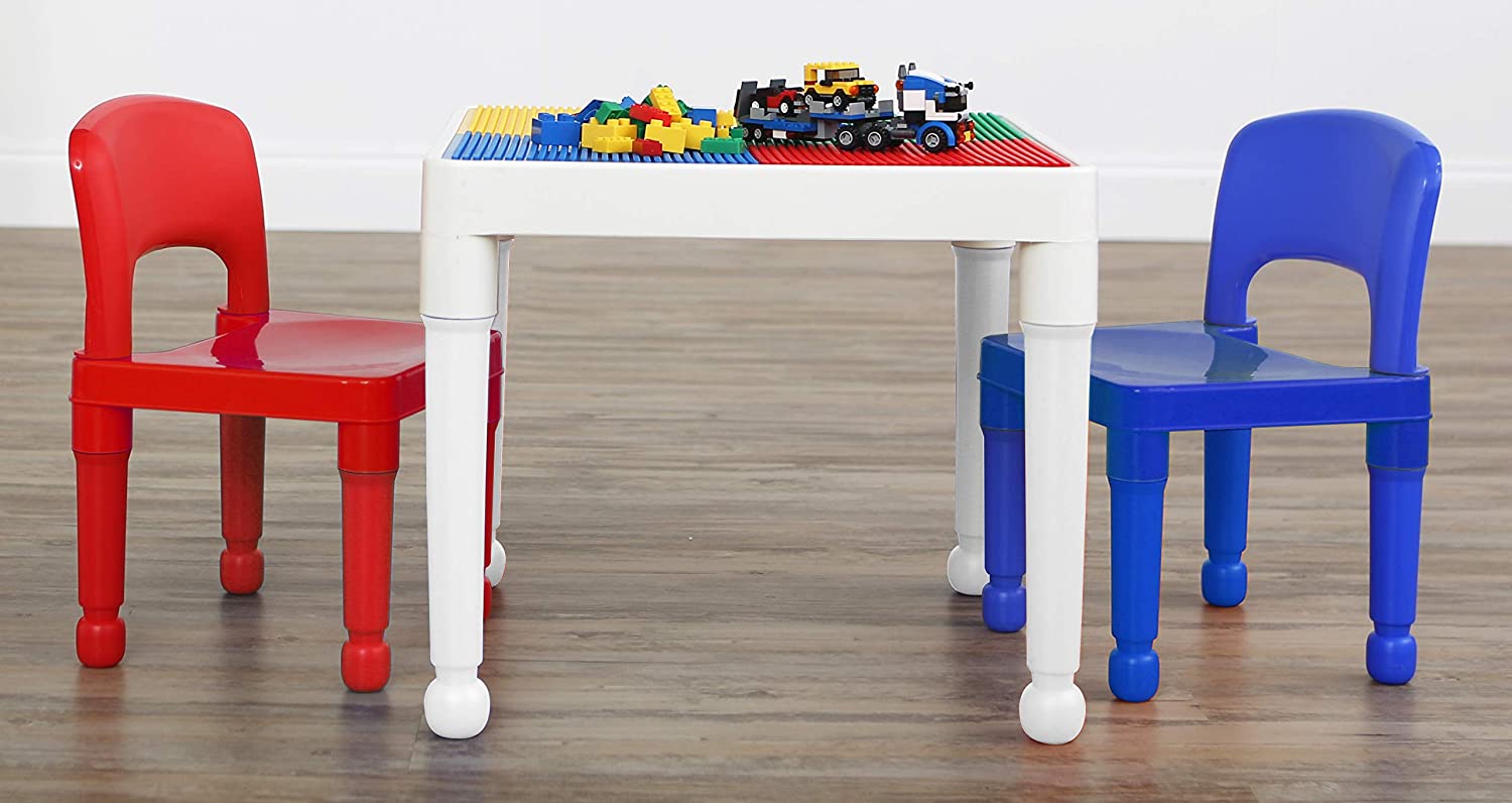 Humble Crew. White/Blue/Red Kids 2-in-1 Plastic Building Blocks-Compatible Activity Table and 2 Chairs Set. Square. Toddler