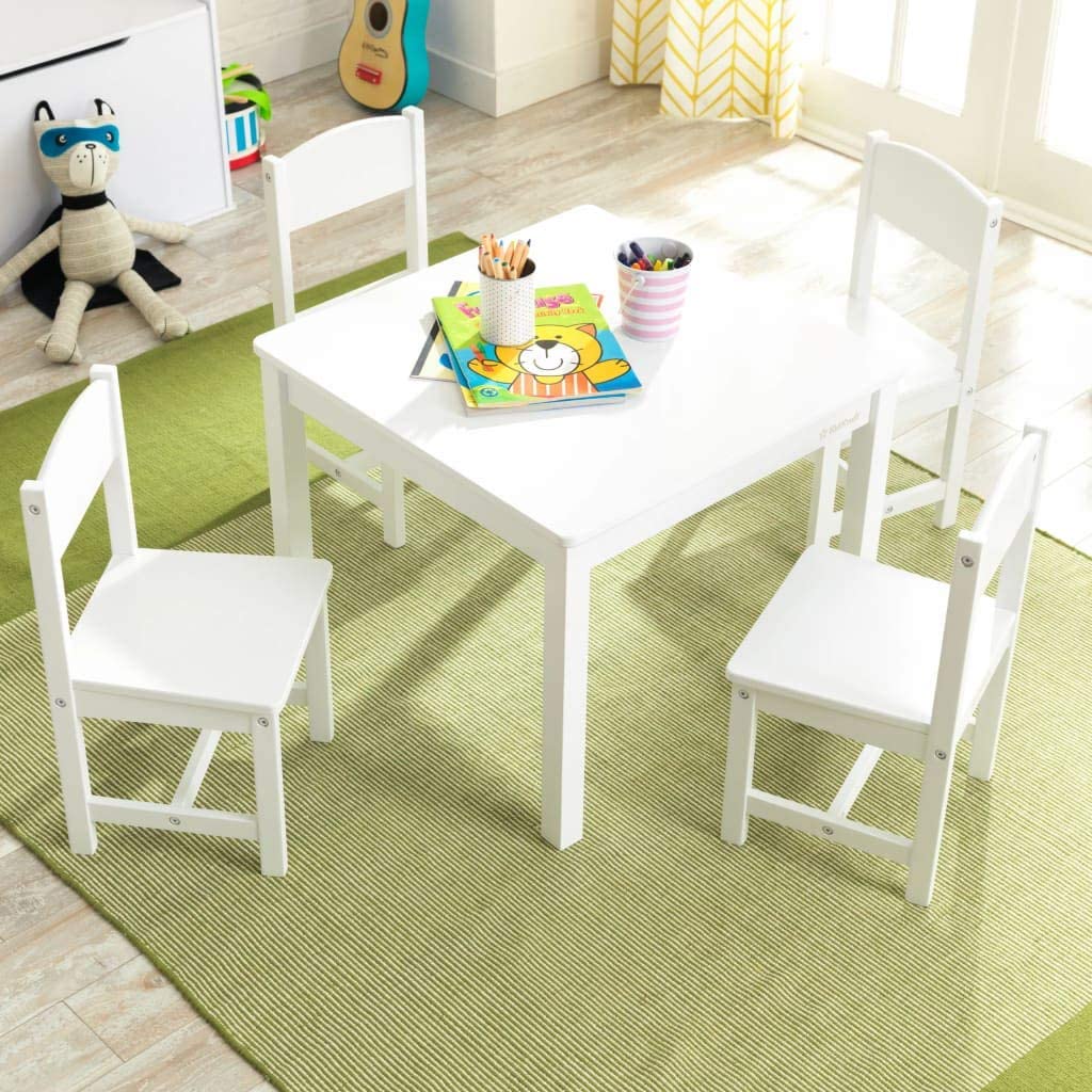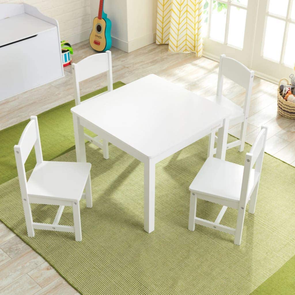 KidKraft Wooden Farmhouse Table & 4 Chairs Set. Children-s Furniture for Arts and Activity - White. Gift for Ages 3-8