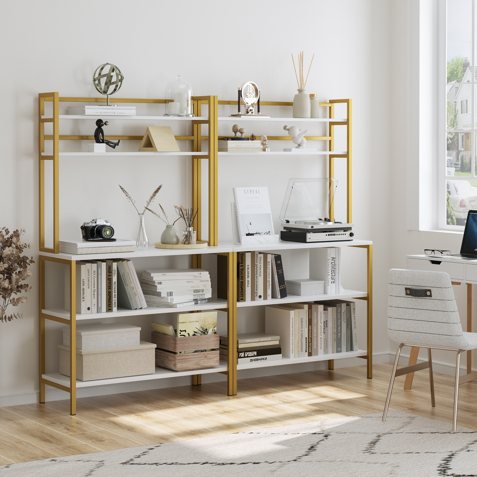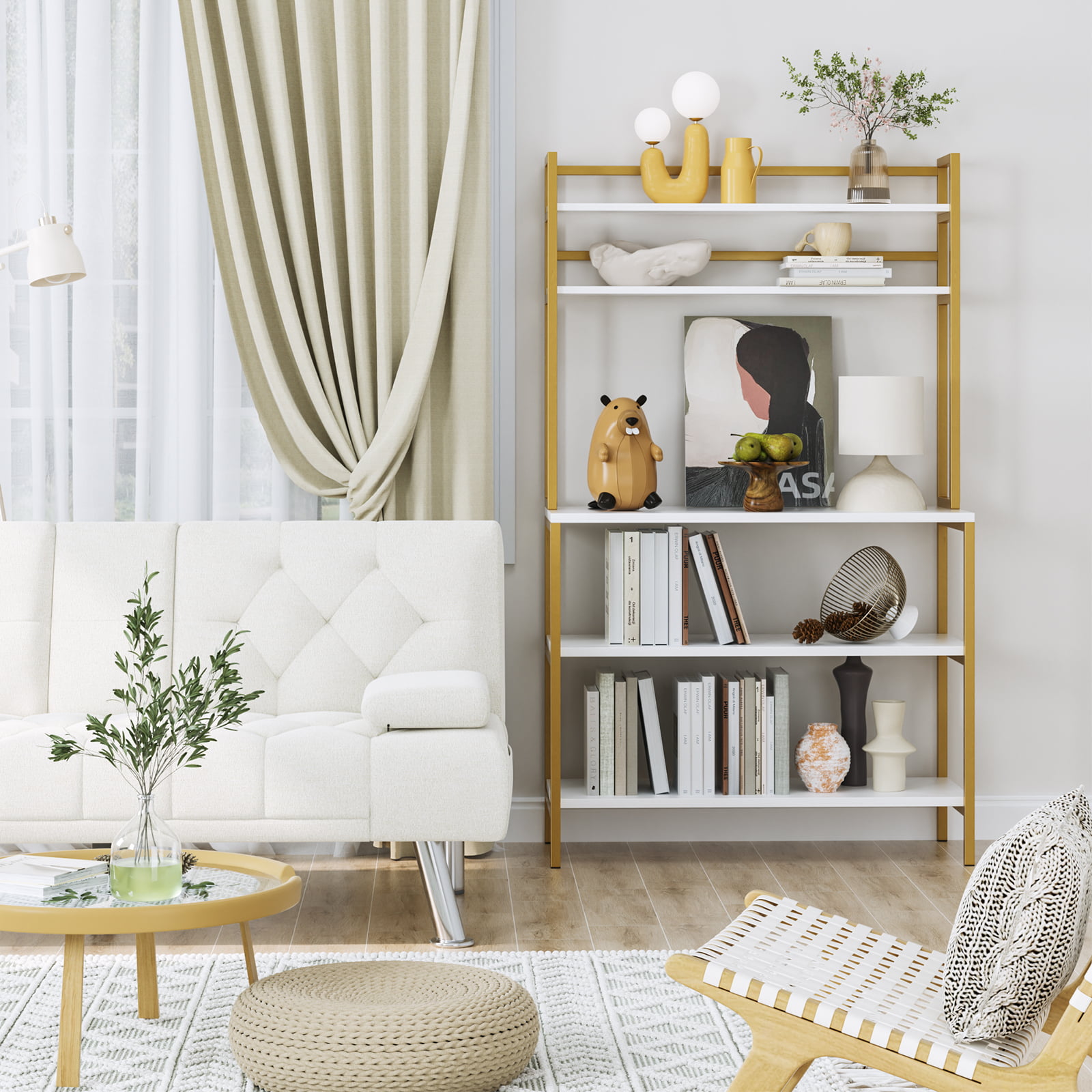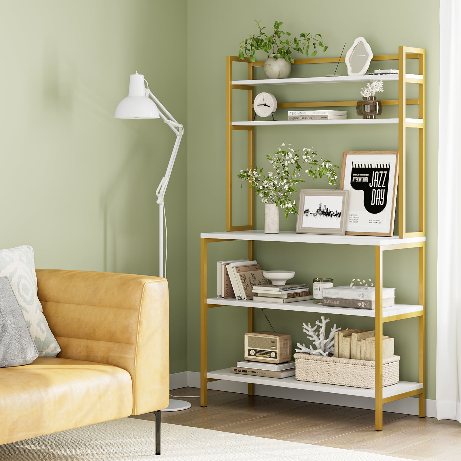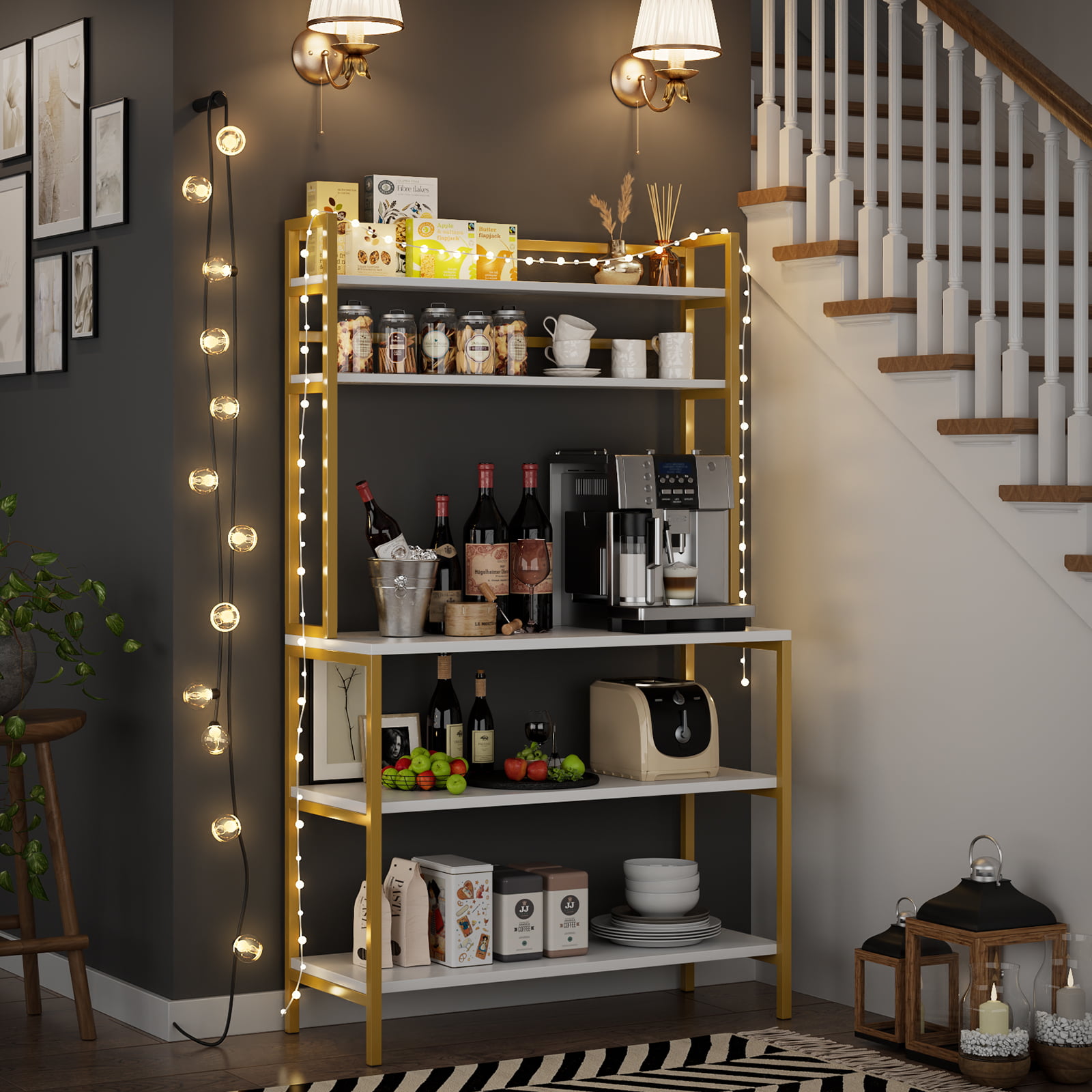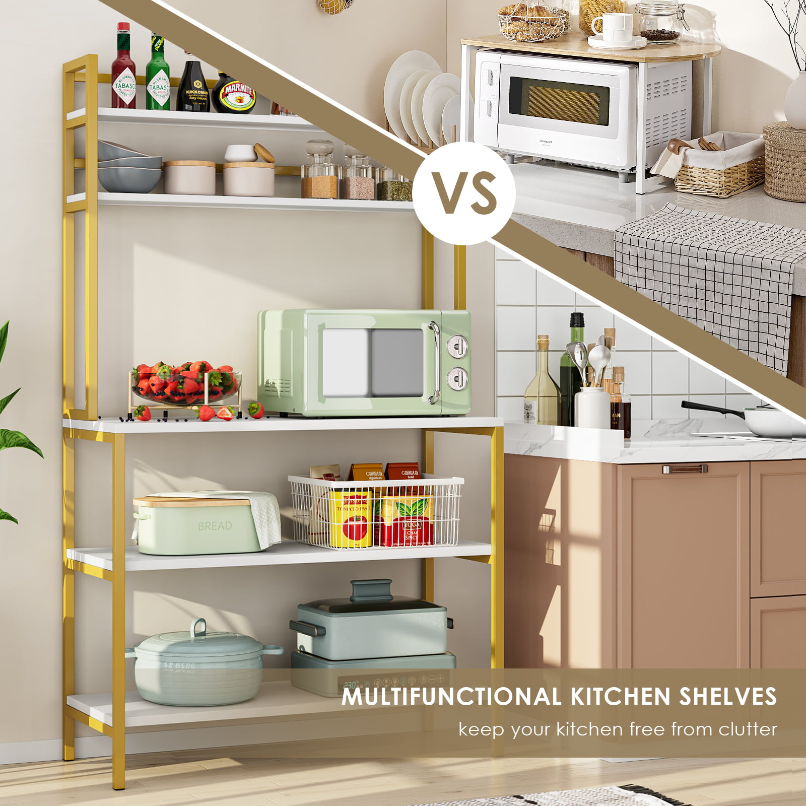 Homfa 5-Tier Kitchen Bakers Rack with Hutch. Gold Framed Microwave Oven Stand Storage Shelf. White Finish