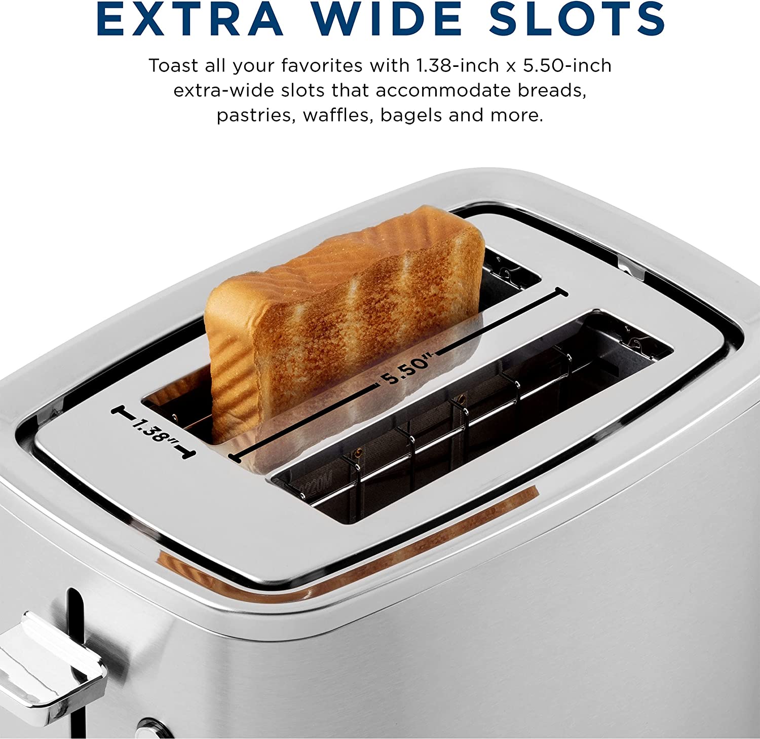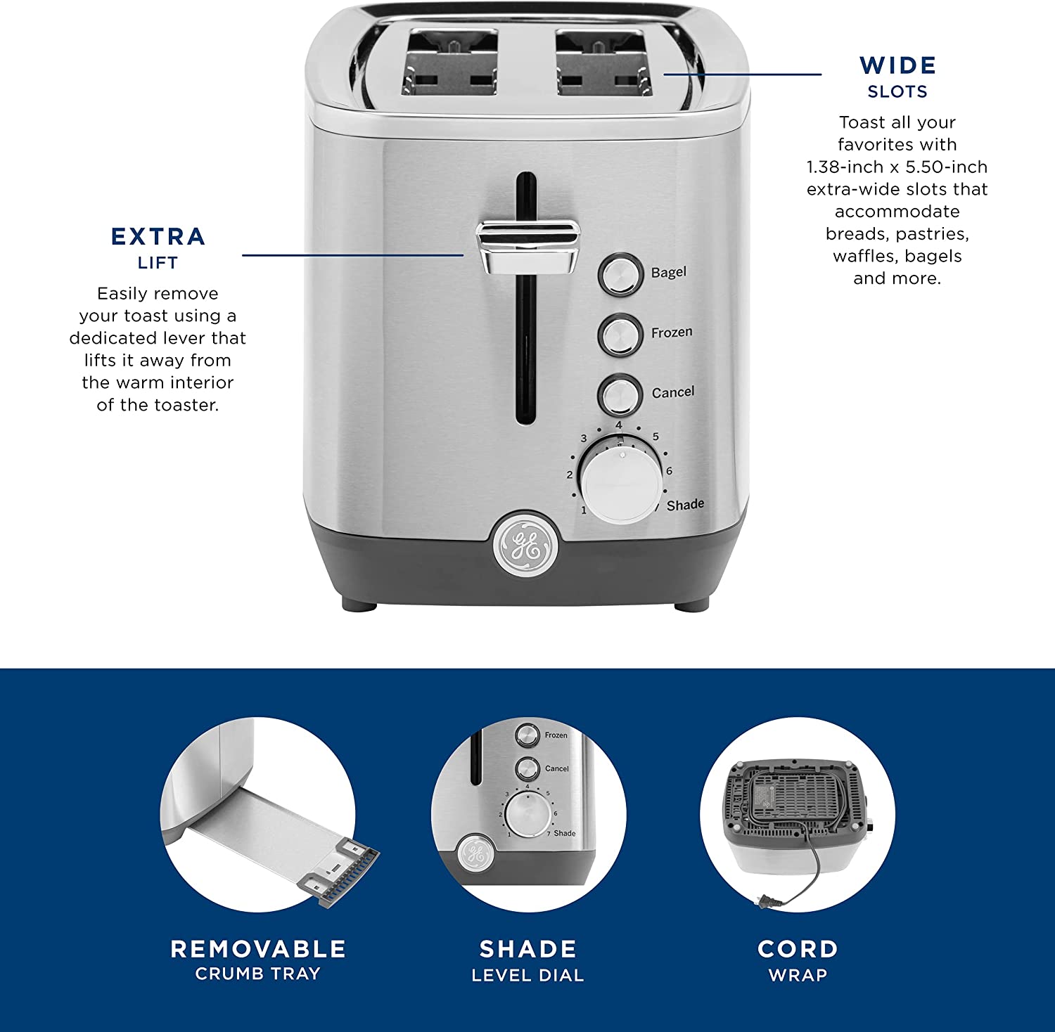 GE Stainless Steel Toaster | 2 Slice | Extra Wide Slots for Toasting Bagels. Breads. Waffles & More | 7 Shade Options for the Entire Household to Enjoy | Countertop Kitchen Essentials | 850 Watts
