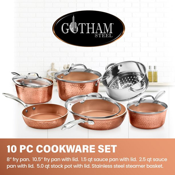 Gotham Steel Hammered 10 Piece Hammered Cookware Set. Oven Safe. Dishwasher Safe - Elegant Pots & Pans