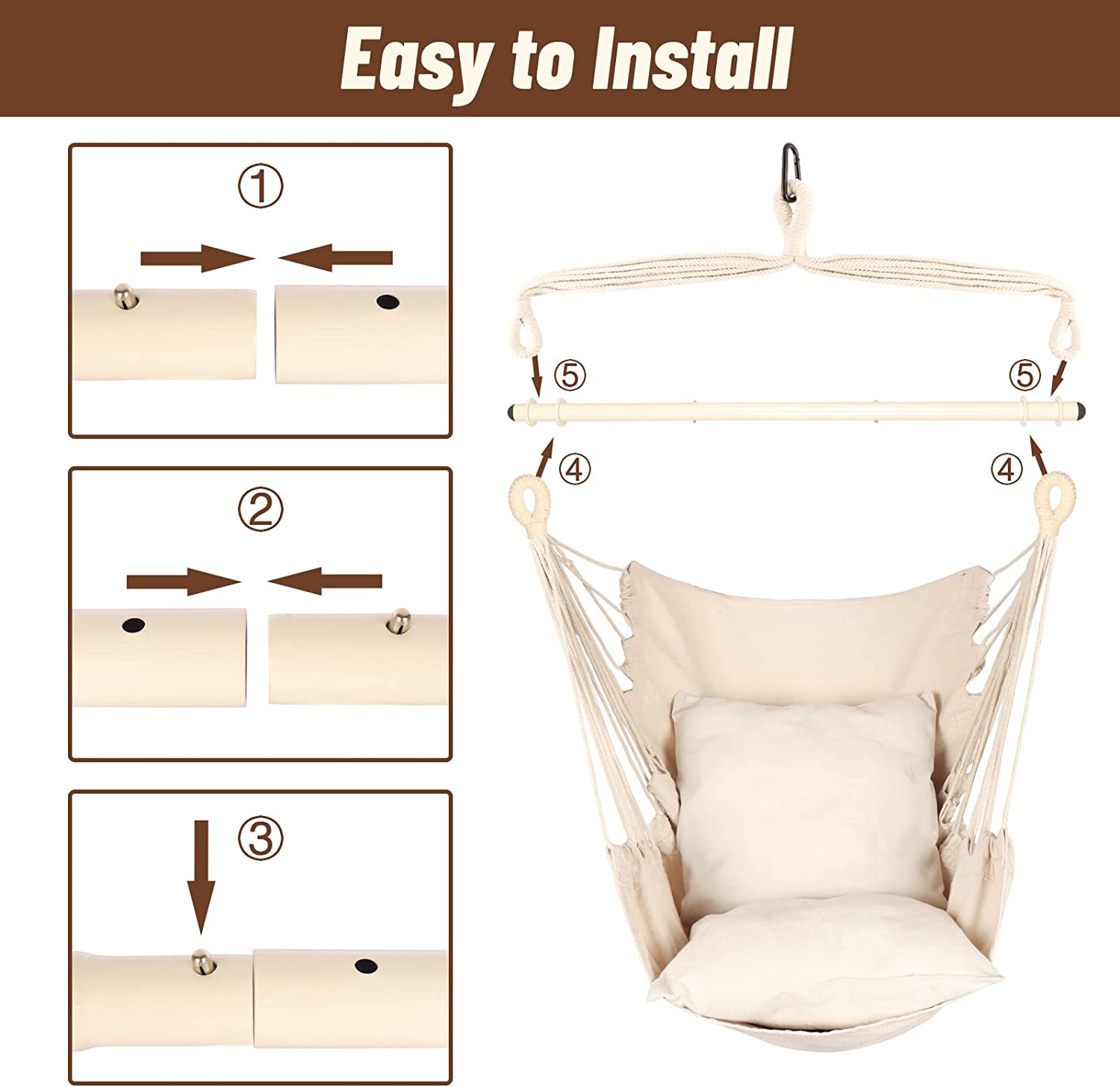 Highwild Hammock Chair Hanging Rope Swing - Max 500 Lbs - 2 Cushions Included - Steel Spreader Bar with Anti-Slip Rings - for Any Indoor or Outdoor Spaces (Beige)