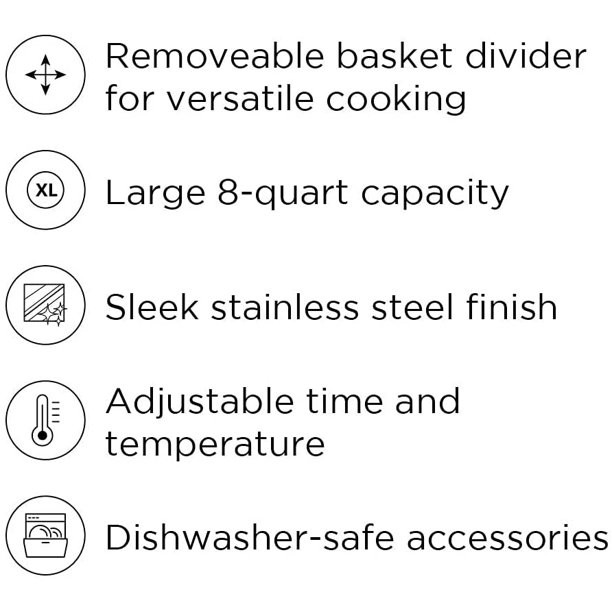 Chefman Turbo Fry Stainless Steel Air Fryer with Basket Divider. 8-Quart