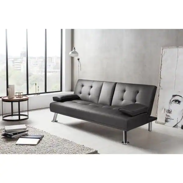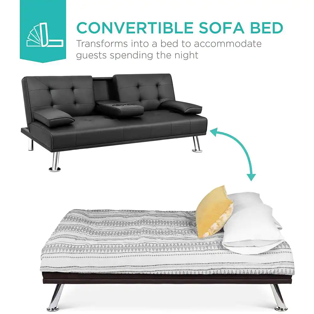 Black 66 in. Faux Leather Upholstered Convertible Folding Futon Sofa Bed 2 Cupholders