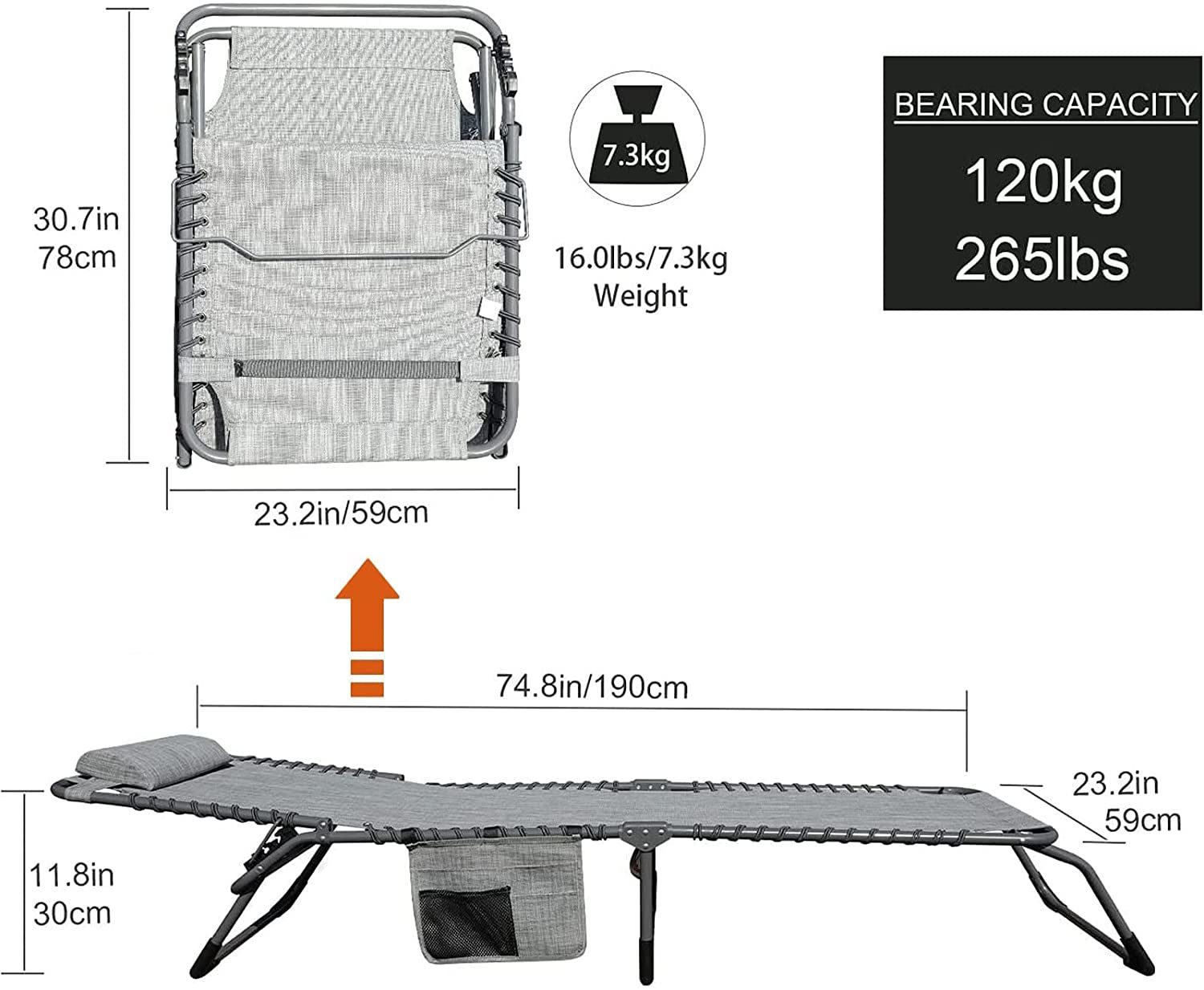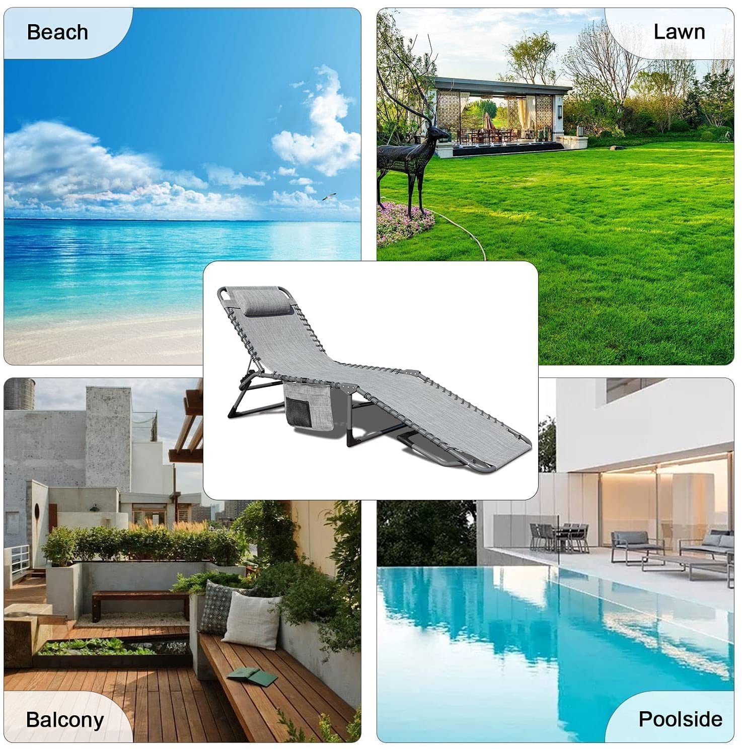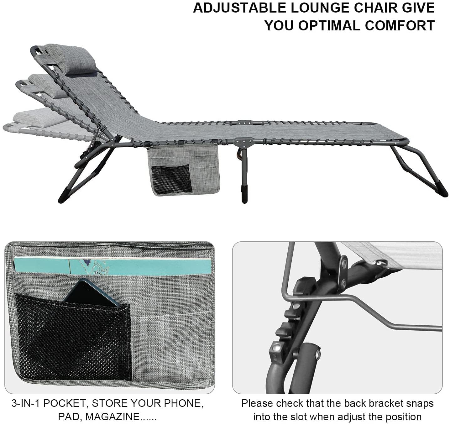 GOLDSUN 2 Pieces Outdoor Adjustable Chaise Lounge Set with Detachable Pocket.All Weather Reclining Folding Patio Lounge Chair Set for Garden.Beach. Sunbathing. Pool. Deck.Camping and Poolside-Grey