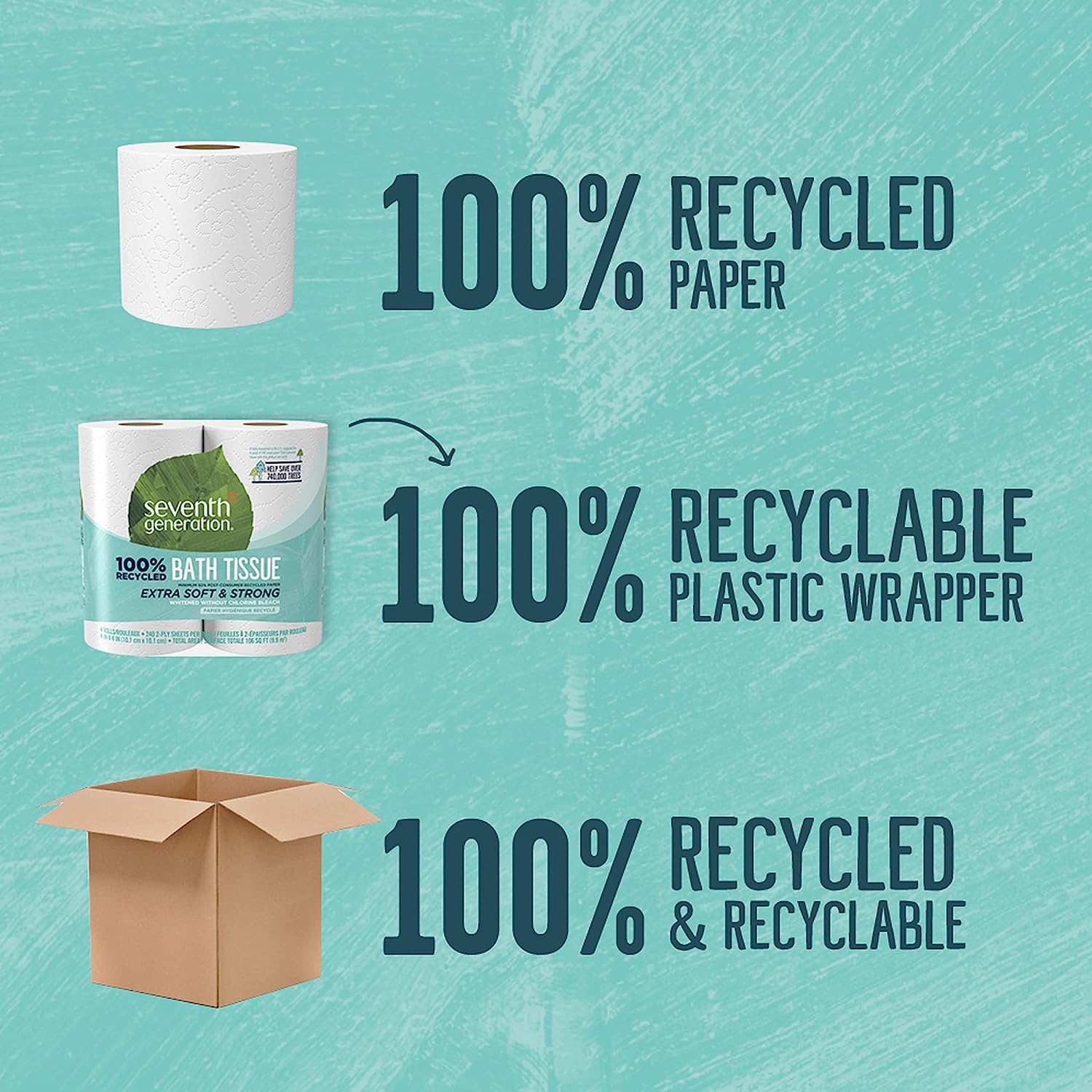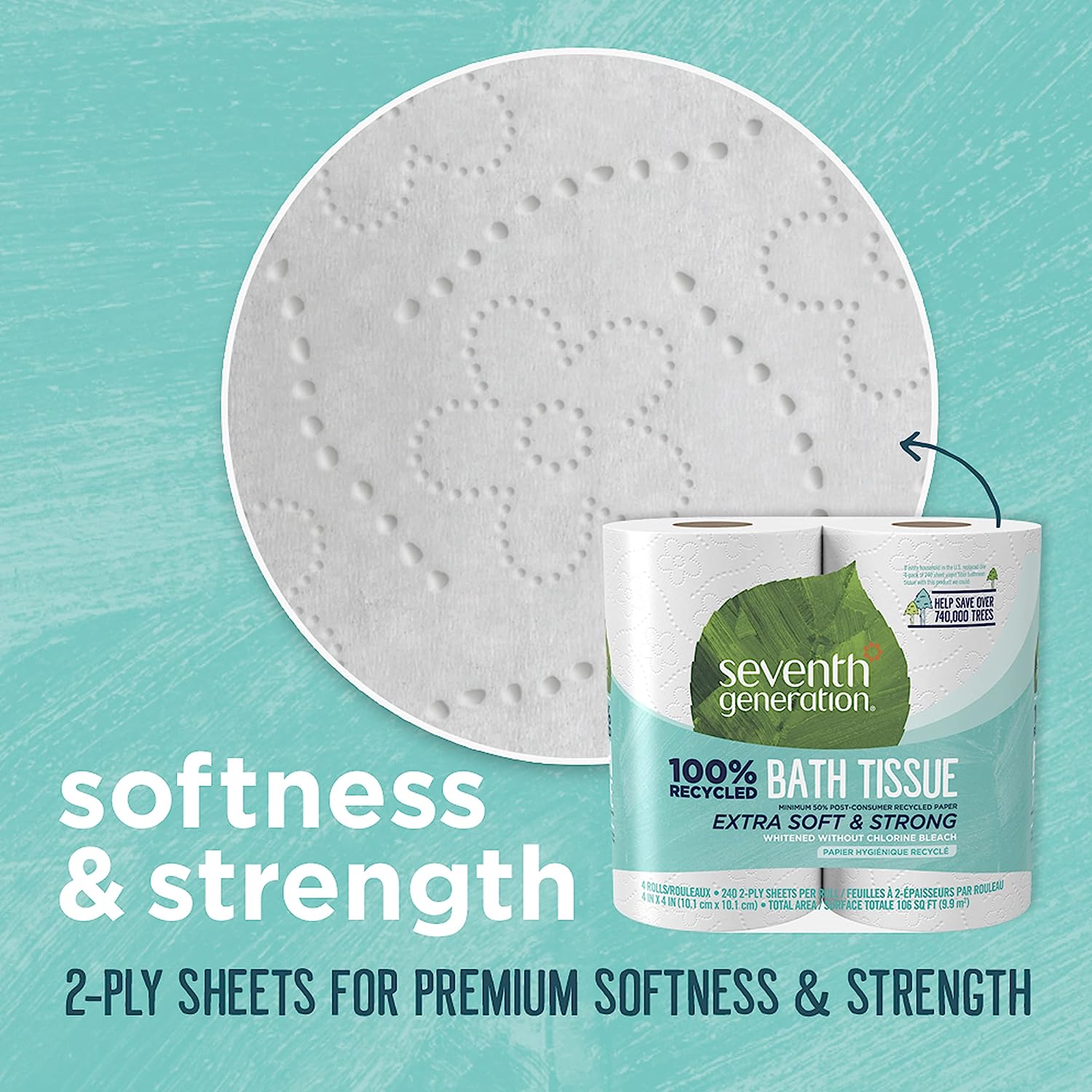Seventh Generation Toilet Paper Recycled Bath Tissue 4-Pack 100% Recycled Paper 2-ply without Chlorine Bleach 12 Rolls