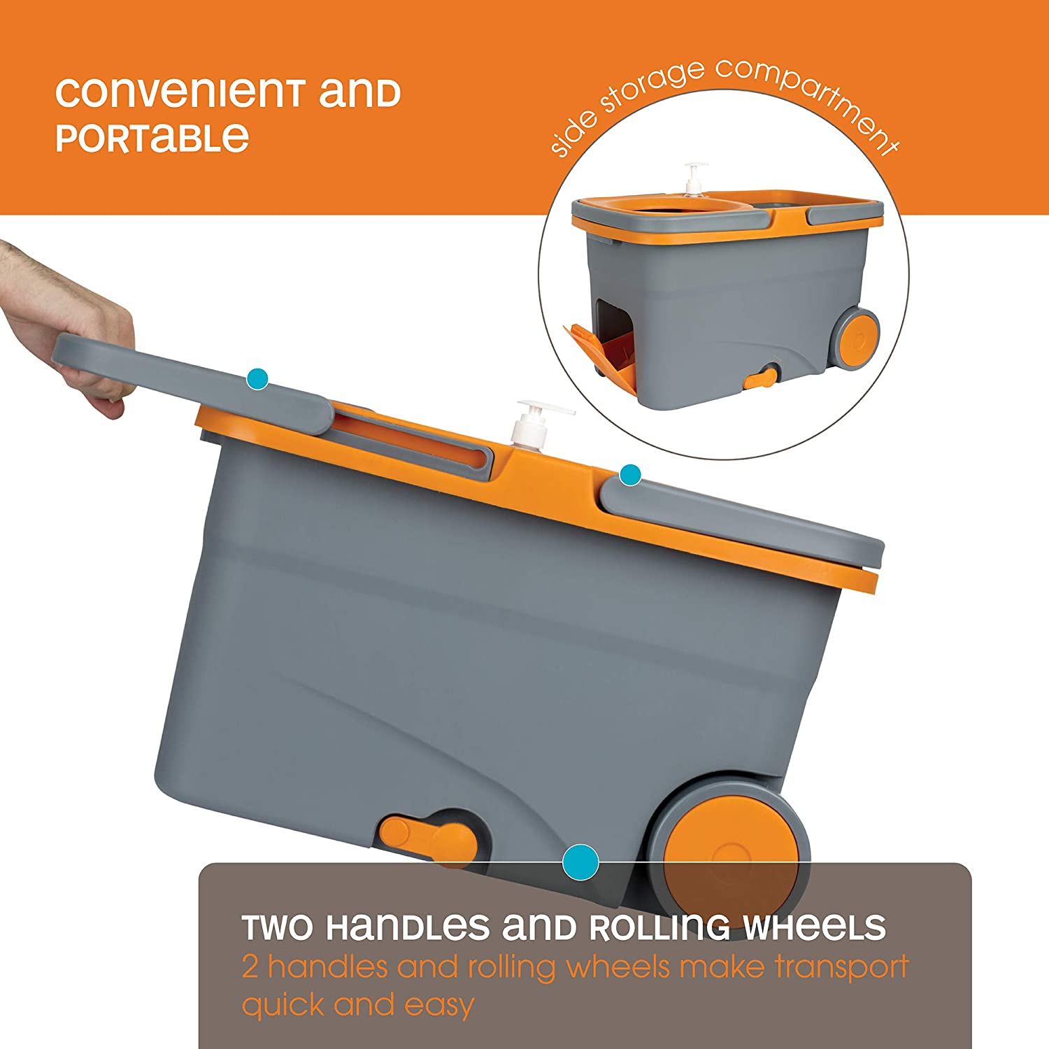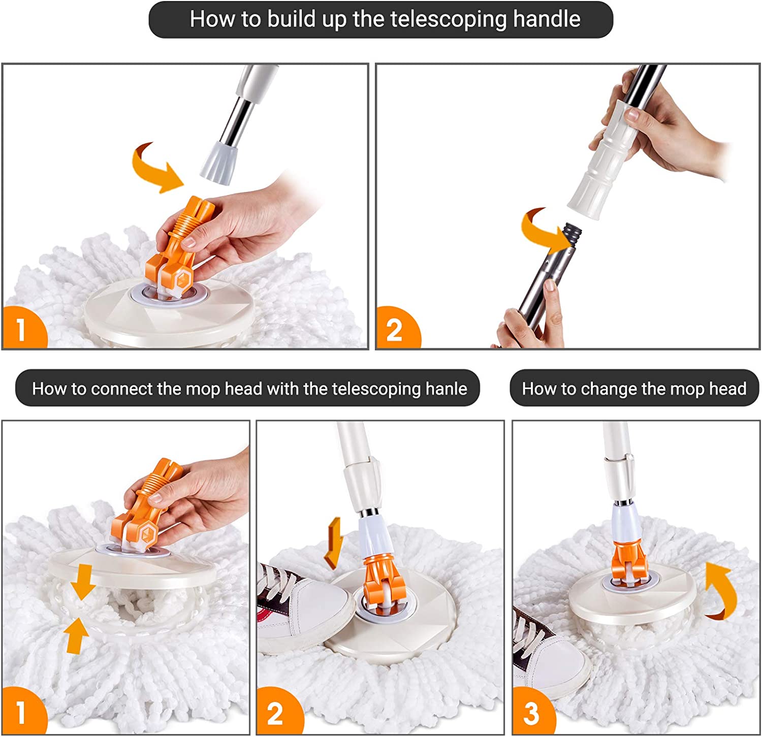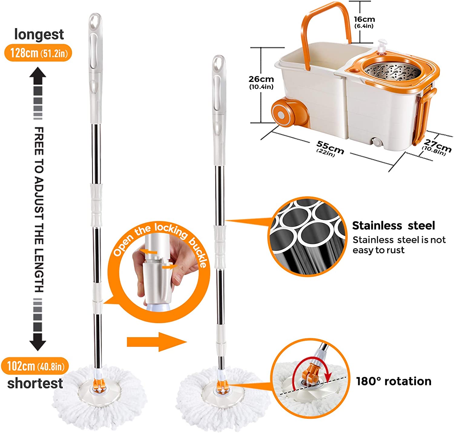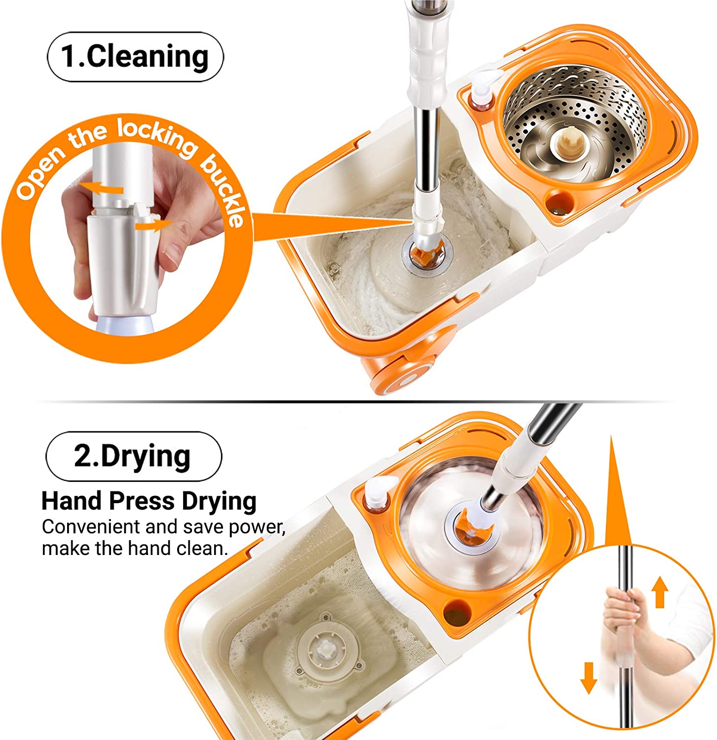 MASTERTOP Spin Mop Bucket System with Wringer Set - Floor Mop Stainless Steel Mop Handle. Mop Buckets Separate Clean and Dirty Water. 4 Washable Microfiber Mop Head. Cleaning Bucket Easy to Store