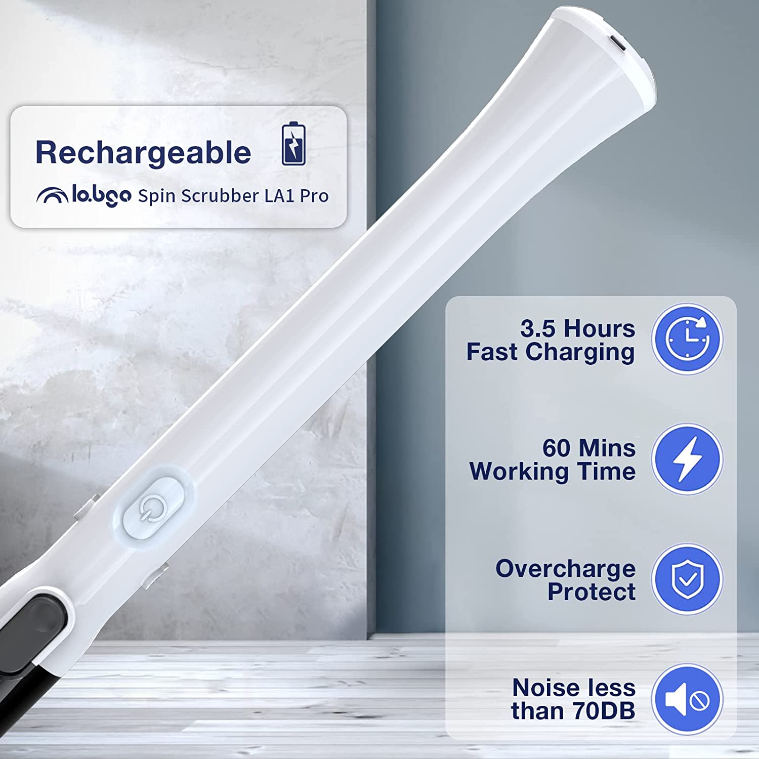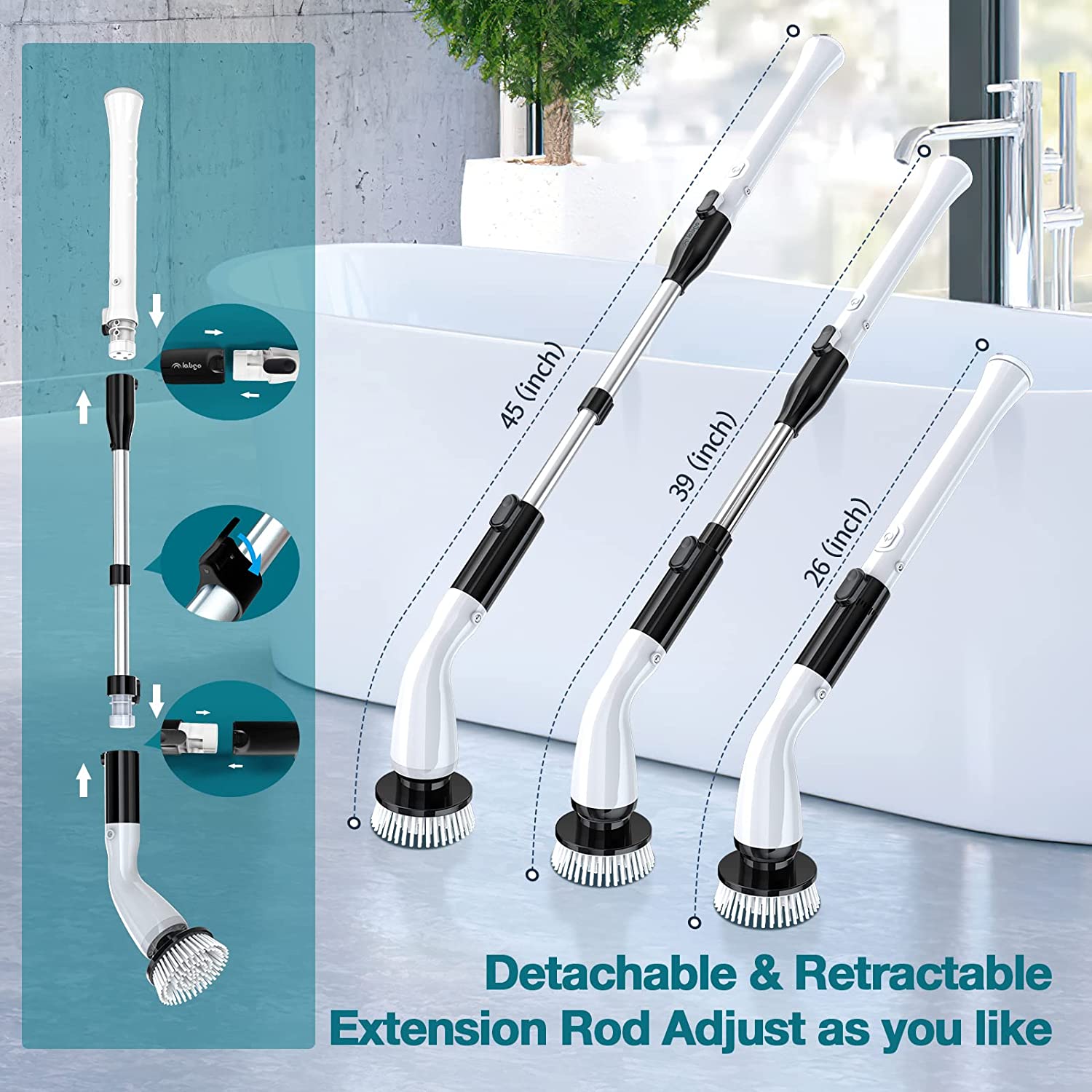 LABIGO Electric Spin Scrubber. with 4 Replaceable Brush Heads and Adjustable Extension Handle. Power Cordless Spin Scrubber for Bathroom Stone Tile Floor.Grout.Grooves(Black)