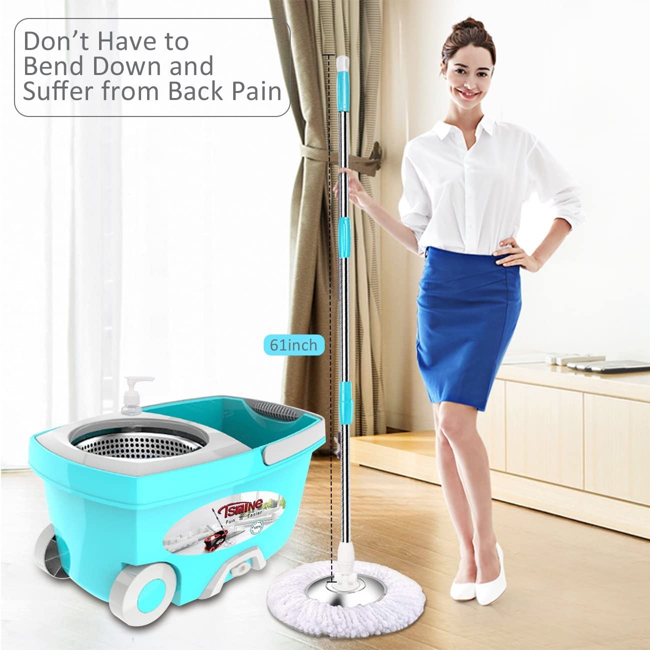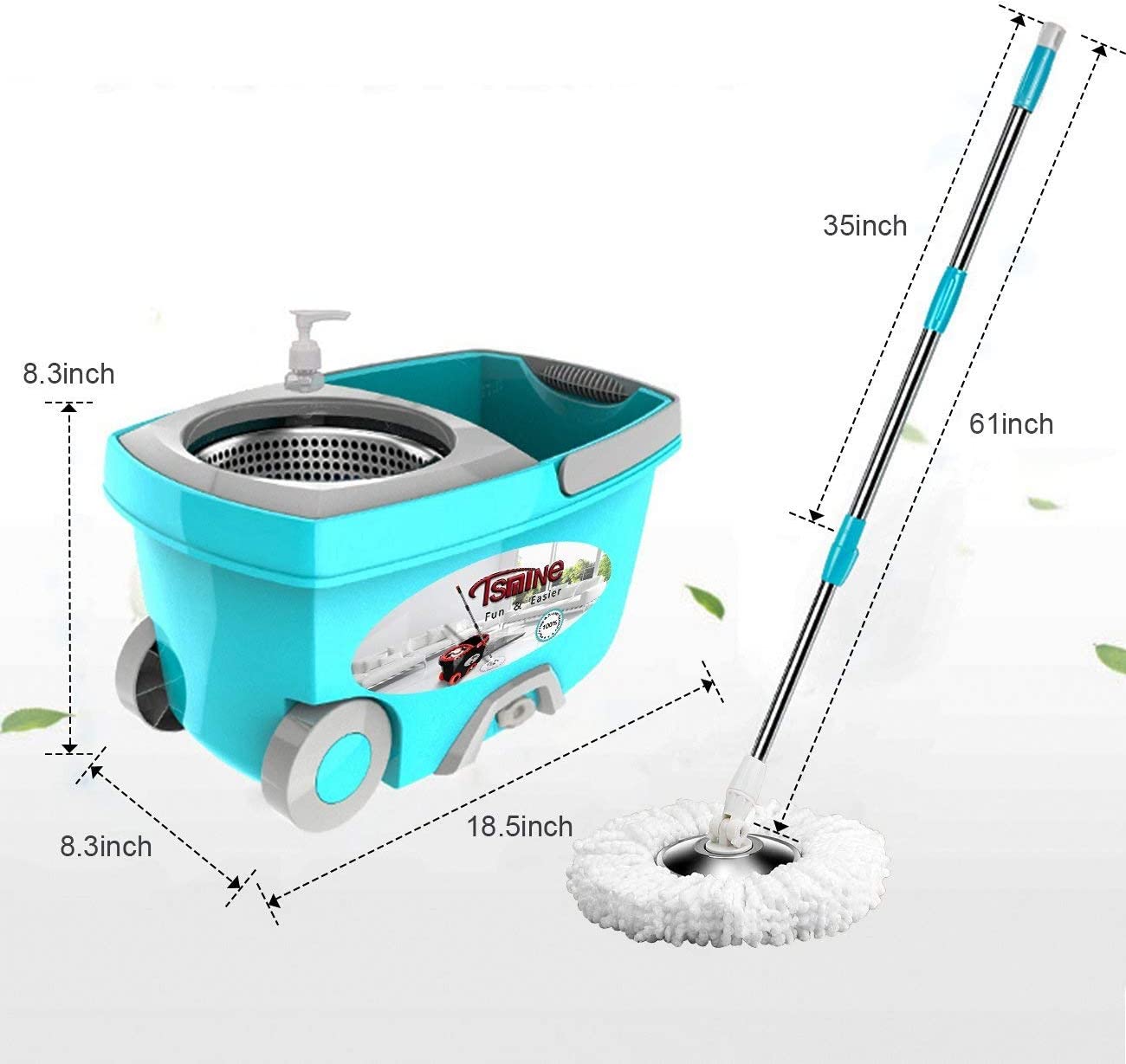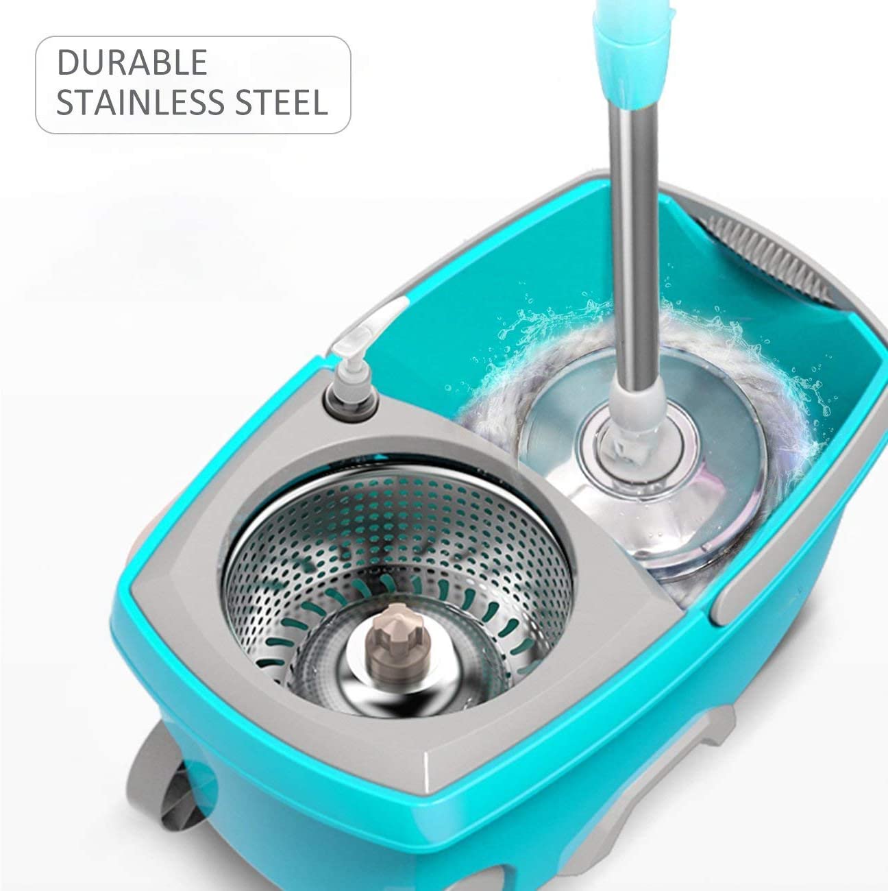 Tsmine Spin Mop Bucket System Stainless Steel Deluxe 360 Spinning Mop Bucket Floor Cleaning System with 6 Microfiber Replacement Head Refills.61″Extended Handle. 2x Wheel for Home Cleaning - MINT