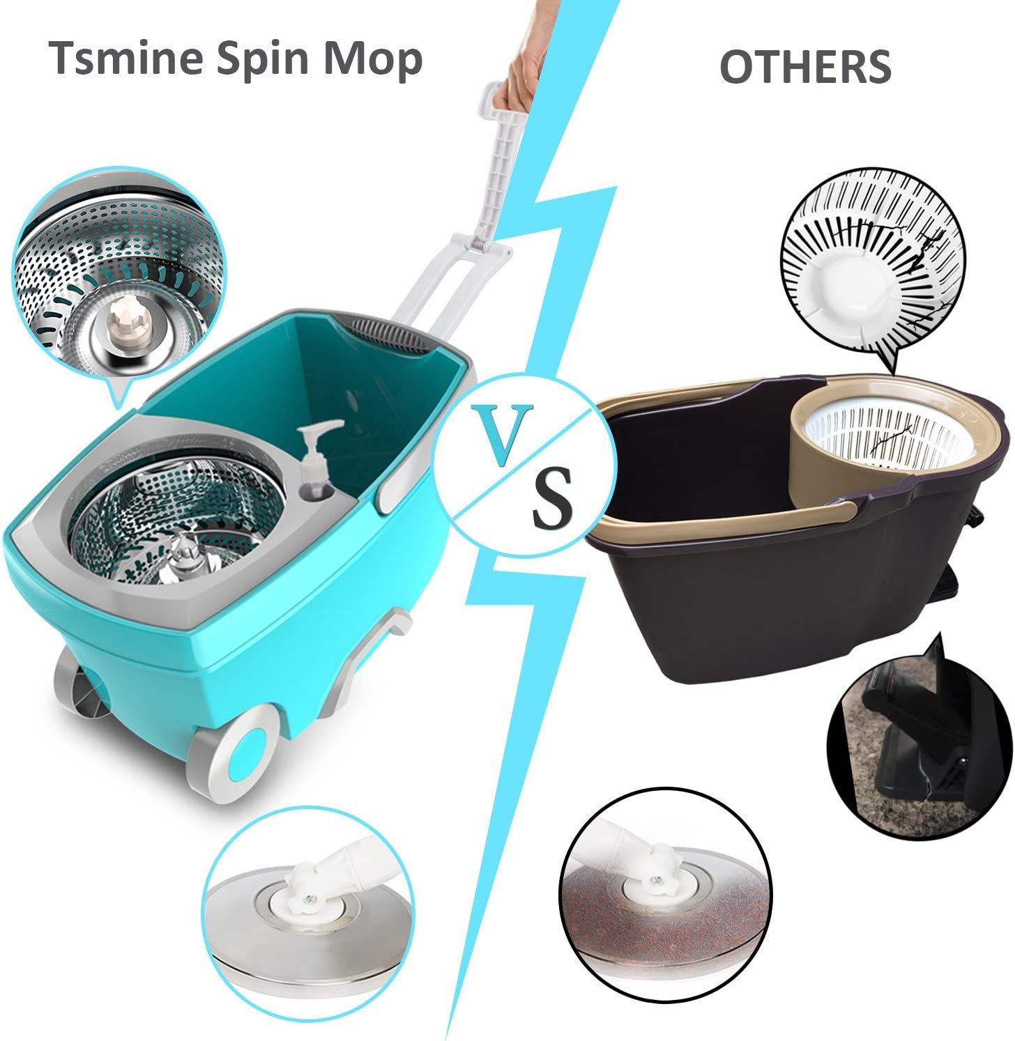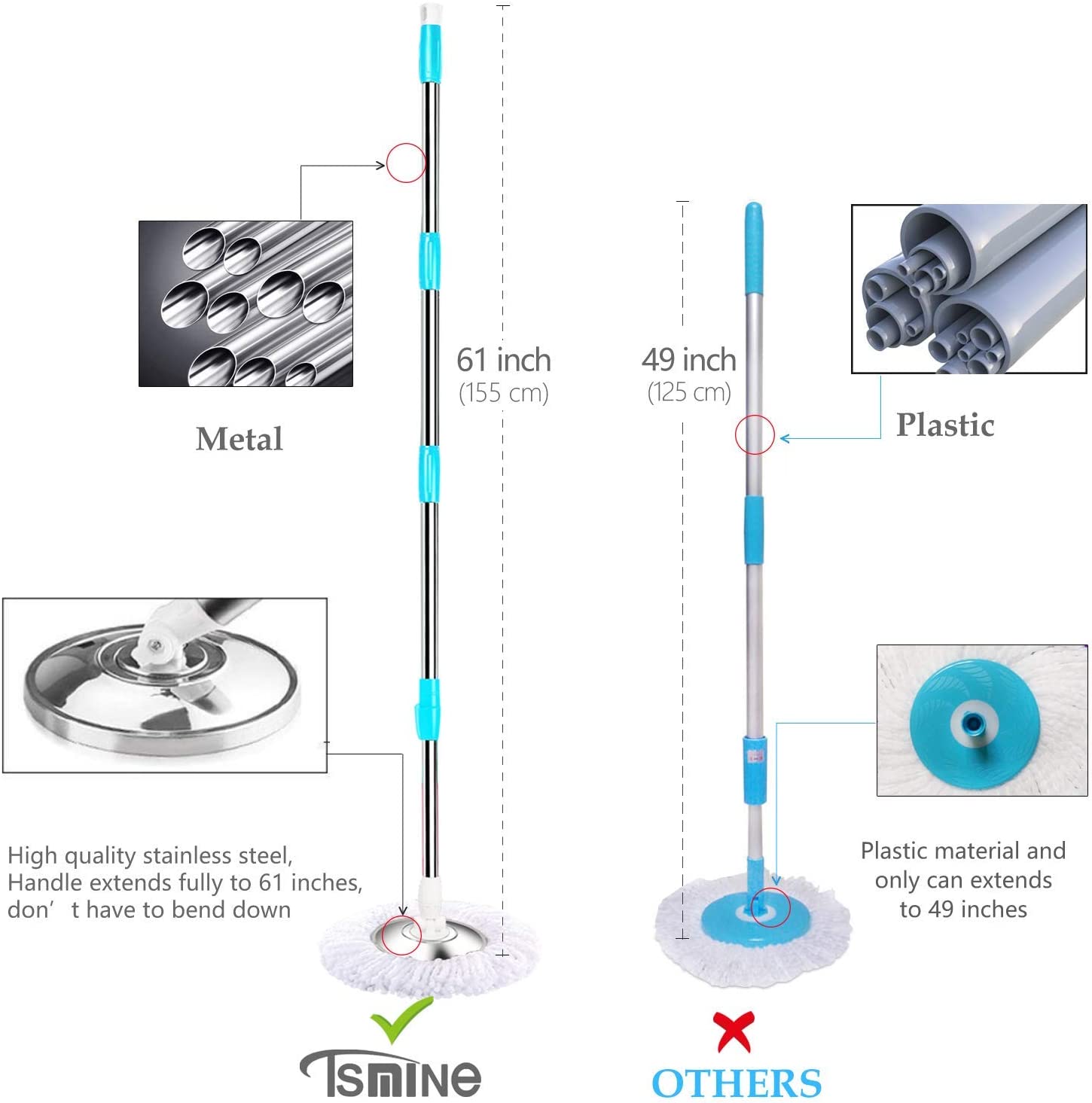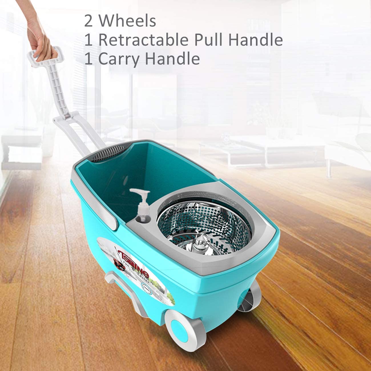 Tsmine Spin Mop Bucket System Stainless Steel Deluxe 360 Spinning Mop Bucket Floor Cleaning System with 6 Microfiber Replacement Head Refills.61″Extended Handle. 2x Wheel for Home Cleaning - MINT