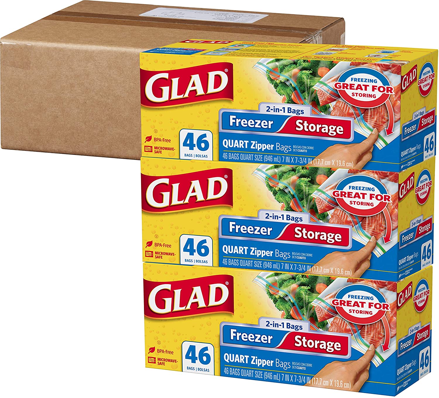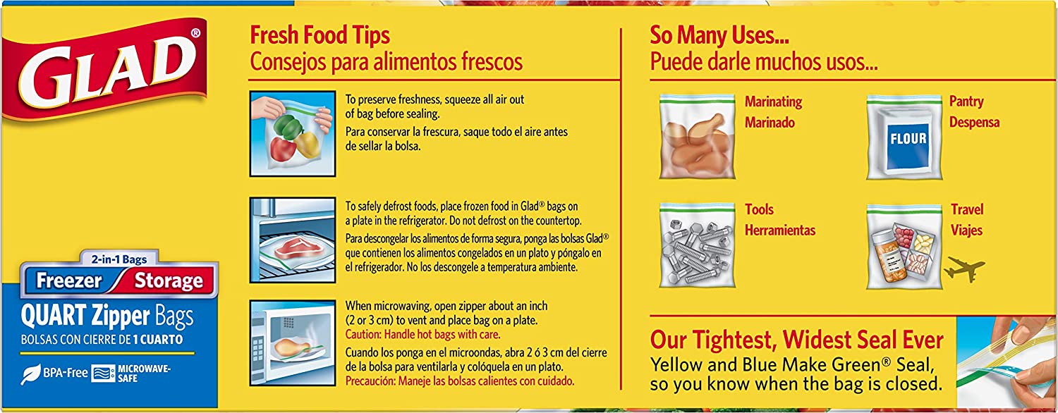 Glad Food Storage and Freezer 2 in 1 Zipper Bags - Quart Size - 46 Ct 3 Pack