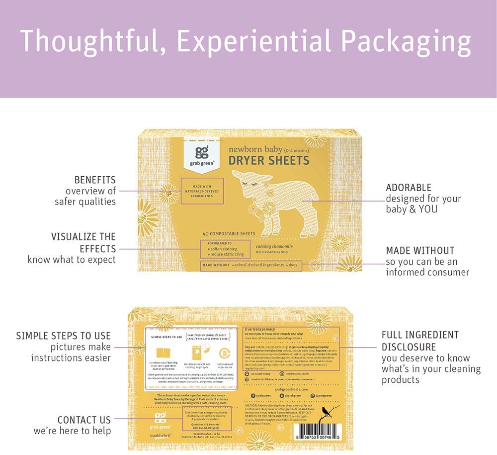 Grab Green Natural Newborn Baby Laundry Dryer Sheets. Essential Oils. 3ct