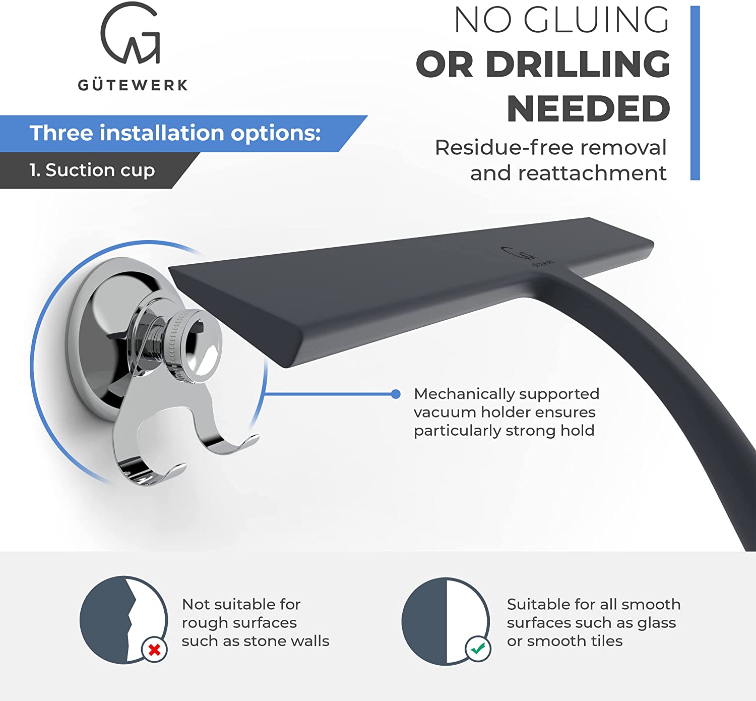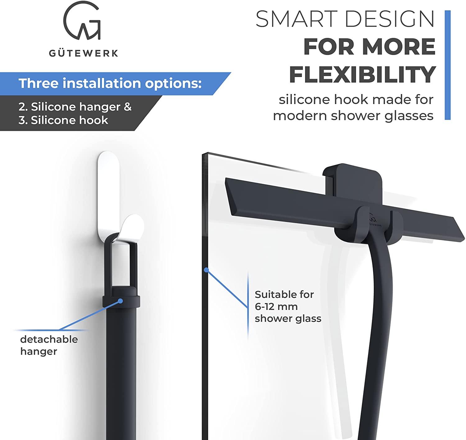GÜTEWERK Shower Squeegee Black 11 in - incl. Chrome Suction Cup Hook