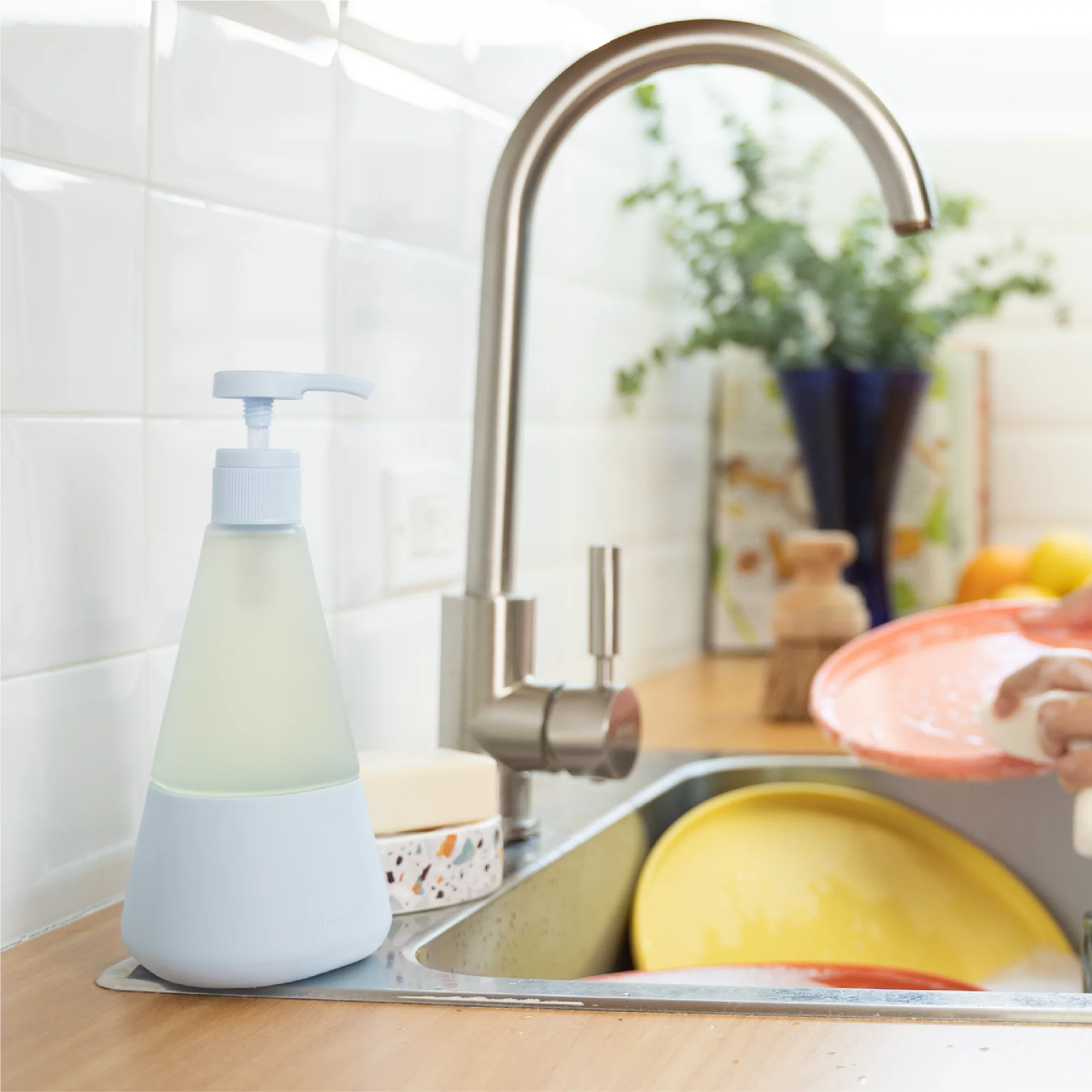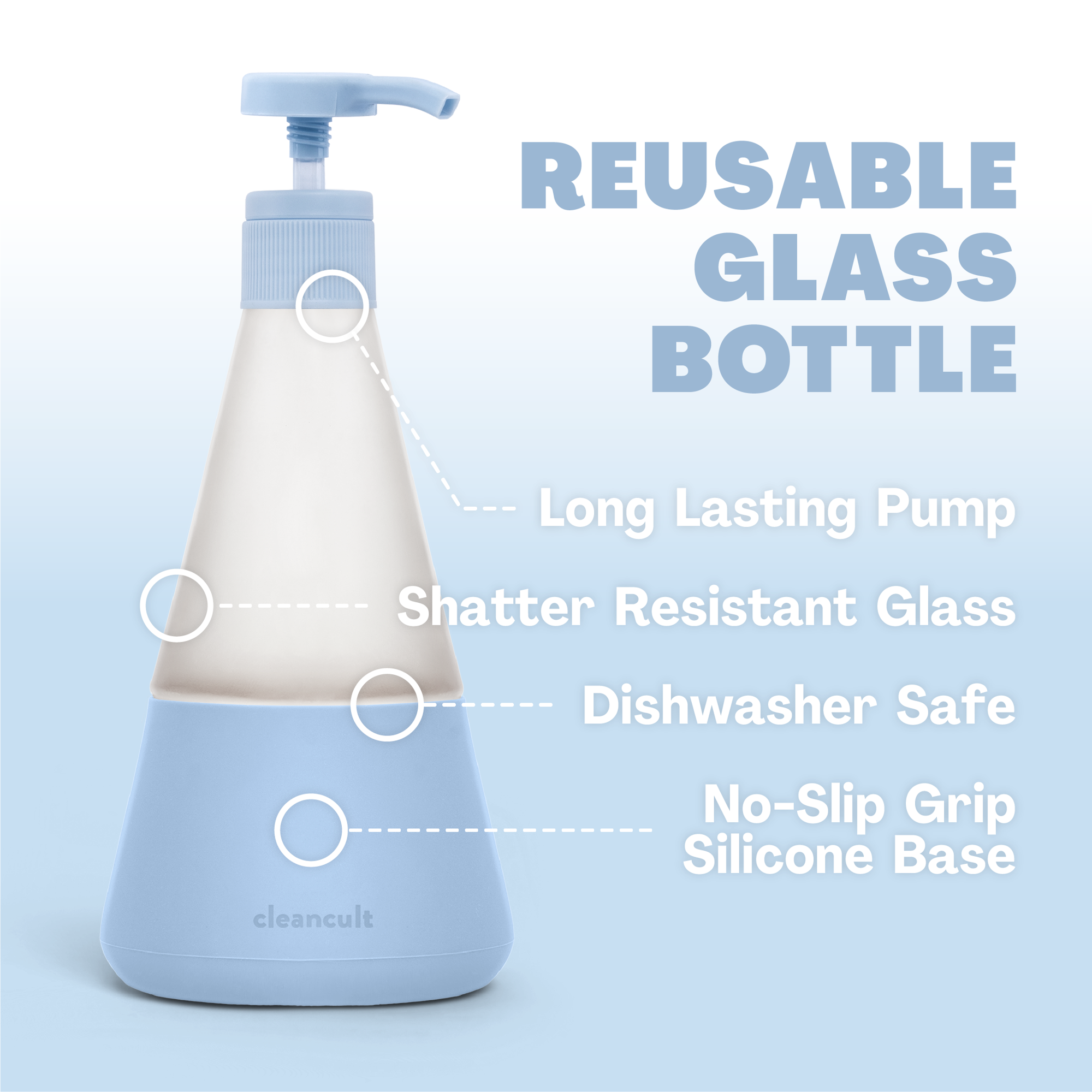 Cleancult Dish Soap Dispenser with Pump. Refillable Glass 14 oz Container. Shatter Resistant. Liquid Dishwashing Detergent. Non-Slip Grip. Matte Clear Frosted Finish. Kitchen Sink. 2 Pack - Periwinkle