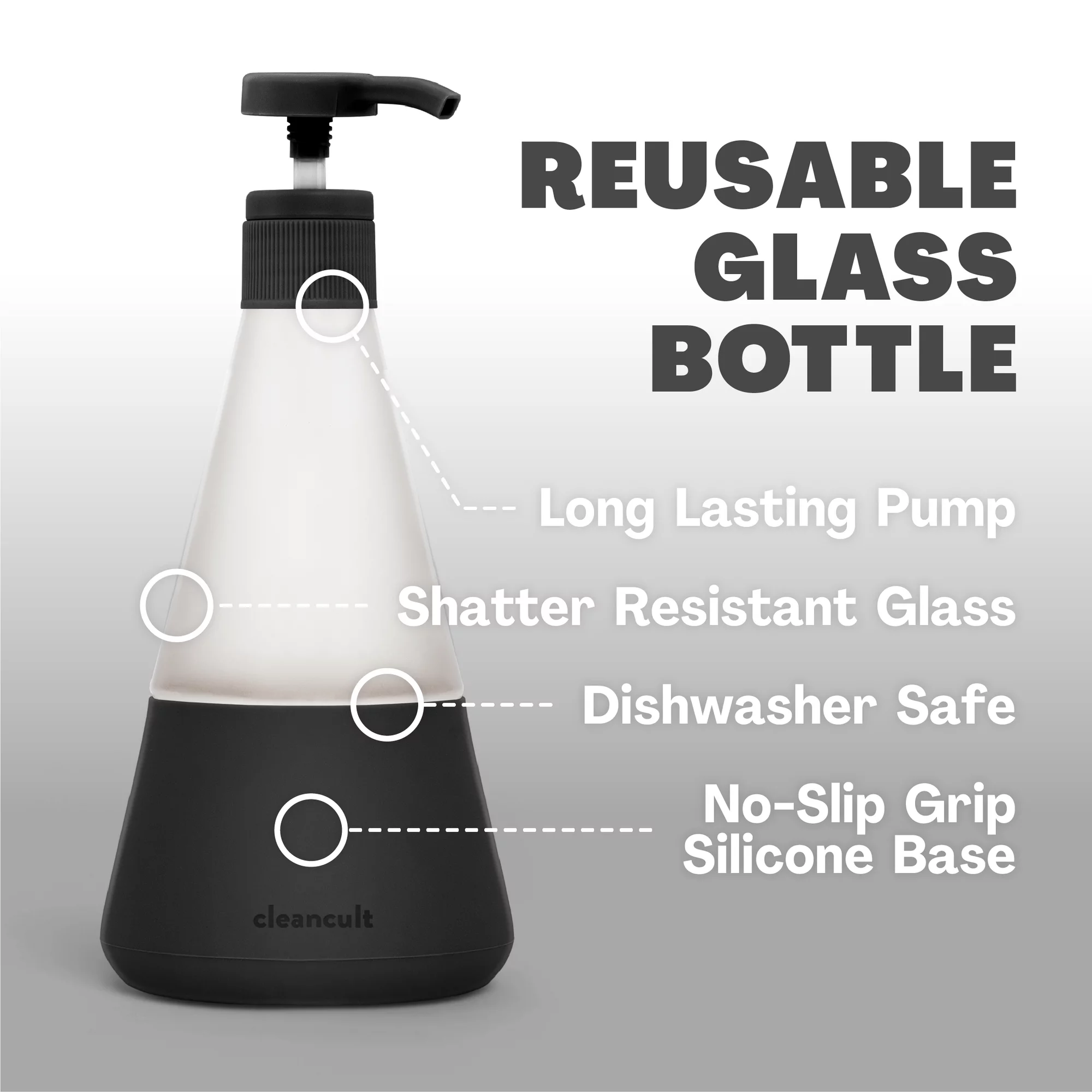 Cleancult Dish Soap Dispenser with Pump. Refillable Glass 14 oz Container. Shatter Resistant. Liquid Dishwashing Detergent. Non-Slip Grip. Matte Clear Frosted Finish. Kitchen Sink. 2 Pack - Charcoal