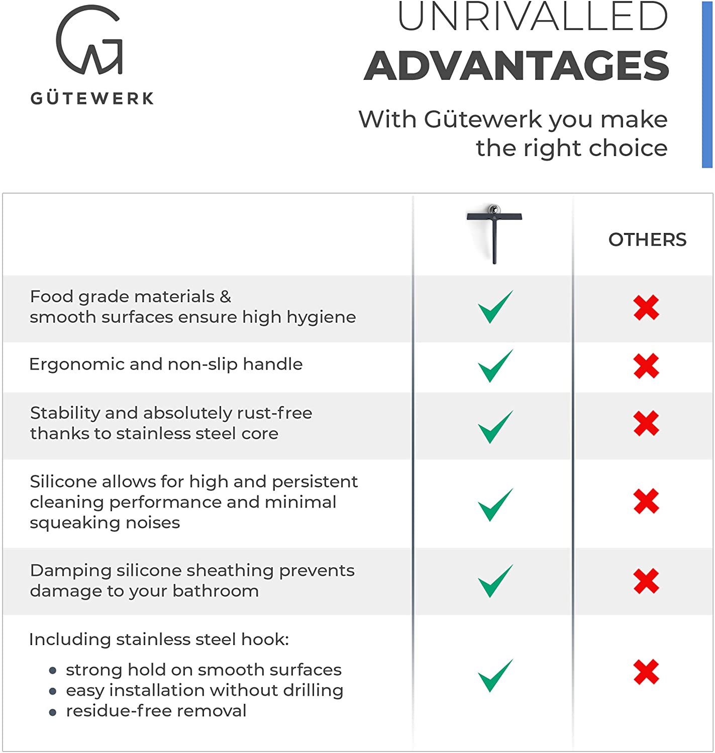 GÜTEWERK Shower Squeegee Black 11 in - incl. Chrome Suction Cup Hook