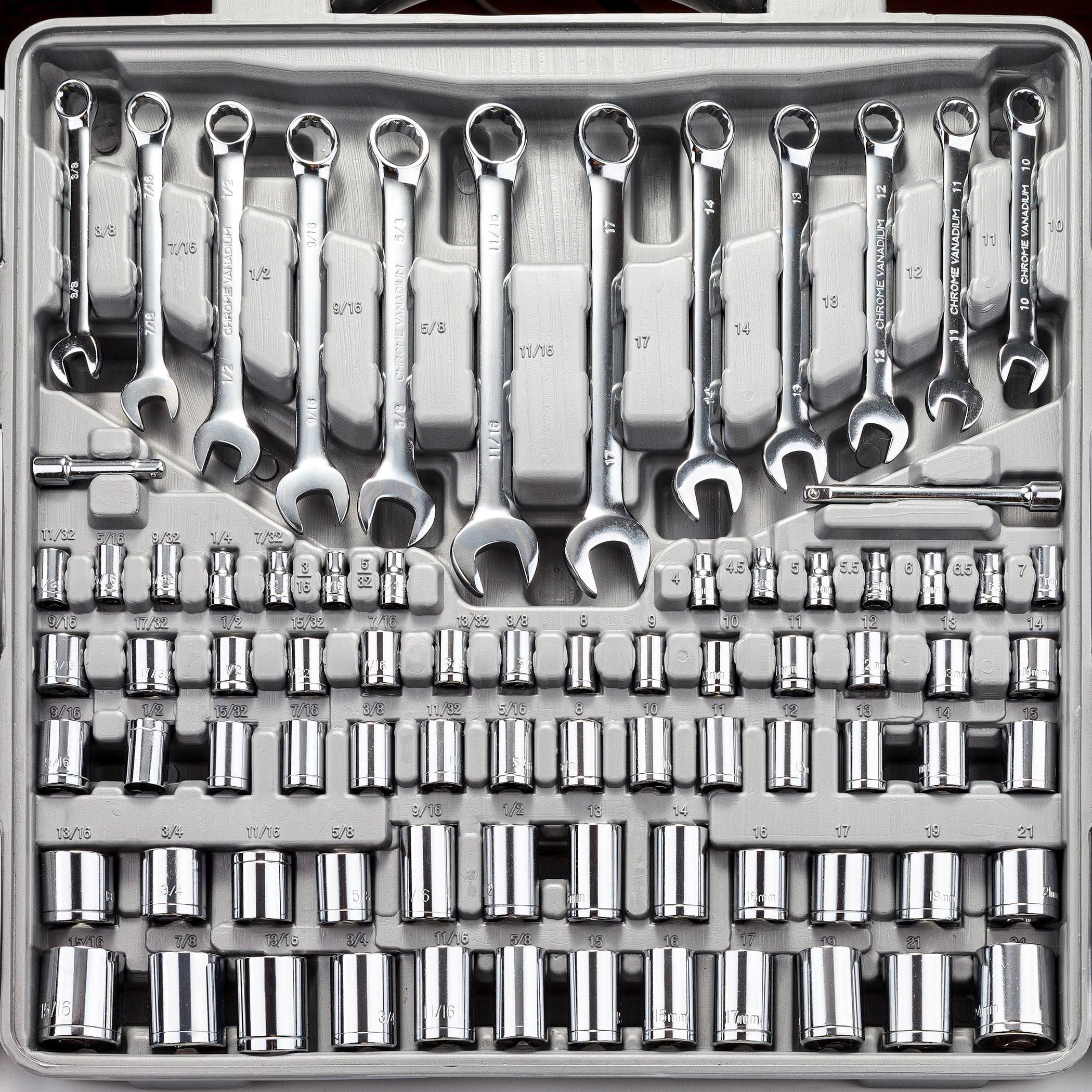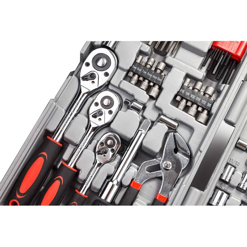 Cartman 205 Piece Tool Set Ratchet Wrench with Sockets Kit in Plastic Toolbox Red