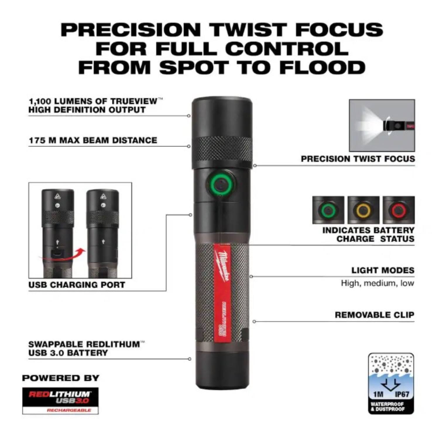 Milwaukee 2161-21 USB Rechargeable 1100L Twist Focus Flashlight
