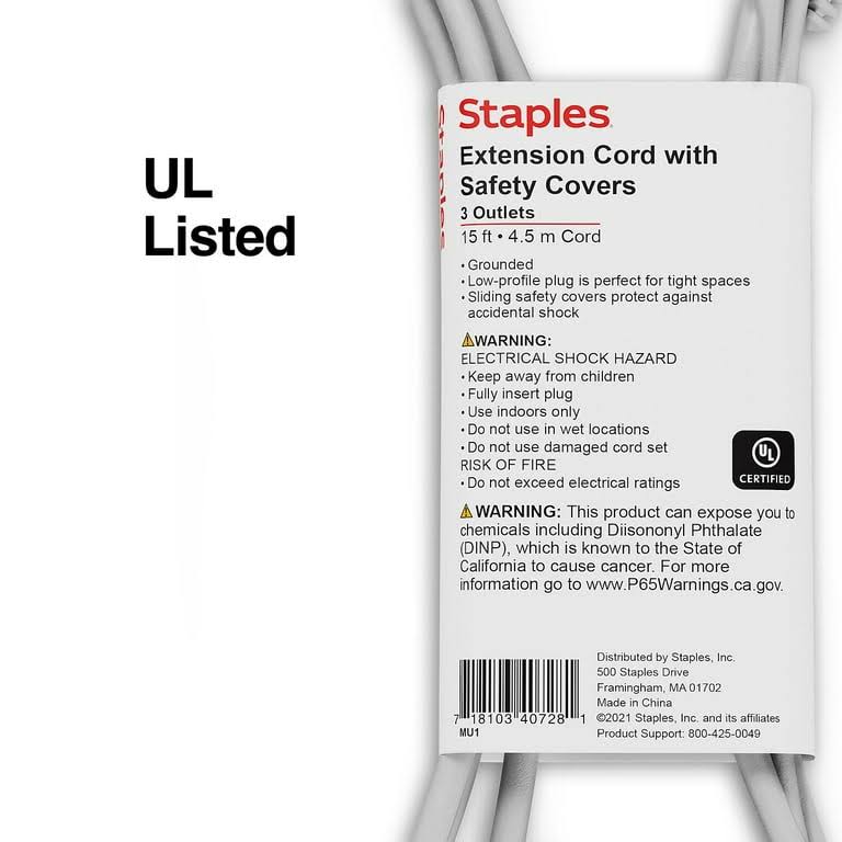 Staples 15' Extension Cord 3-Outlet with Safety Covers, Gray (22130)