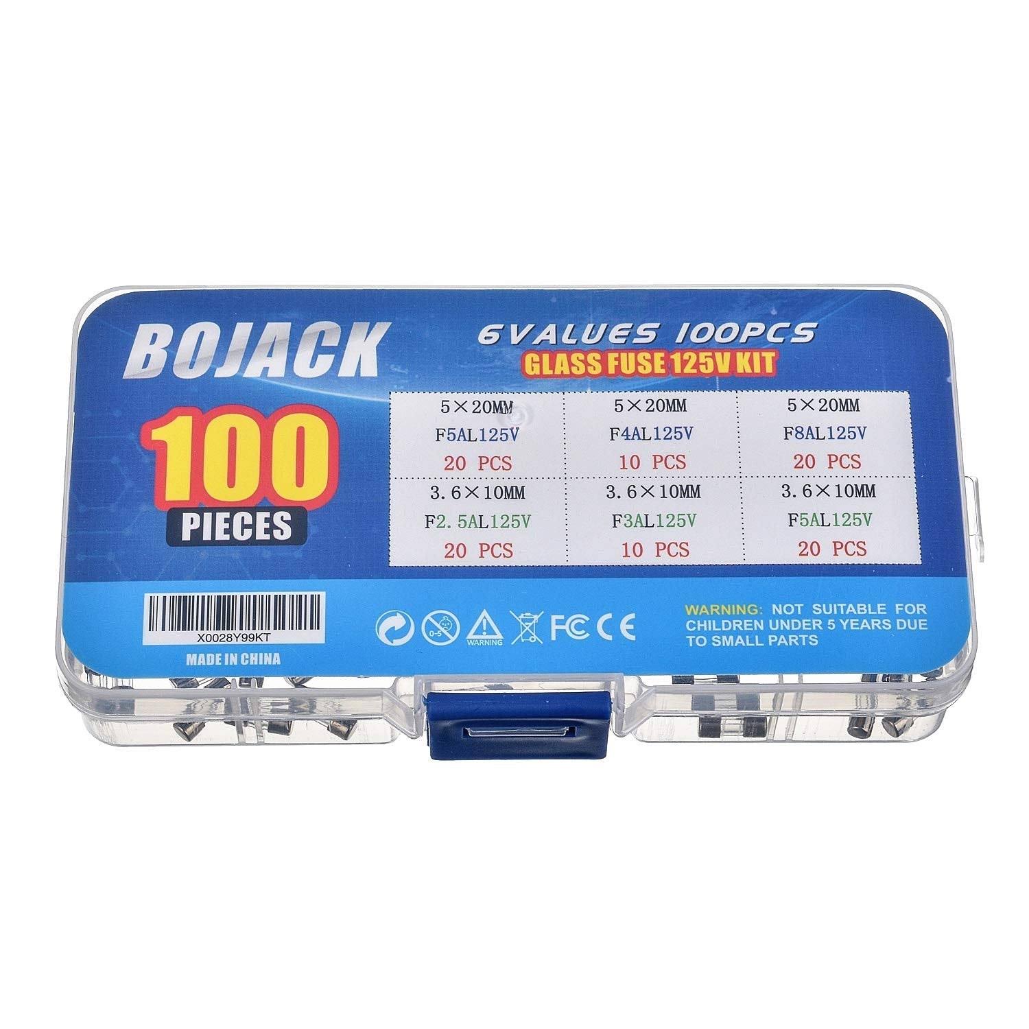 Bojack 6 Values 100 Pcs Fast-Blow Glass Fuses Assortment Kit 3.6x10mm Mini Fuse 125V 2.5 3 5A and 5x20mm 125V 4 5 8A Amp Packag