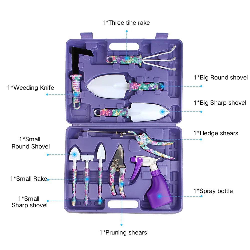 Garden Tools Set, JUMPHIGH 10 Pieces Gardening Tools with Purple Floral Print, Ergonomic Handle Trowel Rake Weeder Pruner Shears Sprayer, Garden