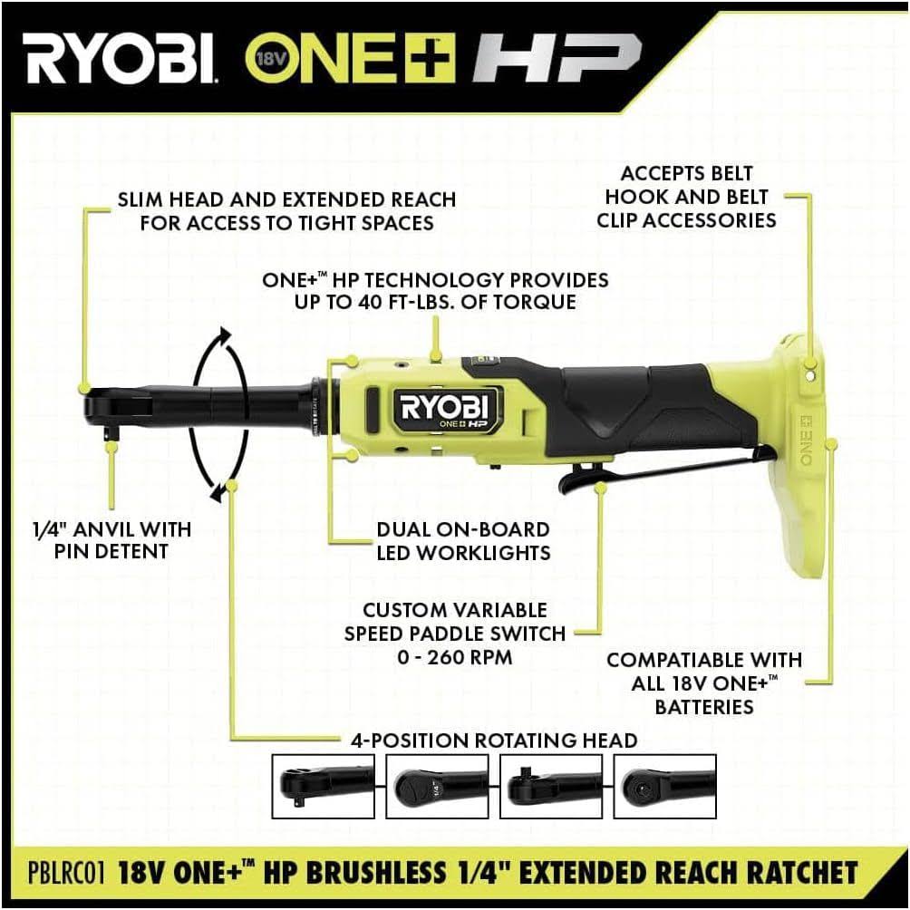 Ryobi PBLRC01B One+ HP 18V Brushless Cordless 1/4 in. Extended Reach Ratchet (Tool Only)