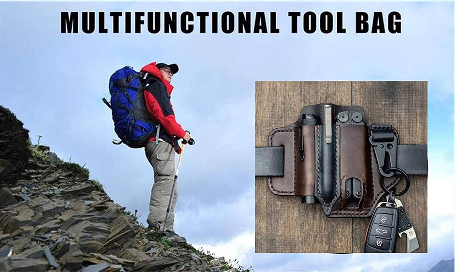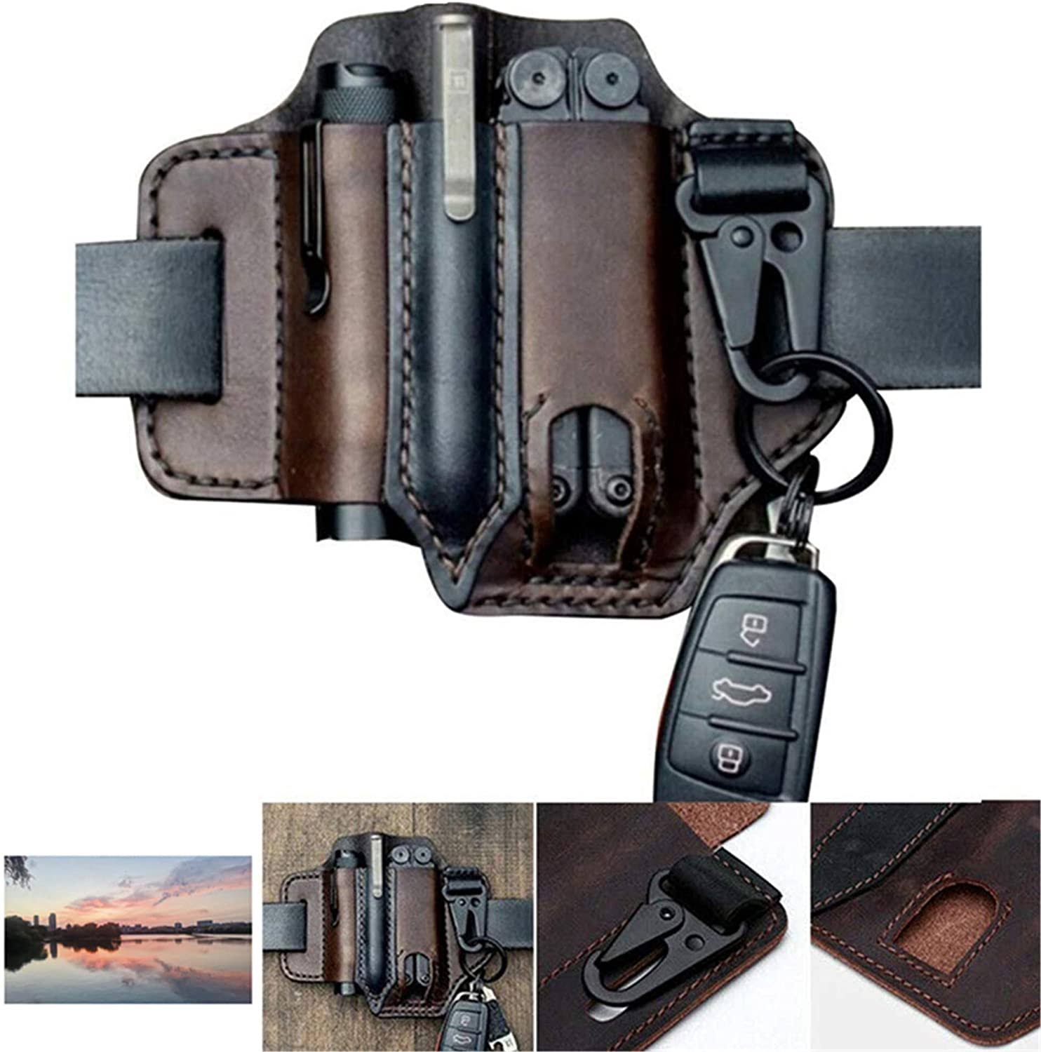 WallDecalsAndArt Multitool Sheath for Belt, Leather EDC Pocket Organizer for Men, Leatherman Sheath with Pen Holder, Key Fob, Flashlight Sheath, EDC