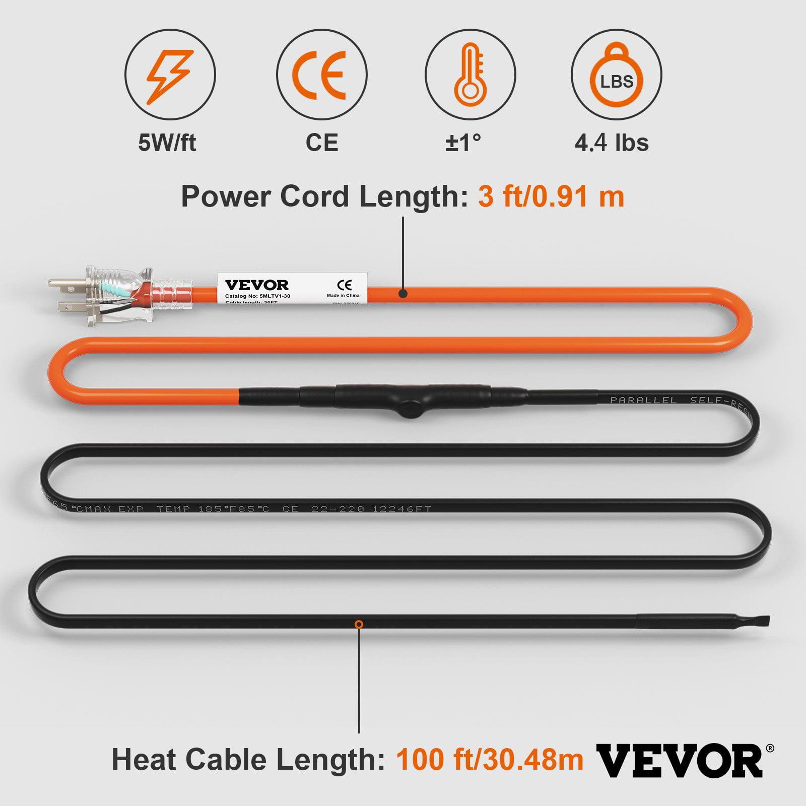 VEVOR Self-Regulating Pipe Heating Cable, 100-Feet 5W/ft Heat Tape for Pipes Freeze Protection, Protects PVC Hose, Metal and Plastic Pipe from