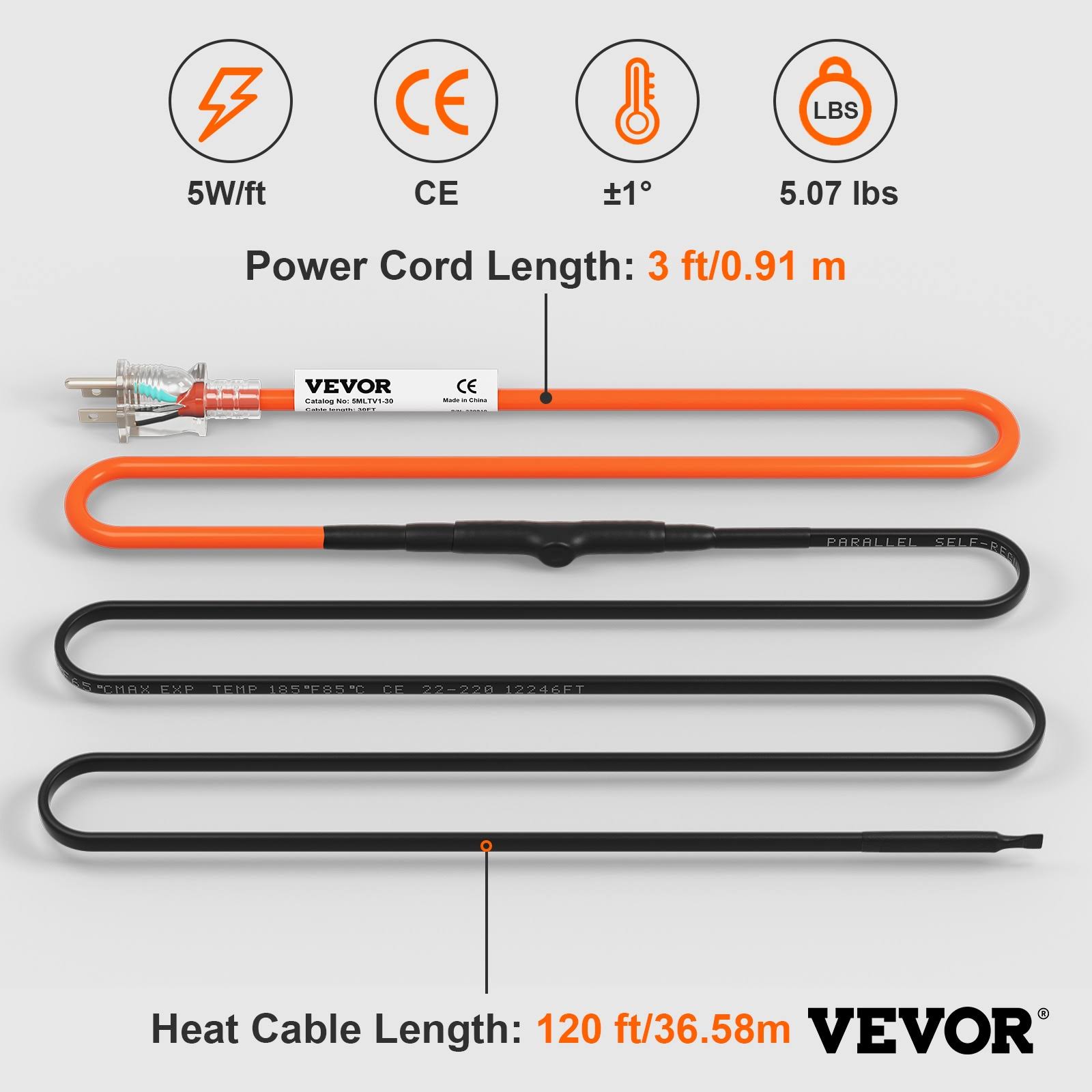 VEVOR Self-Regulating Pipe Heating Cable, 120-Feet 5W/ft Heat Tape for Pipes Freeze Protection, Protects PVC Hose, Metal and Plastic Pipe from