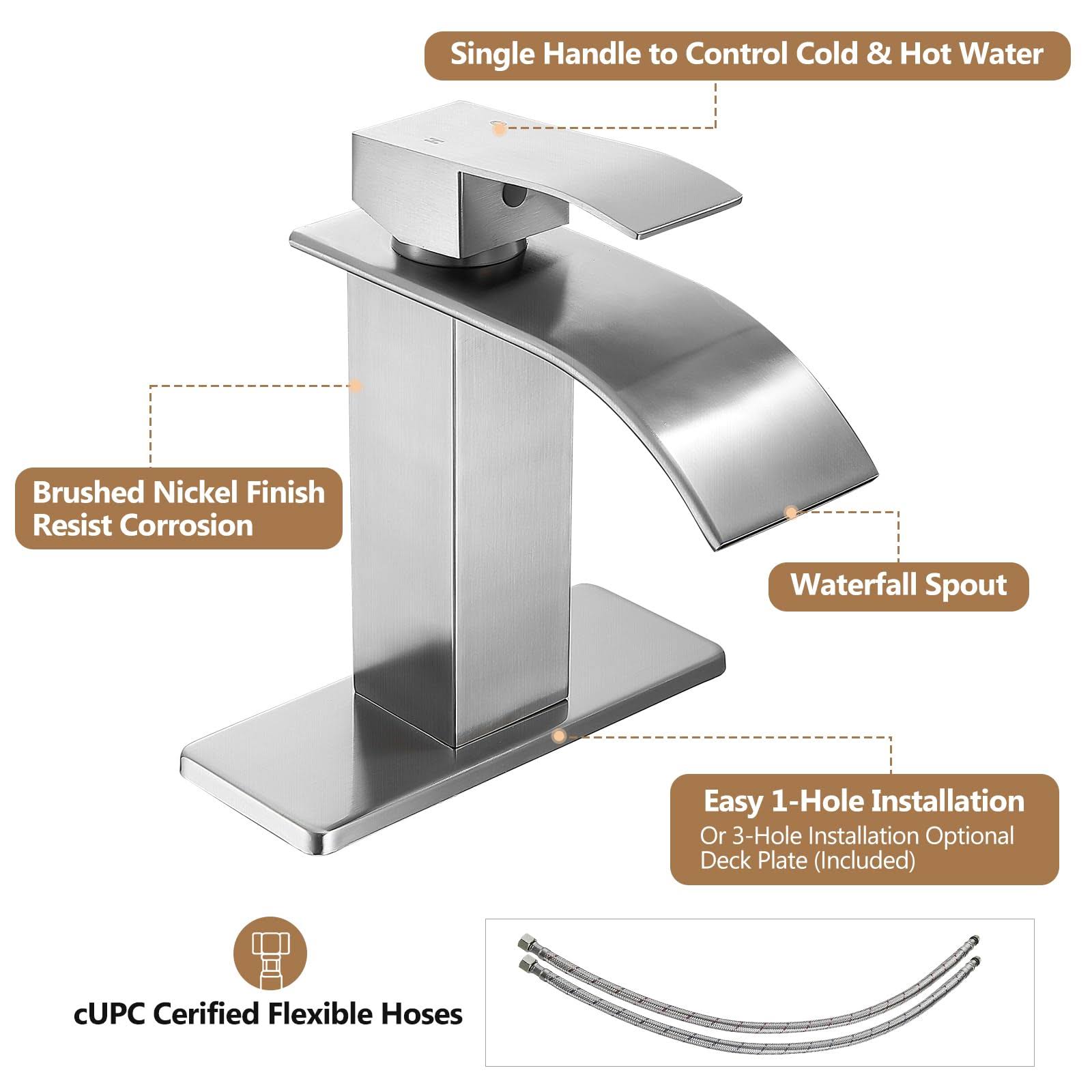 FRANSITON Brushed Nickel Waterfall Bathroom Faucet Lavatory Single Handle 1 or 3 Hole Bathroom Sink Faucet Washbasin Faucet with Deck and Pop-Up