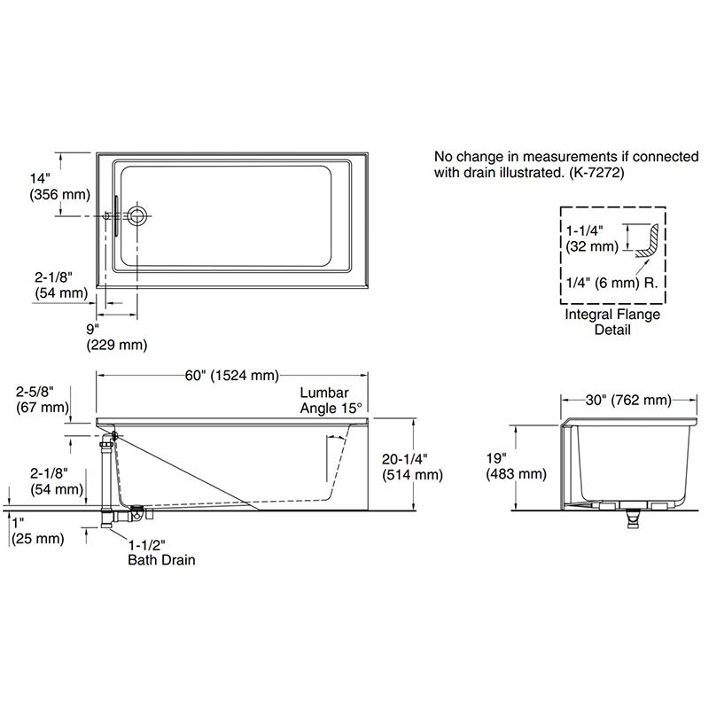 Kohler K-20201-LA-0 White Underscore 60" x 30" Alcove Bath with Integral Apron, Integral Flange, and Left-Hand Drain