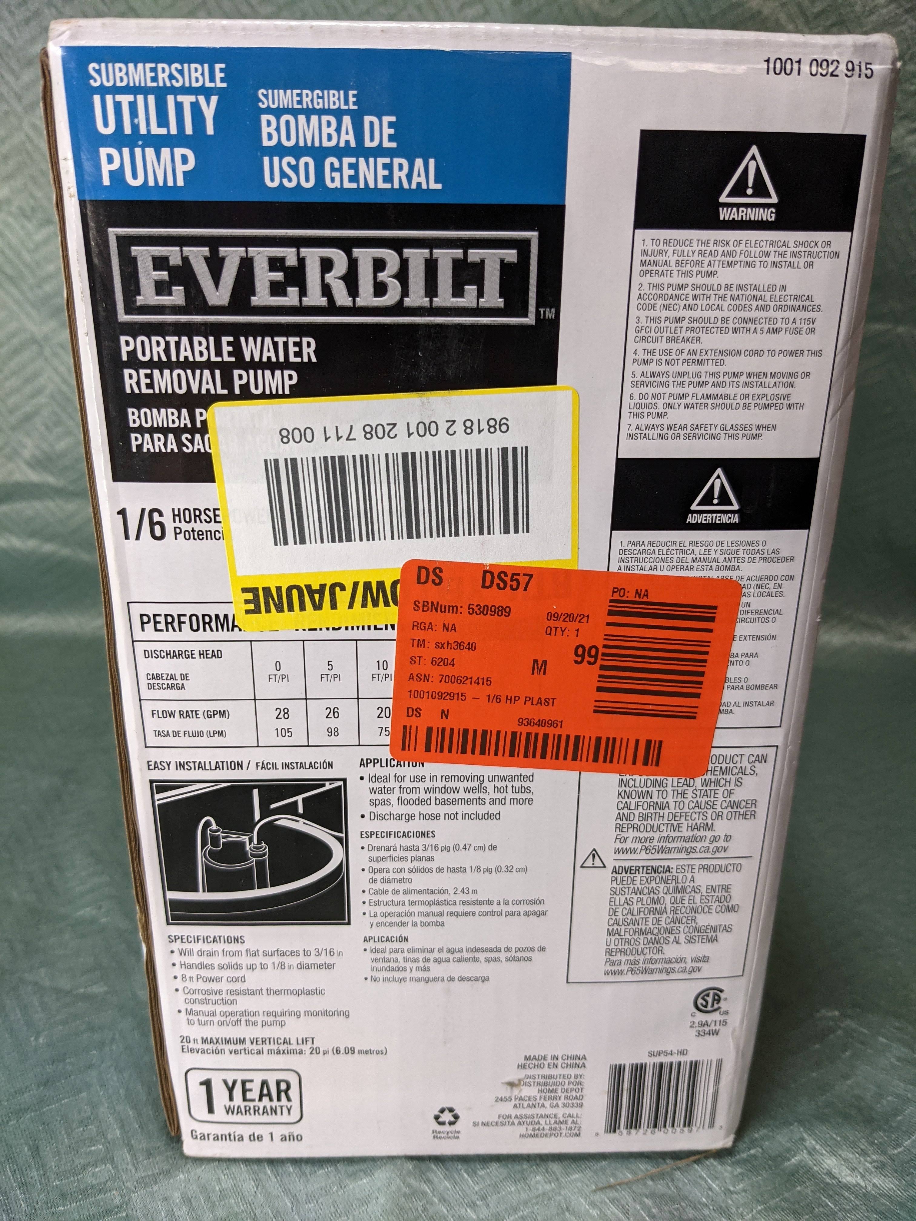 Everbilt SUP54-HD 1/6 HP Plastic Submersible Utility Pump