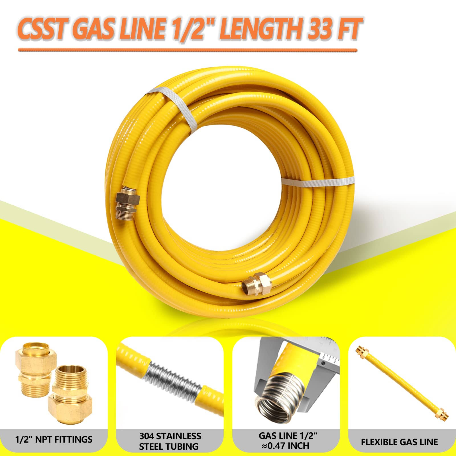 Grehitk 33ft 1/2'' Flexible GAS Line, CSST Corrugated Stainless Steel Tubing Pipe Kit, Natural GAS Line Propane Pipe Conversion Kit Grill Hose with 2
