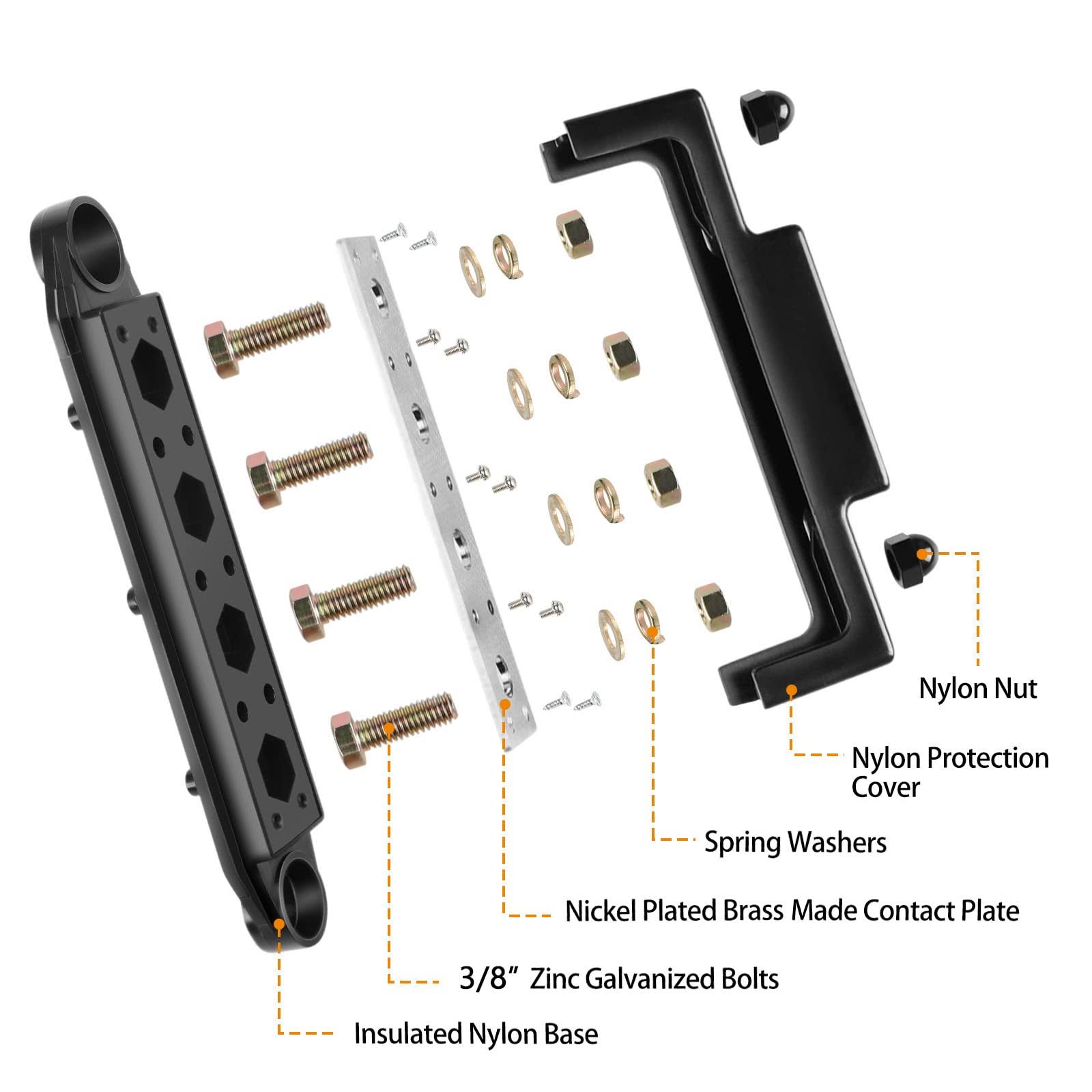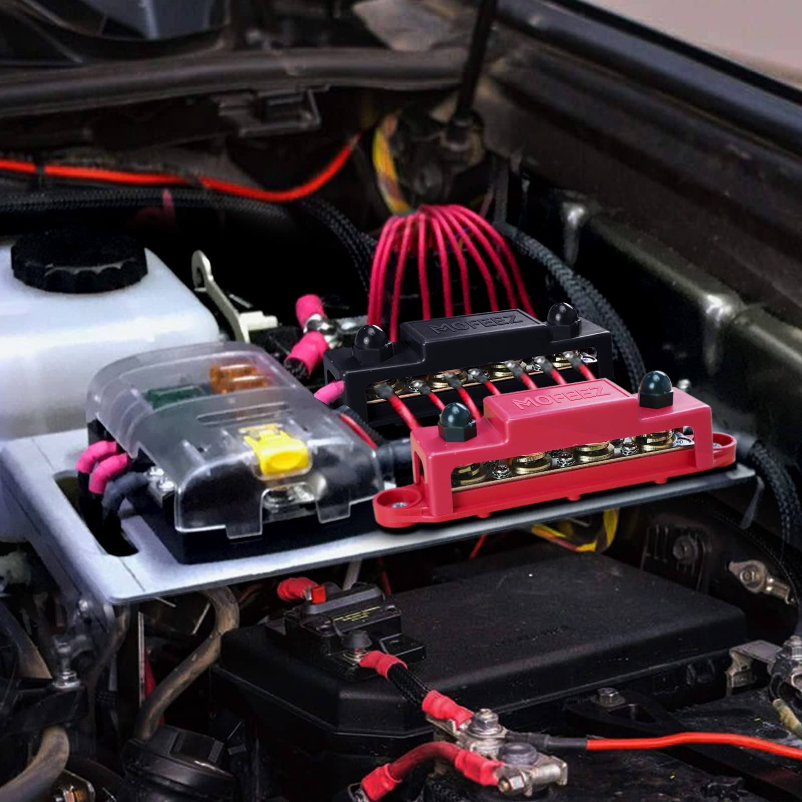 Mofeez Power Distribution Block Bus Bar, 4 x 38 Posts, 6 x #8 Screws terminals, Max 48V 250A (Pair, Red & Black)