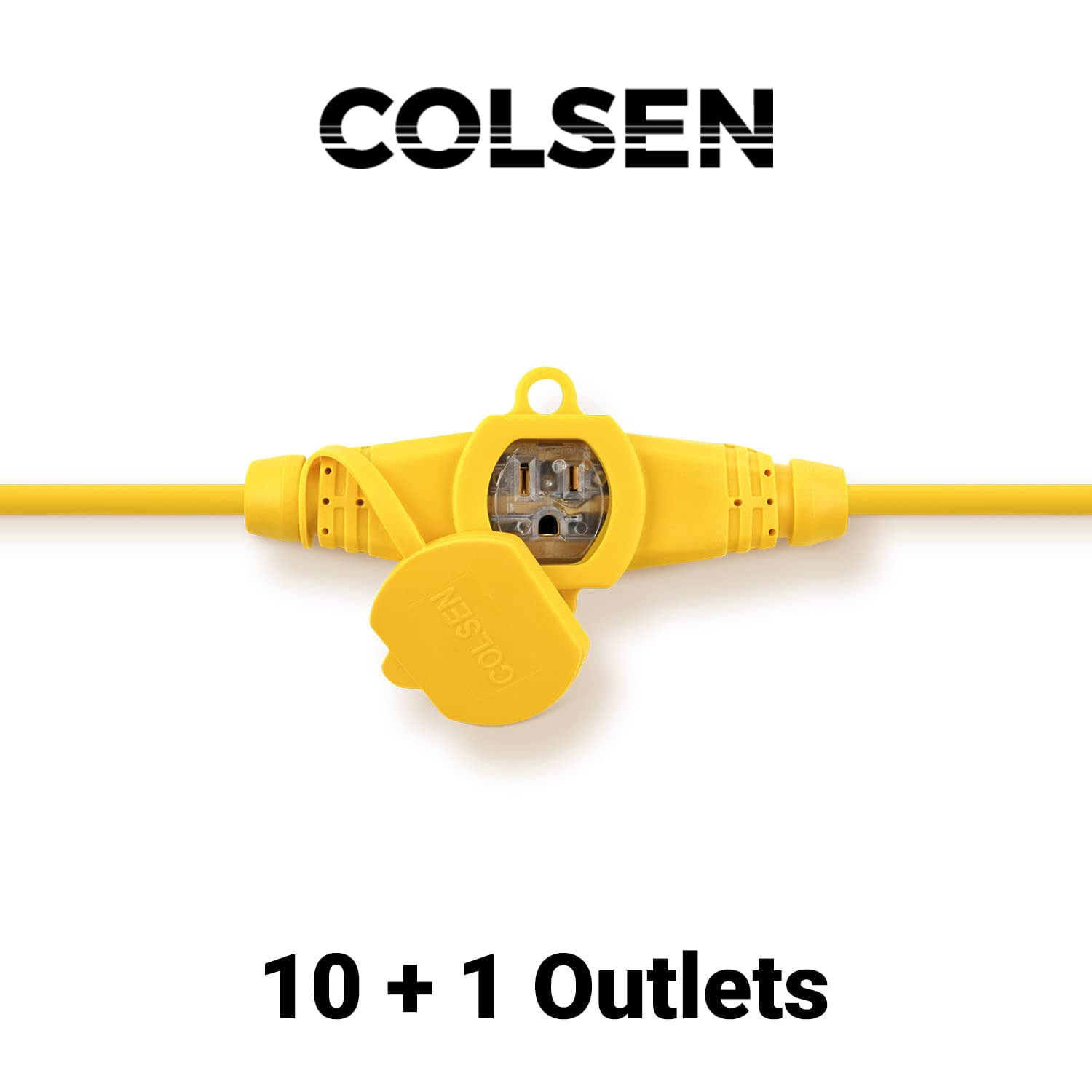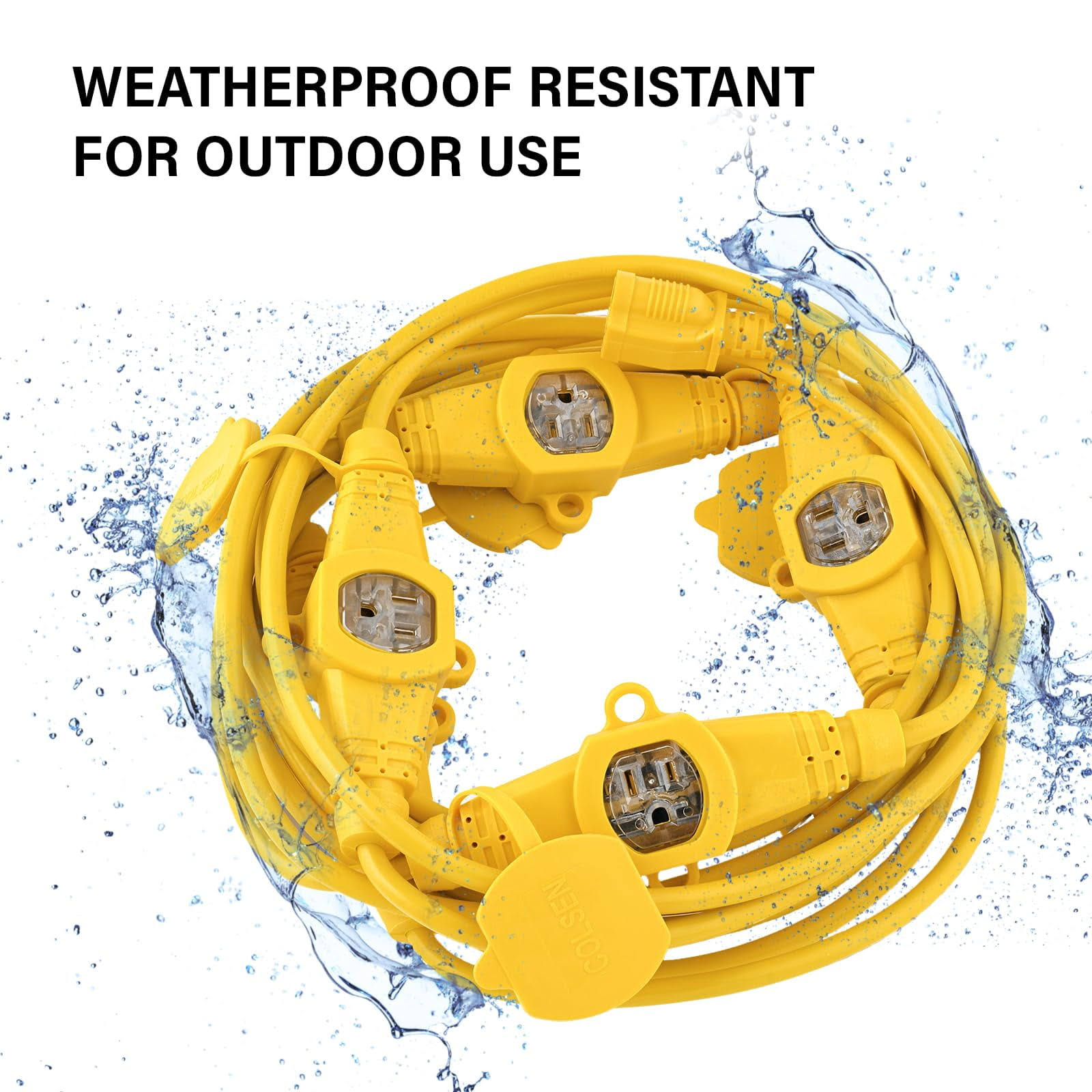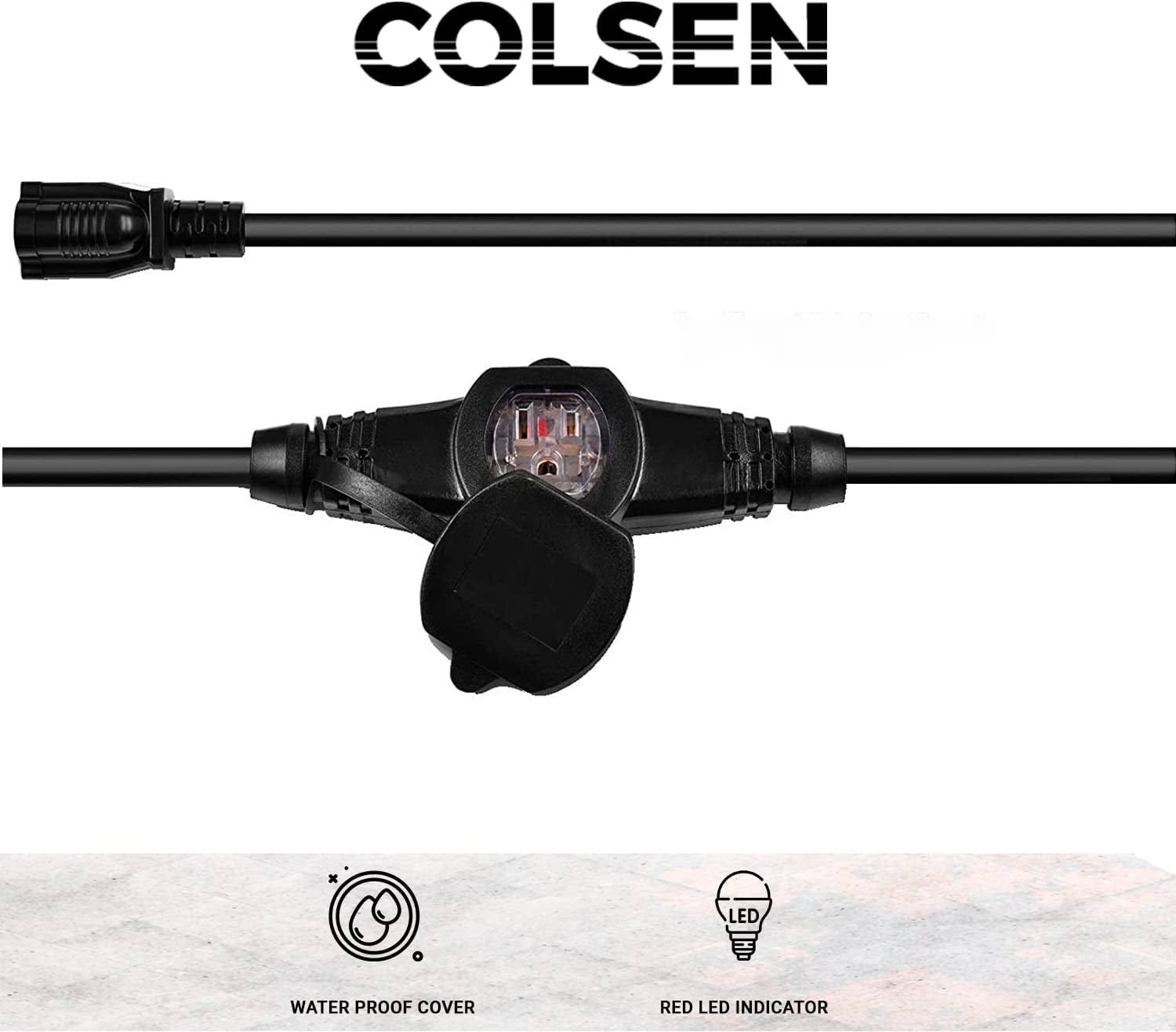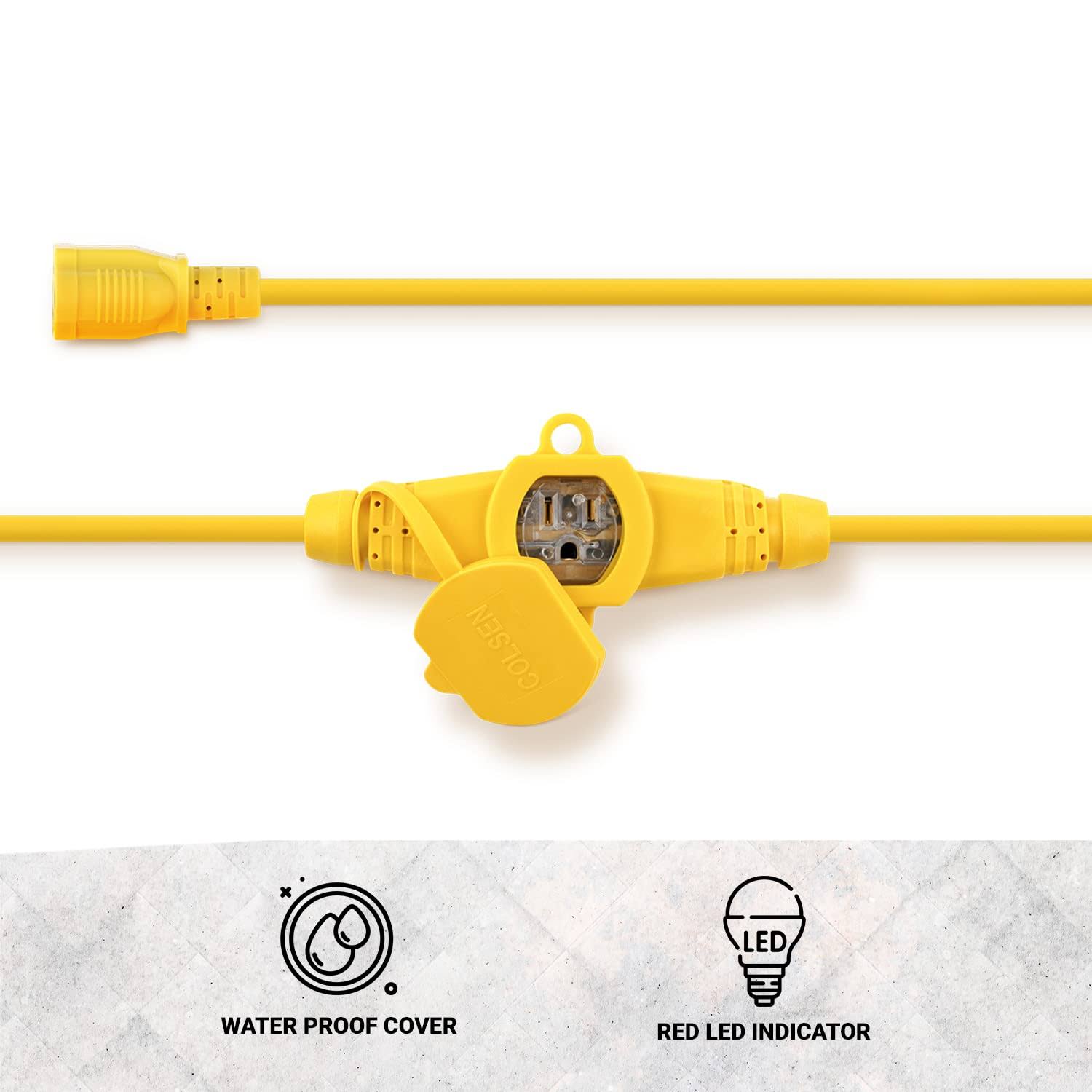 Colsen 50ft Yellow Power Extension Cord 3 Prong 6 NEMA 5-15R Female Socket- Red LED Indicator 14 Gauge SJTW Cable Male to Female Connector Stage